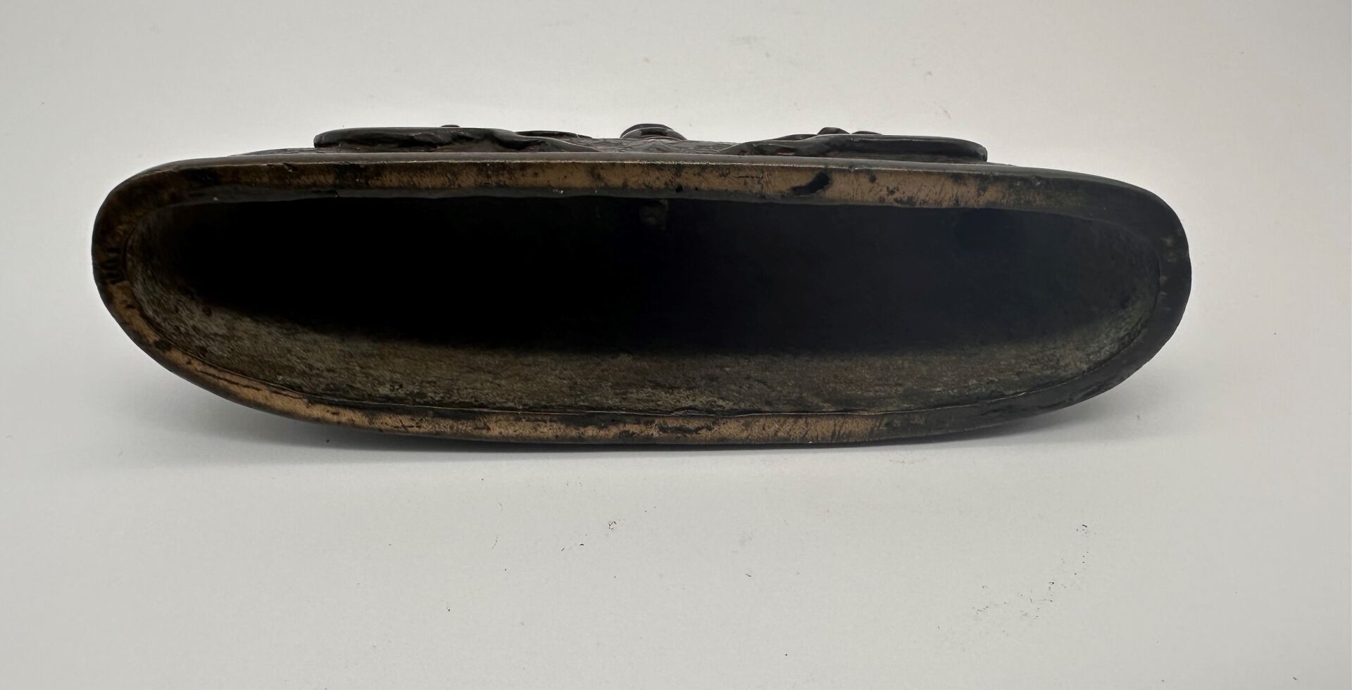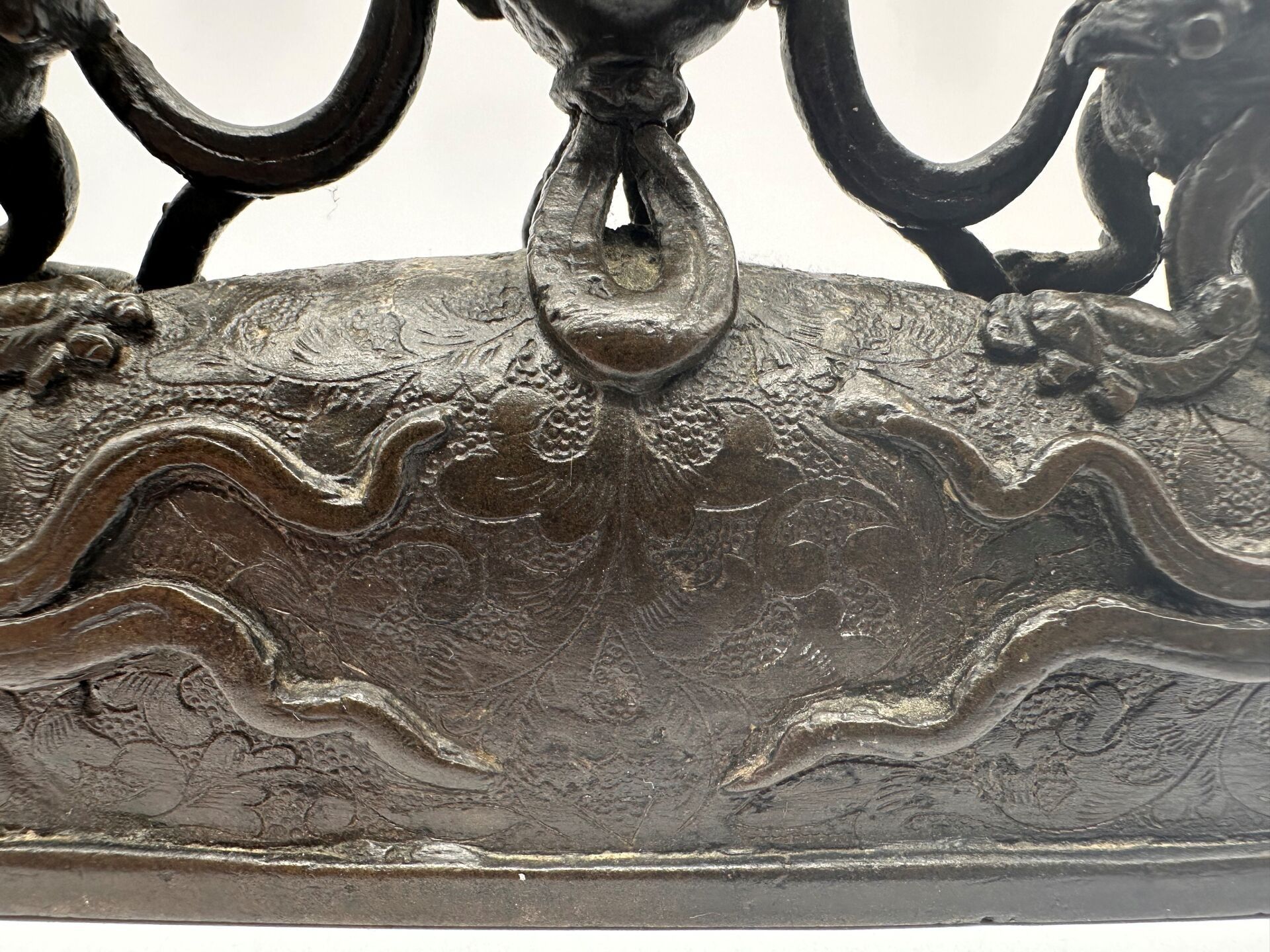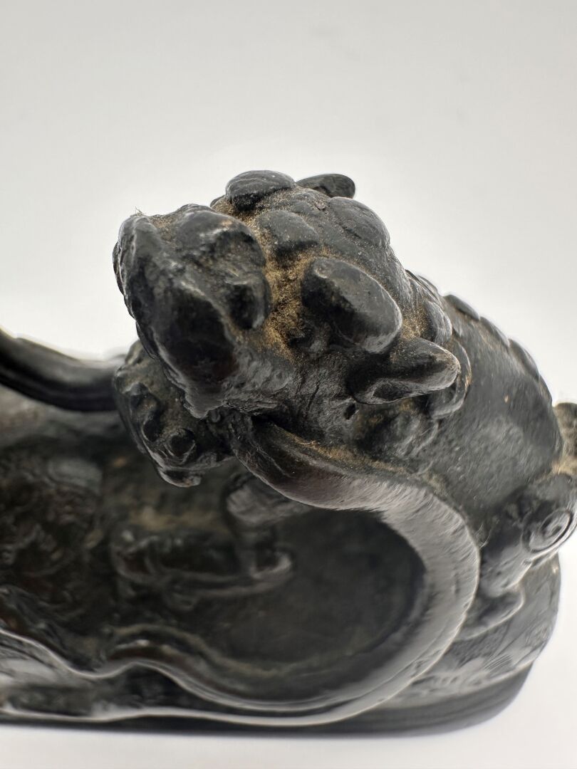Brown patina bronze brush rest depicting a pair of Fô dogs holding ribbons in their mouths surrounding the sacred jewel. The scene unfolds above flowers and foliage.