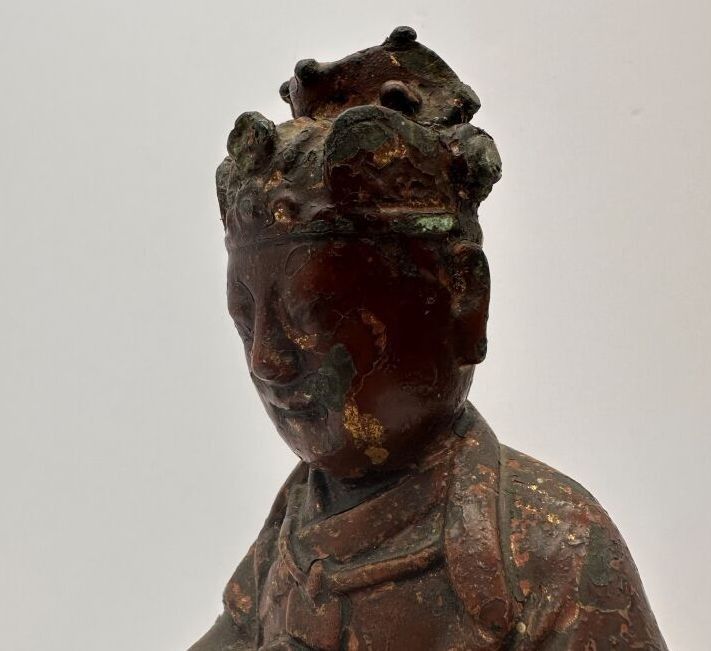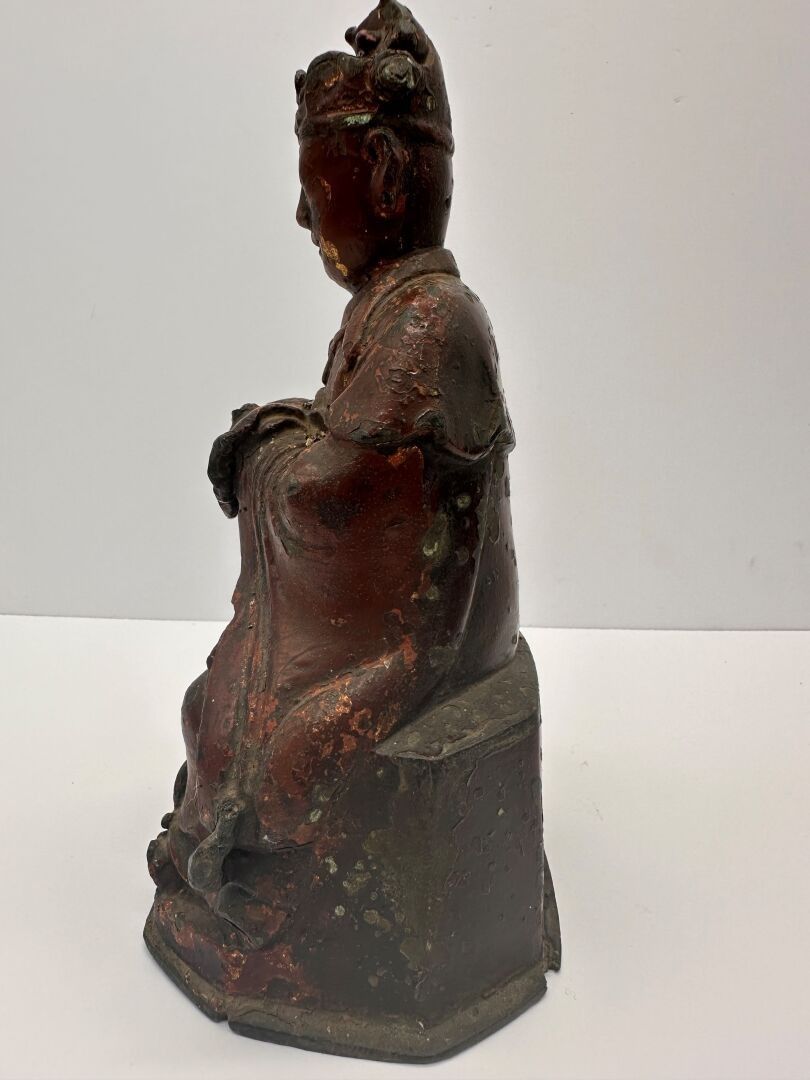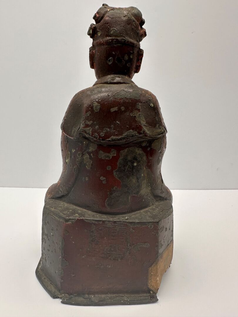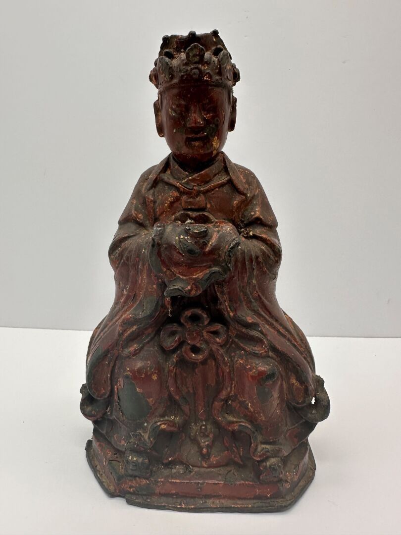 Antique red-brown lacquered and gilded bronze statuette representing the Jade Auguste, seated in majesty in traditional dress.