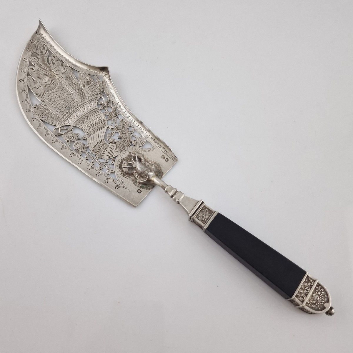 A pretty Restoration-period 950 Millièmes silver FISH PEN, the finely chased and openwork spatula decorated with a fish emerging from a cornucopia.