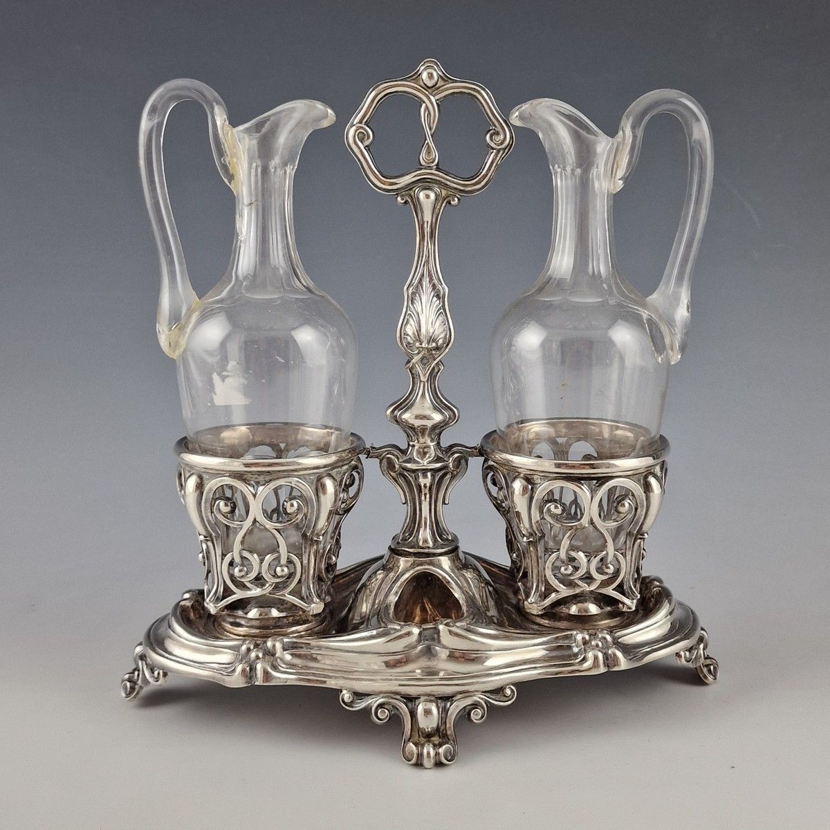 With two cut-edge white crystal cruets, their stoppers incomplete