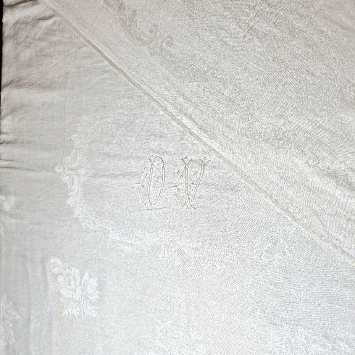 RECTANGULAR NAPPE in white cotton damask Circa 1900 with woven decoration of flowers and embroidered in bourdon stitch with a leafy white monogram DV in a leafy central cartouche