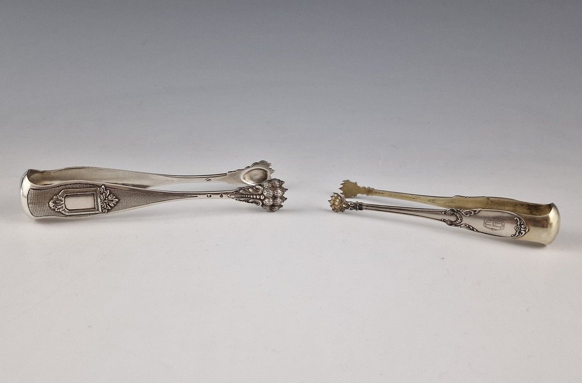 TWO SUGAR PISTOLS in Minerve 950 Millièmes silver Circa 1900, one decorated with foliate cartouches (unengraved) on a guilloché ground, the other partially vermeiled with an Empire décor of cartouches engraved with the monogram GB.