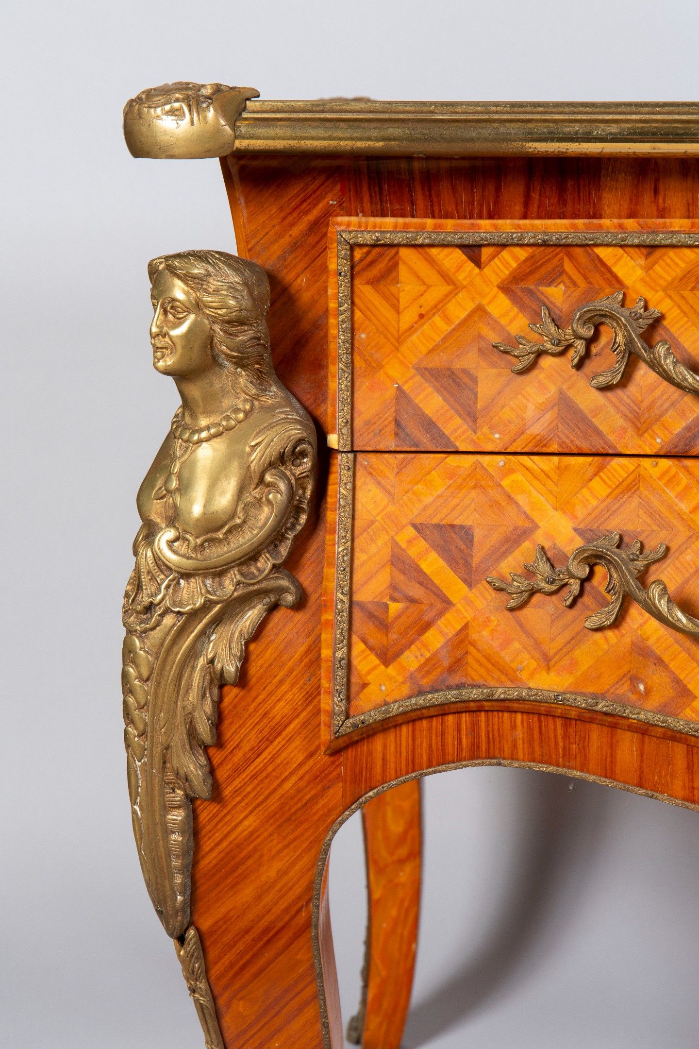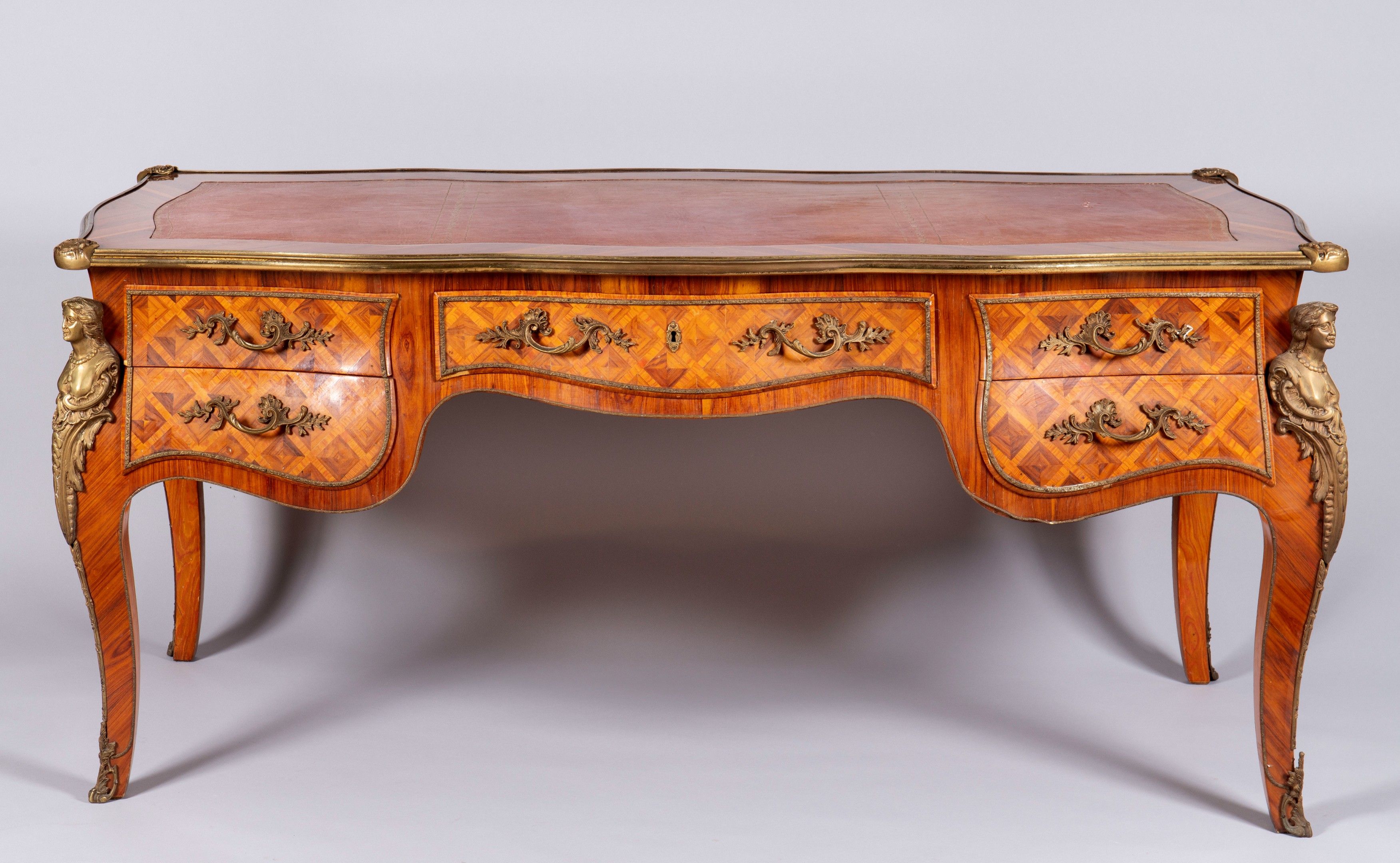 Veneered flat desk opening to 5 drawers in the waist, the top encircled by a bronze moulding and covered with havana leather, it rests on arched legs decorated with espagnolettes. Louis XV style, 20th century - 80x175x81cm
