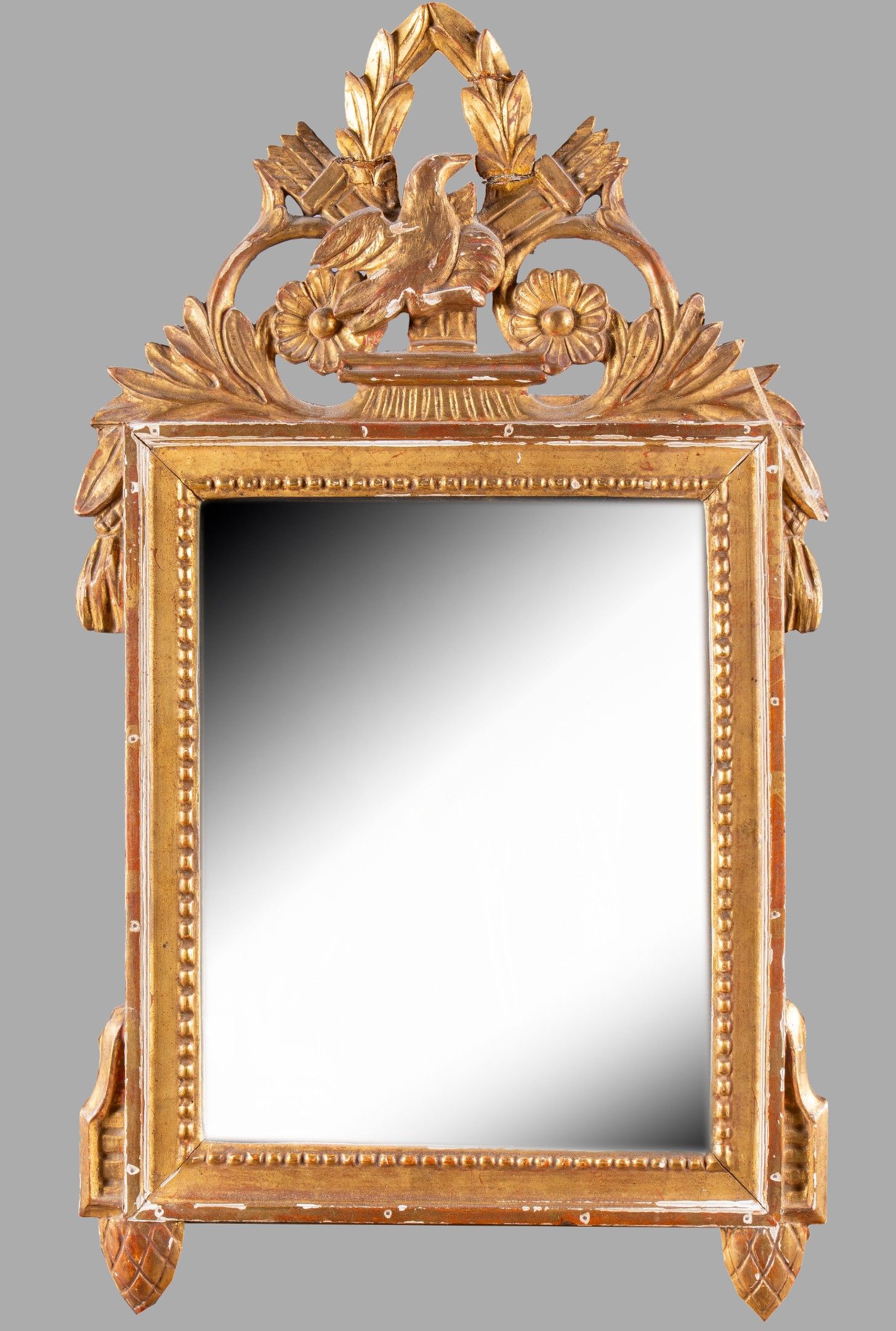 Carved and gilded wood pediment mirror decorated with a dove quiver and laurels, the rod in a frieze of pearls.