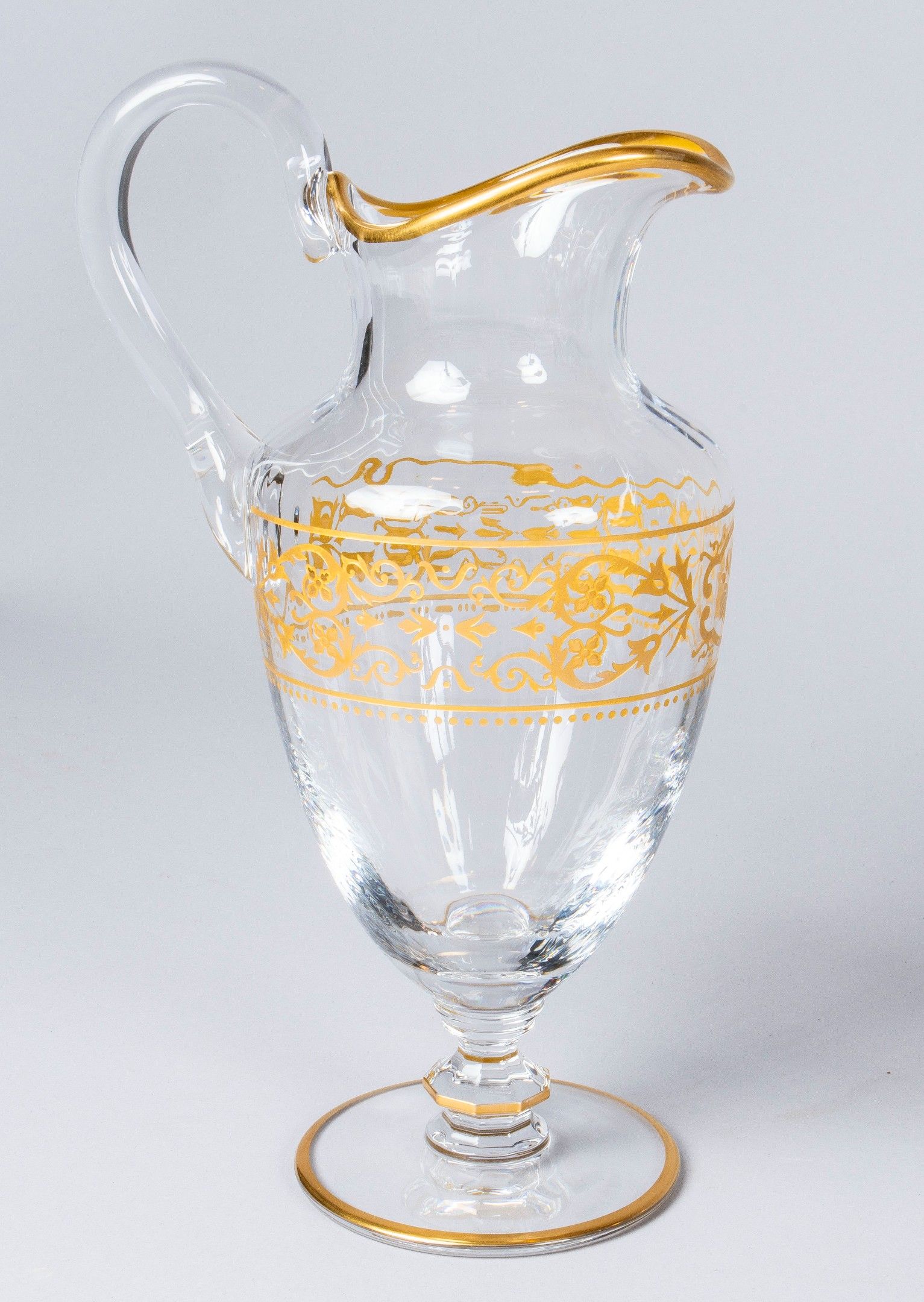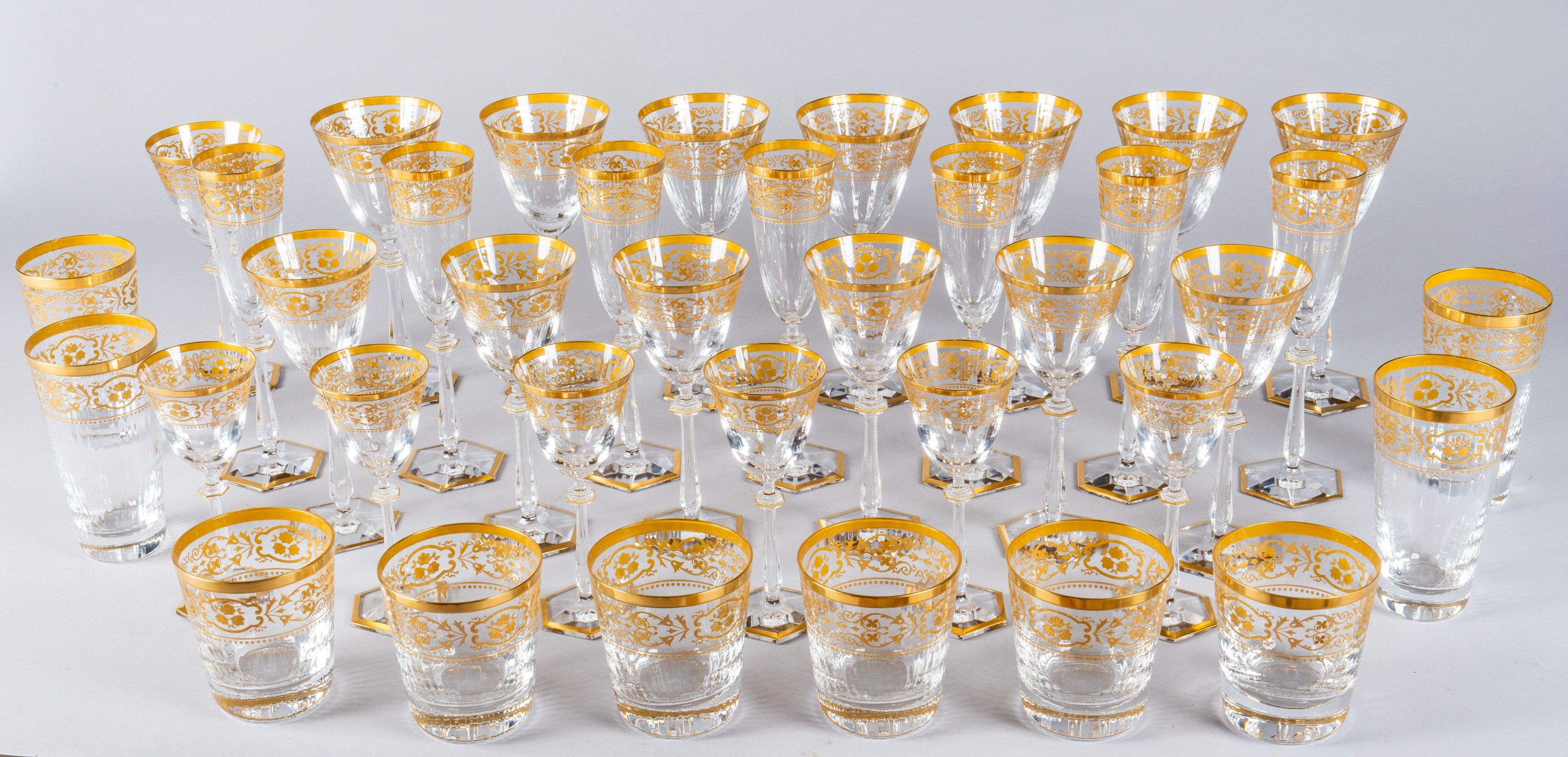 Set of cut crystal glasses Rivoli model including 7 champagne flutes, 7 water glasses, 7 wine glasses, 6 white wine glasses, 4 orangeade glasses, 6 whisky glasses, 1 water pitcher