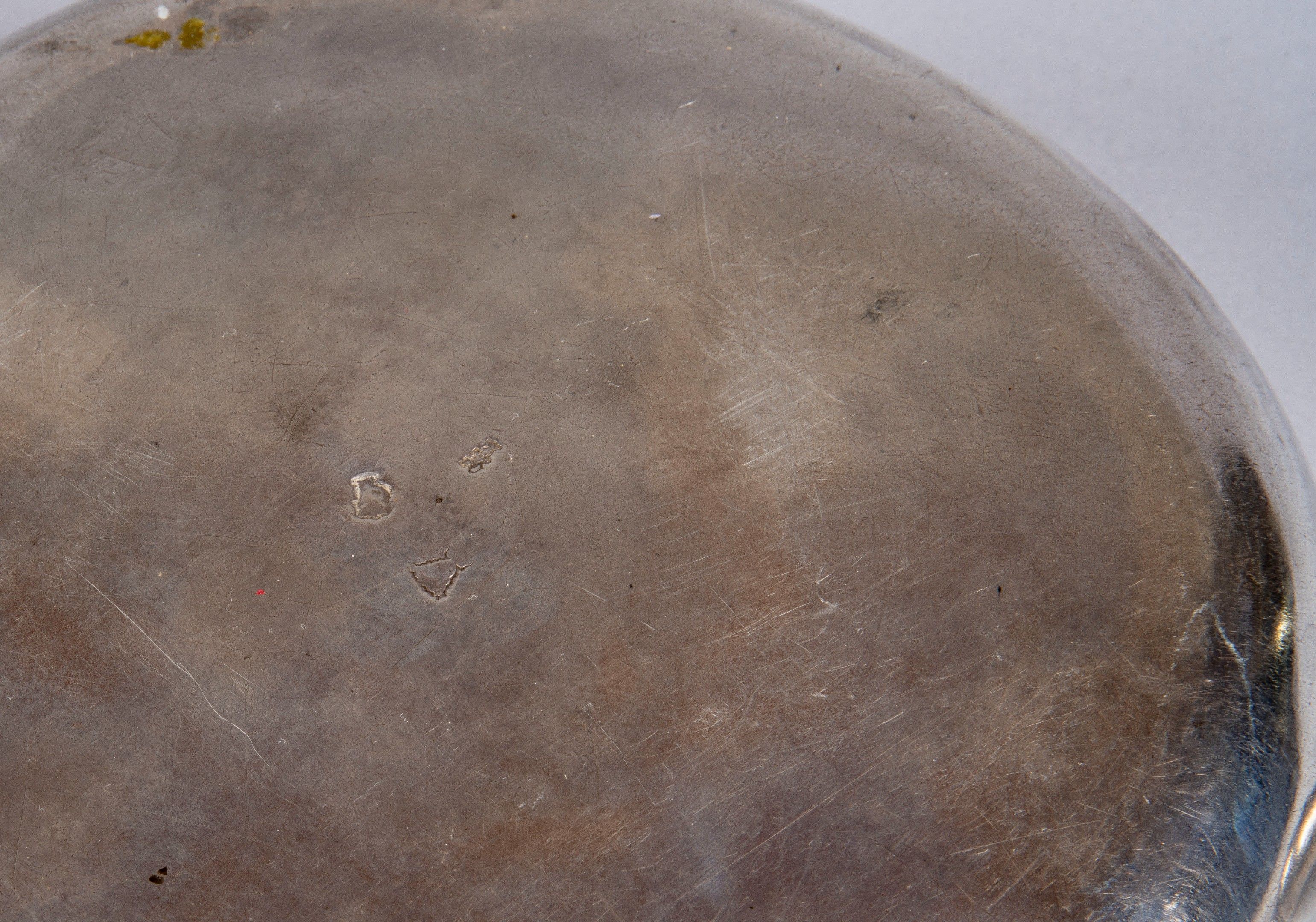 A plain silver frying pan with a filet border and a coat of arms on the body. 18th century Paris hallmark - The grip is unsoldered and the handle is missing - Weight: 659g