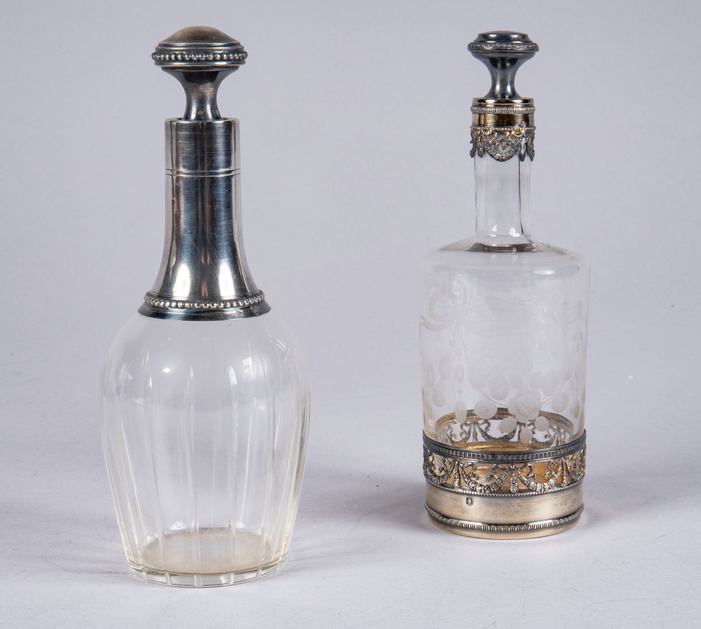 Set of 2 crystal decanters, one cut and mounted in silver with a frieze of pearls (MO: Puiforcat), the second decorated with flower falls and bows, the silver mounting decorated with Louis XVI style bows.