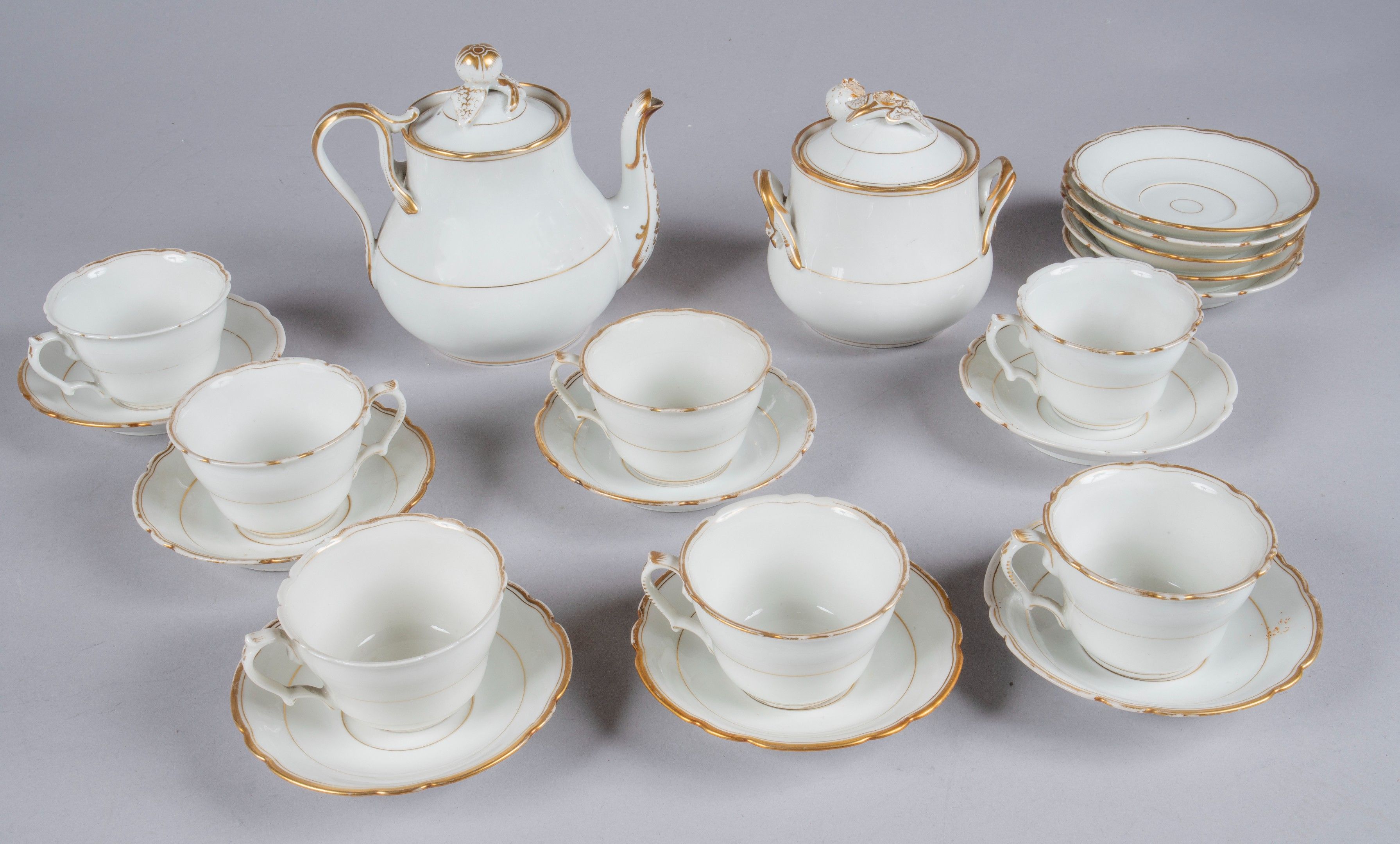 Rousselot à Paris, White porcelain tea service with gold highlights comprising 7 cups and saucers, 1 teapot and 1 covered sugar bowl - Chips