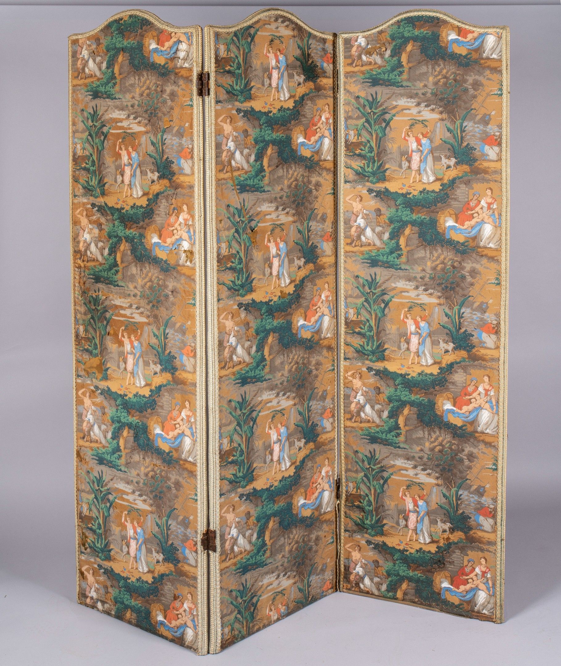 Three-leaf folding screen composed of sheets of wallpaper on the theme of Paul and Virginie (accidents and missing pieces) - Each sheet: 181 x 50 cm