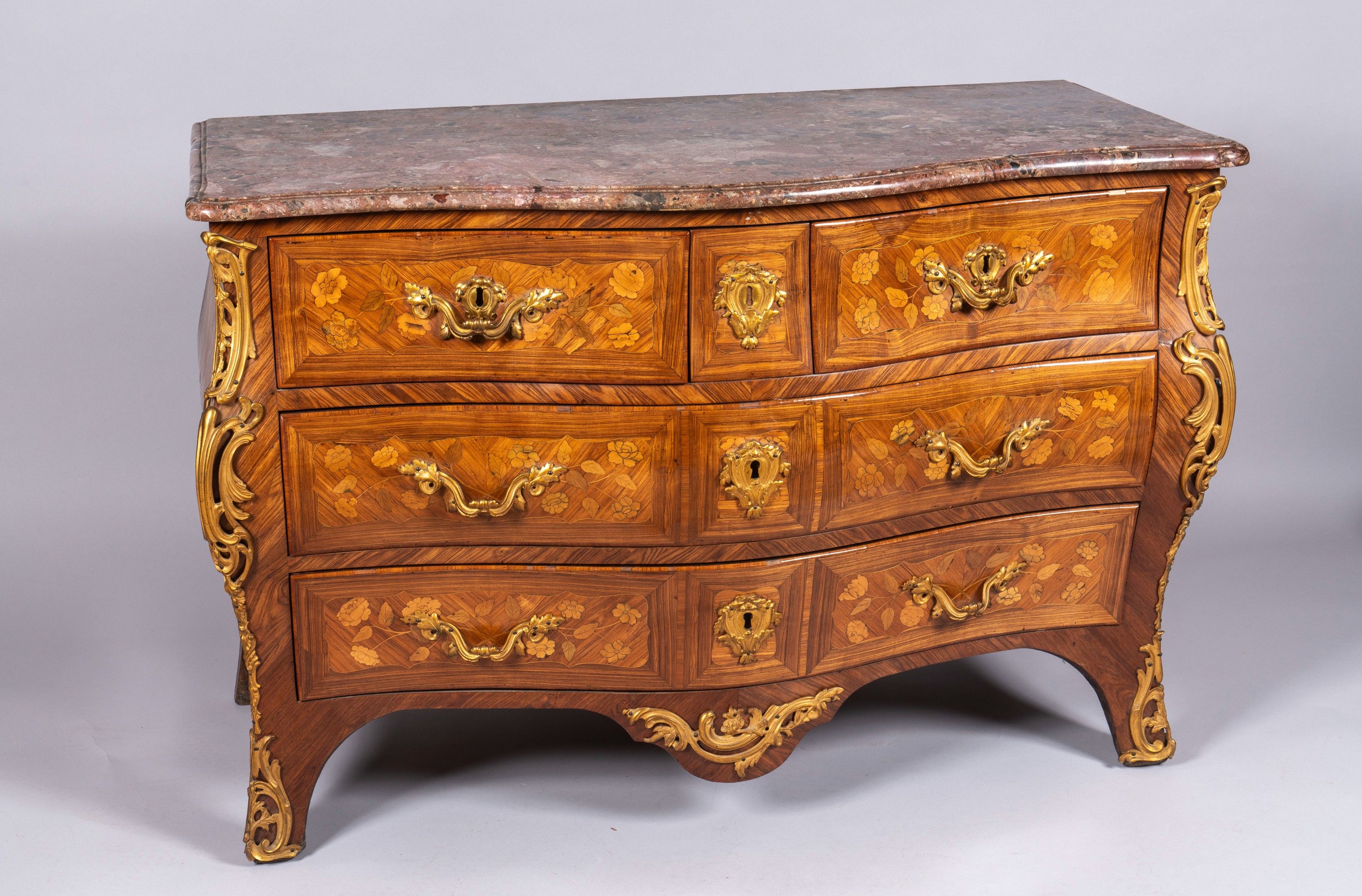 A curved chest of drawers in veneered wood inlaid with flowe…