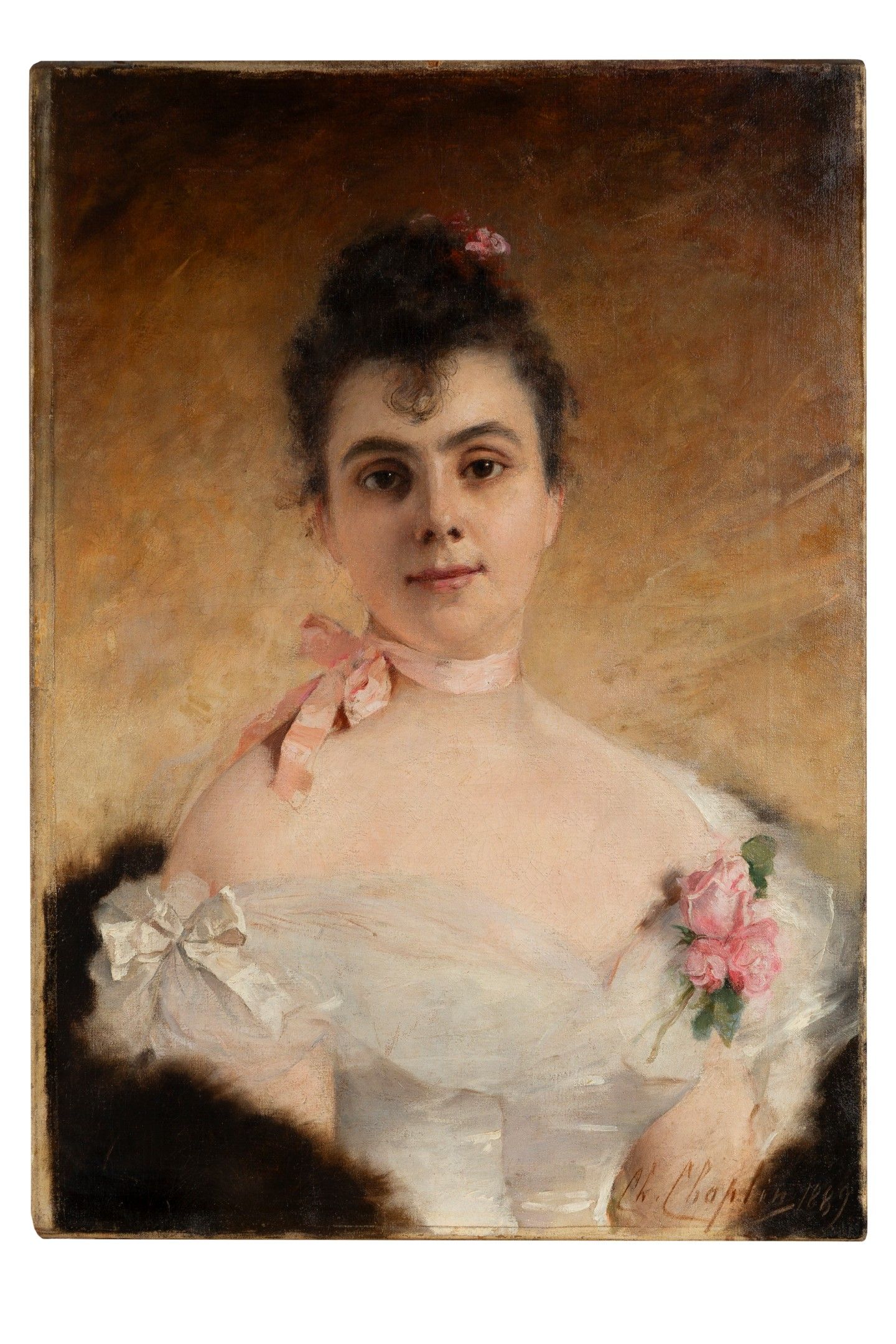CHARLES CHAPLIN (1825-1891) Portrait of a Woman with a Pink Bow, 1889 Oil on canvas Signed and dated '1889' lower right (Old restorations with piece on the back) Oil on canvas, signed and dated '1889' lower right 72 x 51 cm - 28 3/8 x 20 1/8 in. Provenance Private collection, France