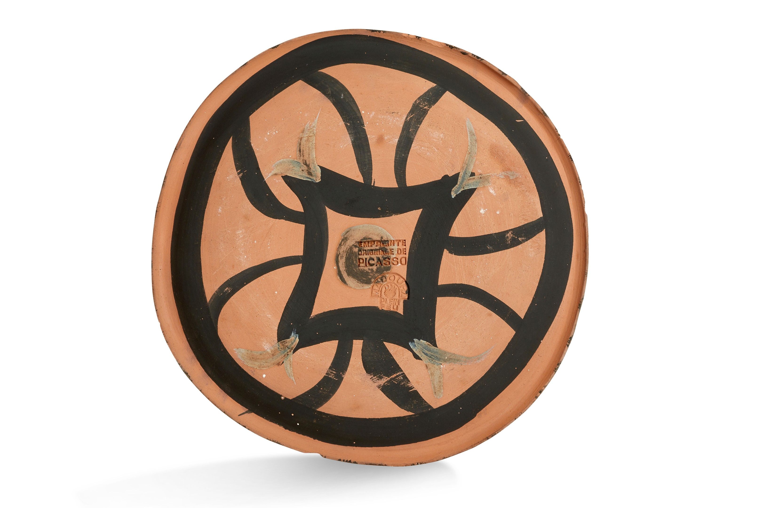 Red earthenware ceramic plate, painted, stamped 'Empreinte/originale de/Picasso' and 'Madoura/Plein/Feu
