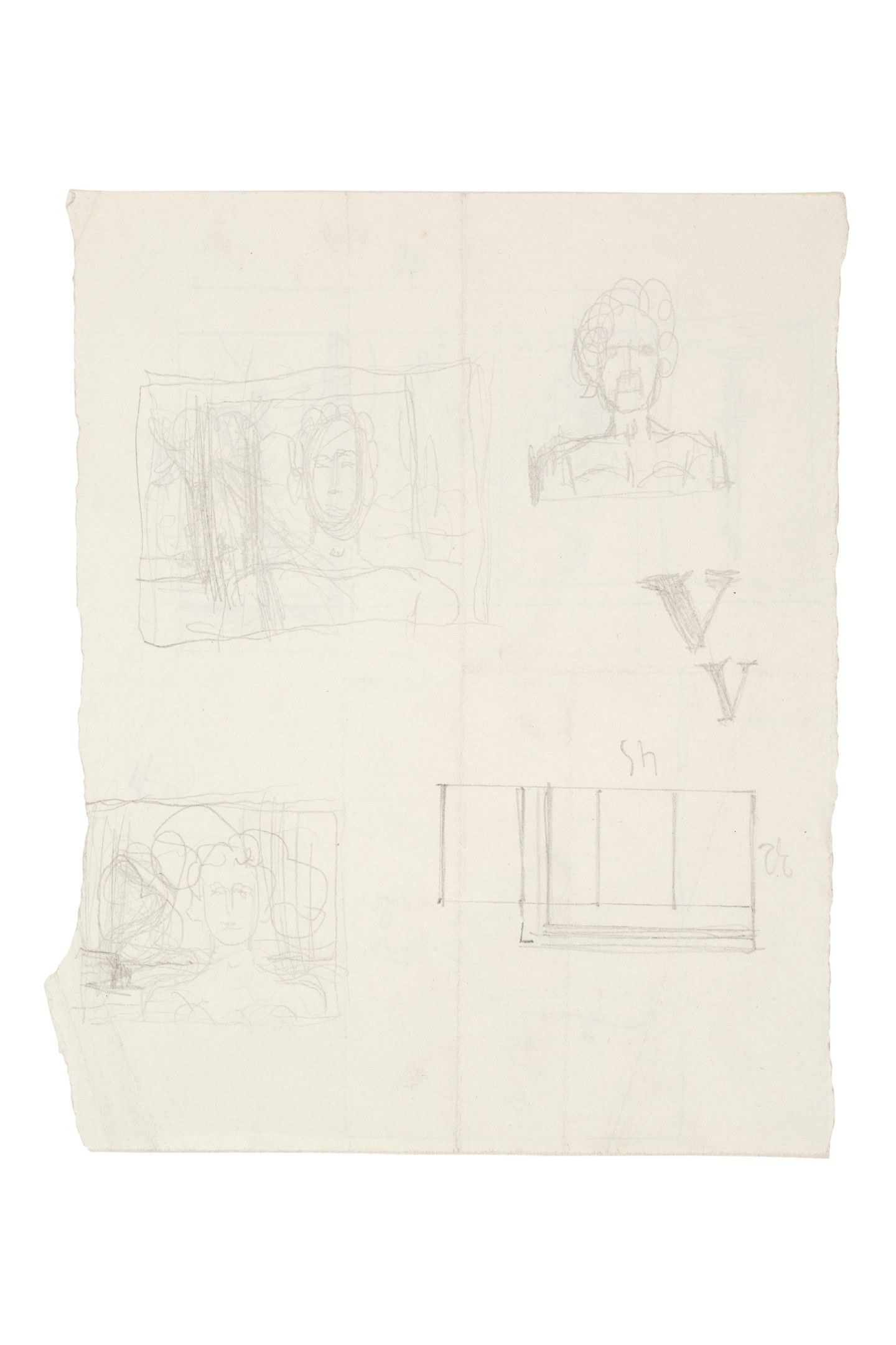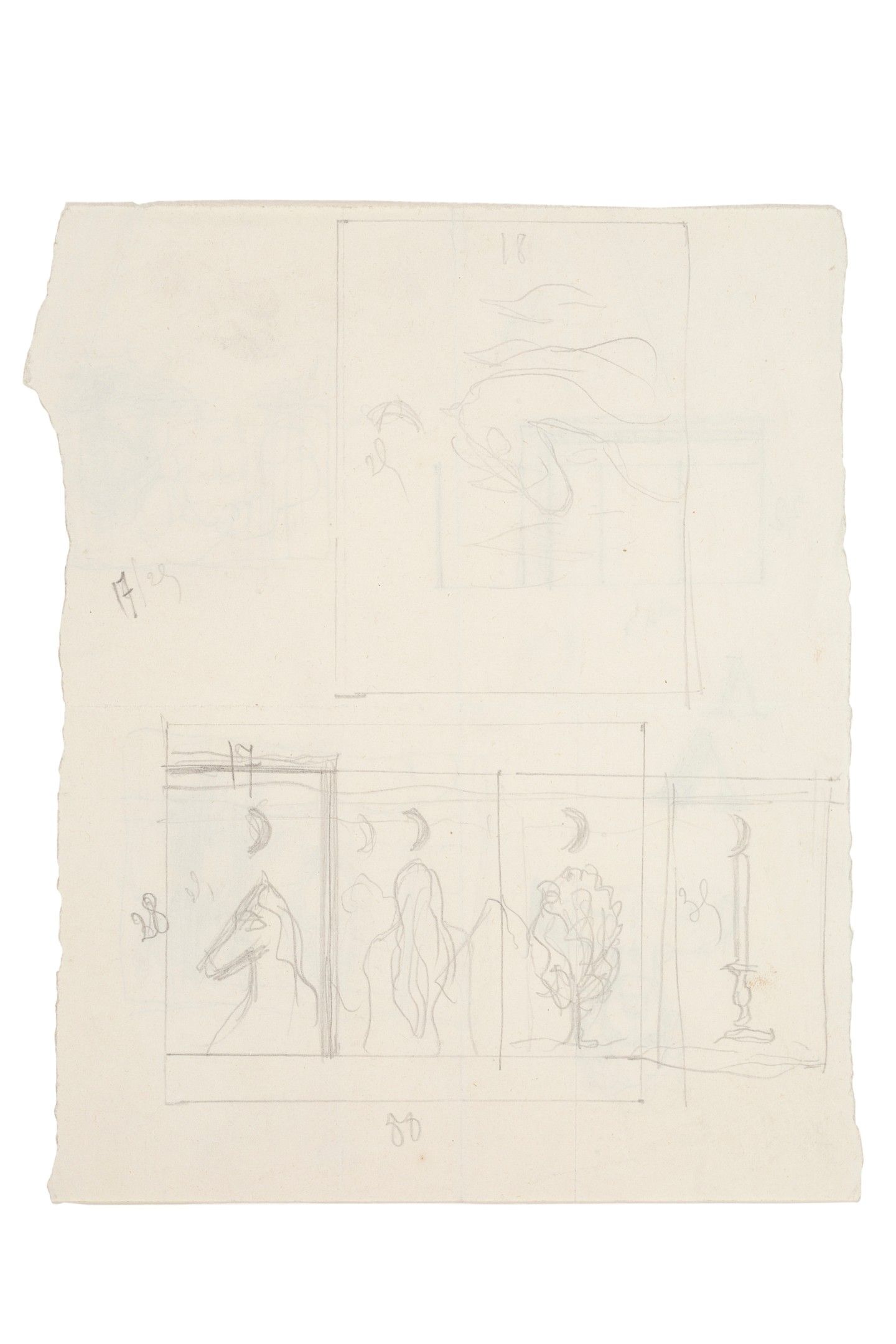 On the front, there are three bust-length portraits of women, a sketch of empty frames with dimensions, and the letter 'V' twice. On the reverse, vertically, we can see a sketch for the horse's head that we find in La raison pure (1948), and a four-part composition combining the same horse's head, the woman with long hair, seen from the back, in La robe du soir (1955), a tree and a candlestick, surmounted by a crescent moon, just like the three previous ones, with indications of height ('28') and length ('80').