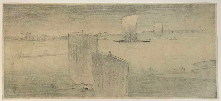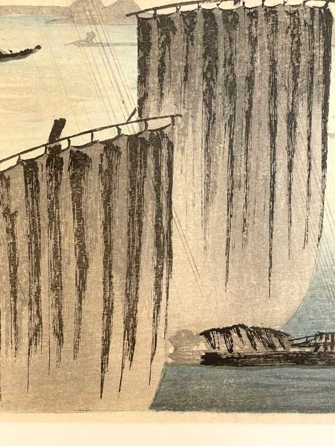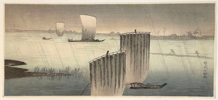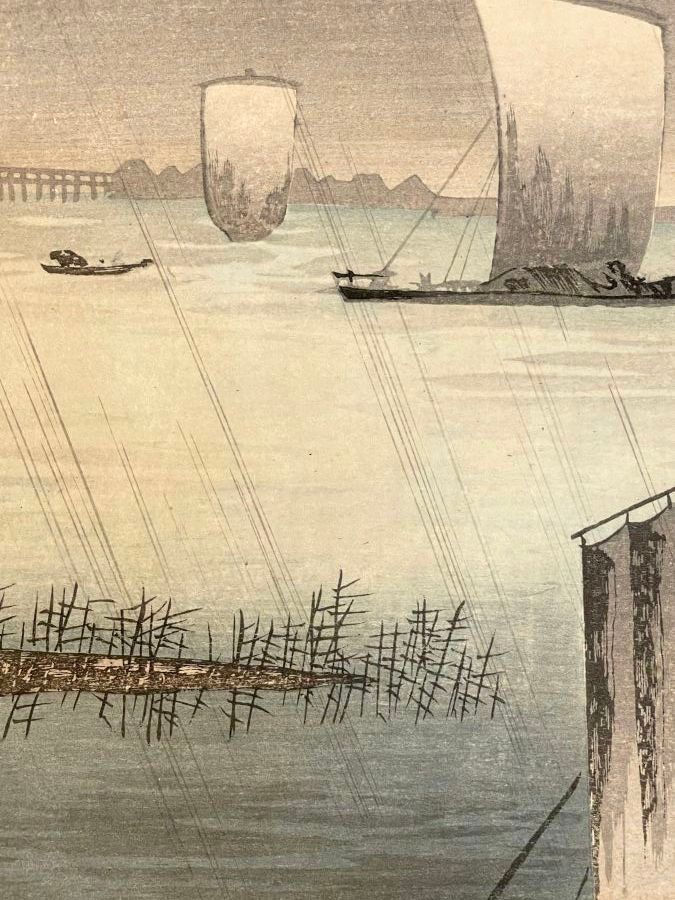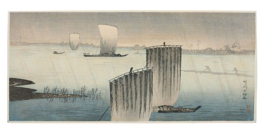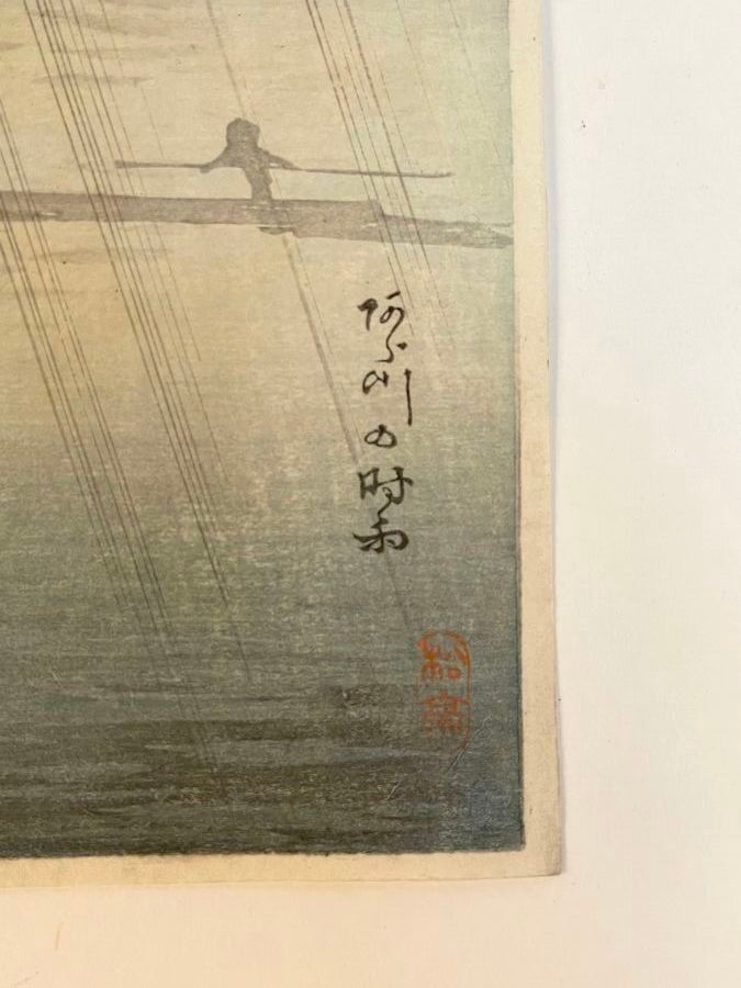 Print, otanzaku yoko-e, plate Arakawa no shigure (荒川の時雨), Late Autumn Rain in Arakawa. Stamp of the artist Shotei. Publisher Watanabe Shōzaburō. Circa 1920.