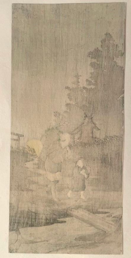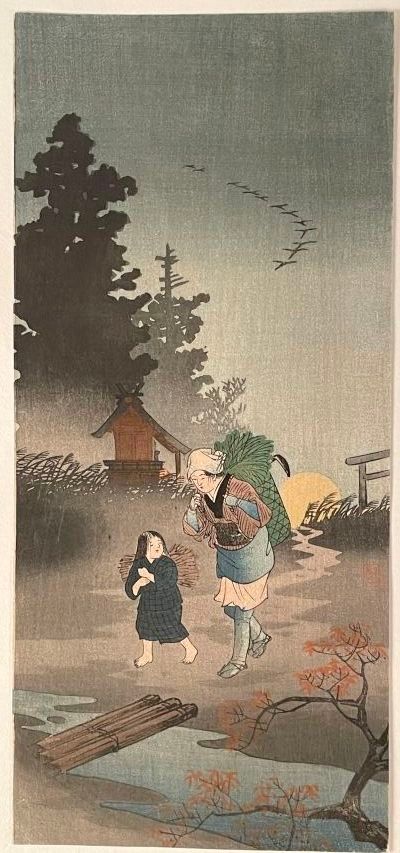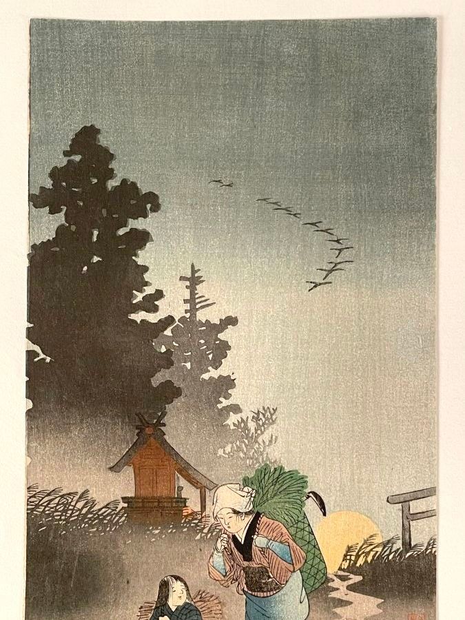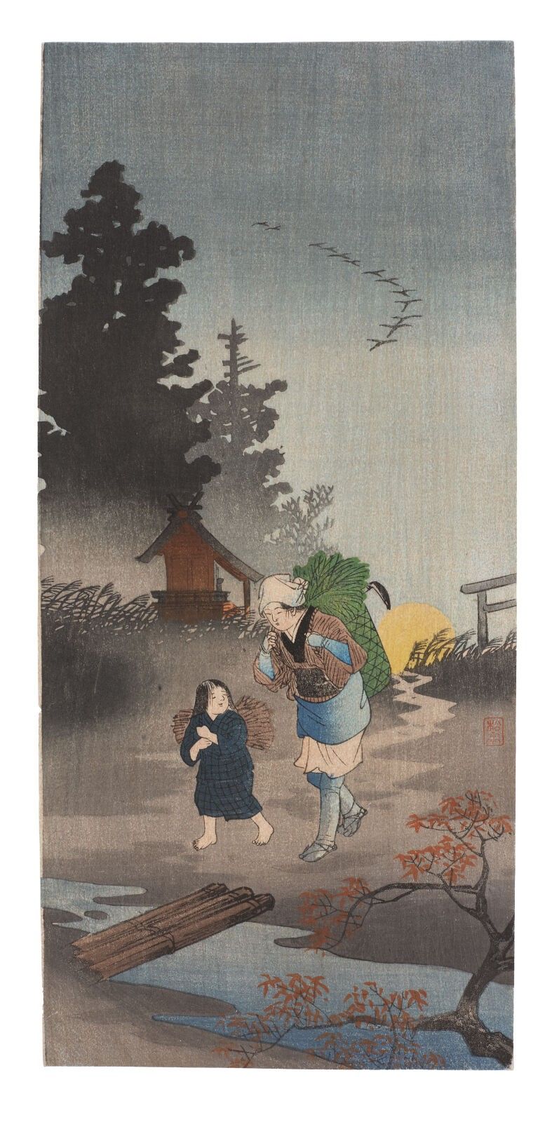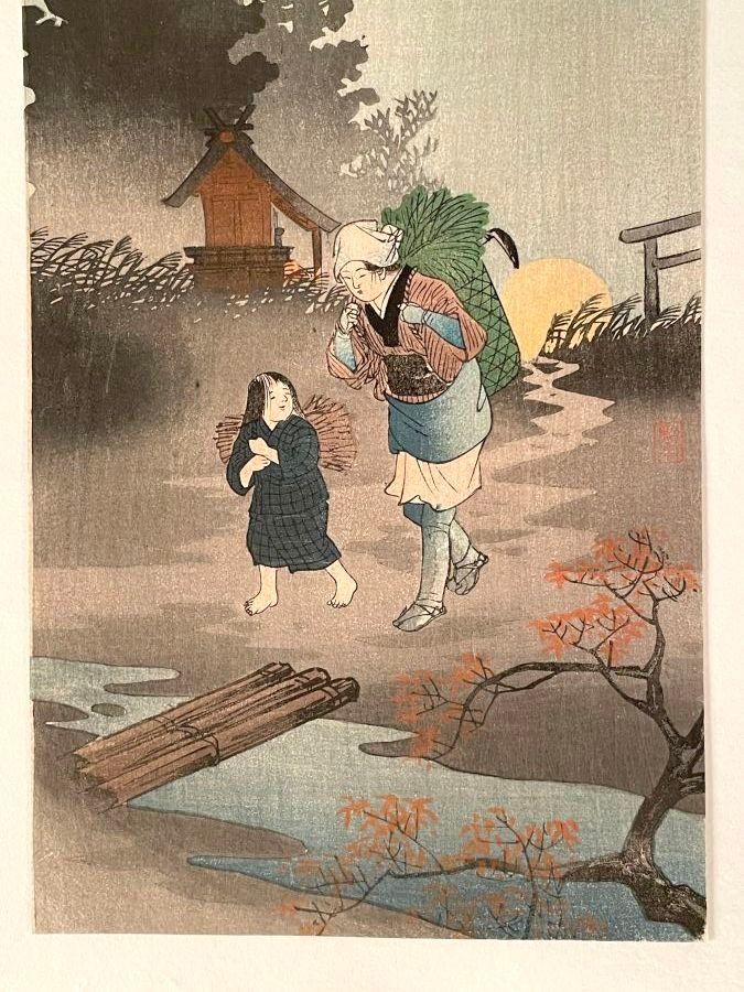 So this is a pre-earthquake 1923 version of Kantô. Shotei then reproduced a third of its pre-earthquake production from 1936 onwards. In the post-earthquake version, the woman is alone carrying the bundle of wood, a more common composition.