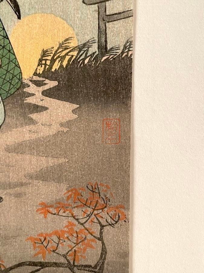 Print, otanzaku tate-e, Tasogare plate, Twilight. Stamp of the artist Shotei. Circa 1920.