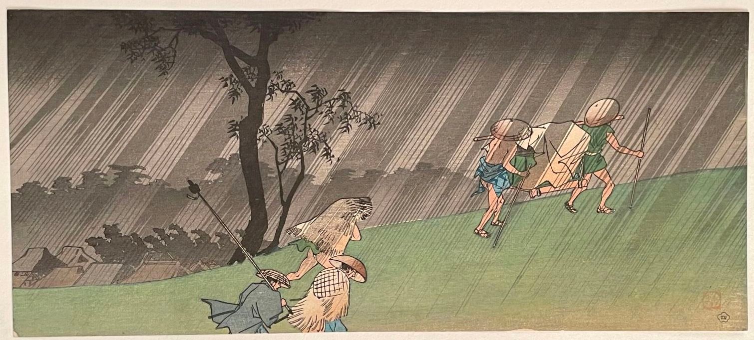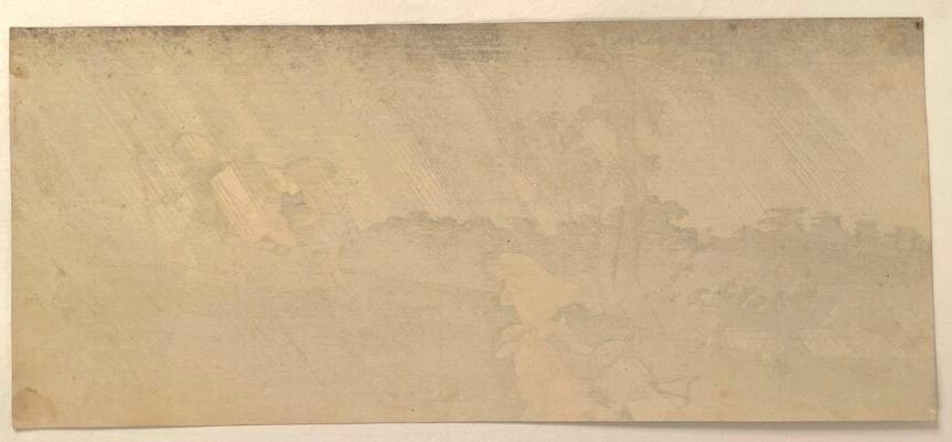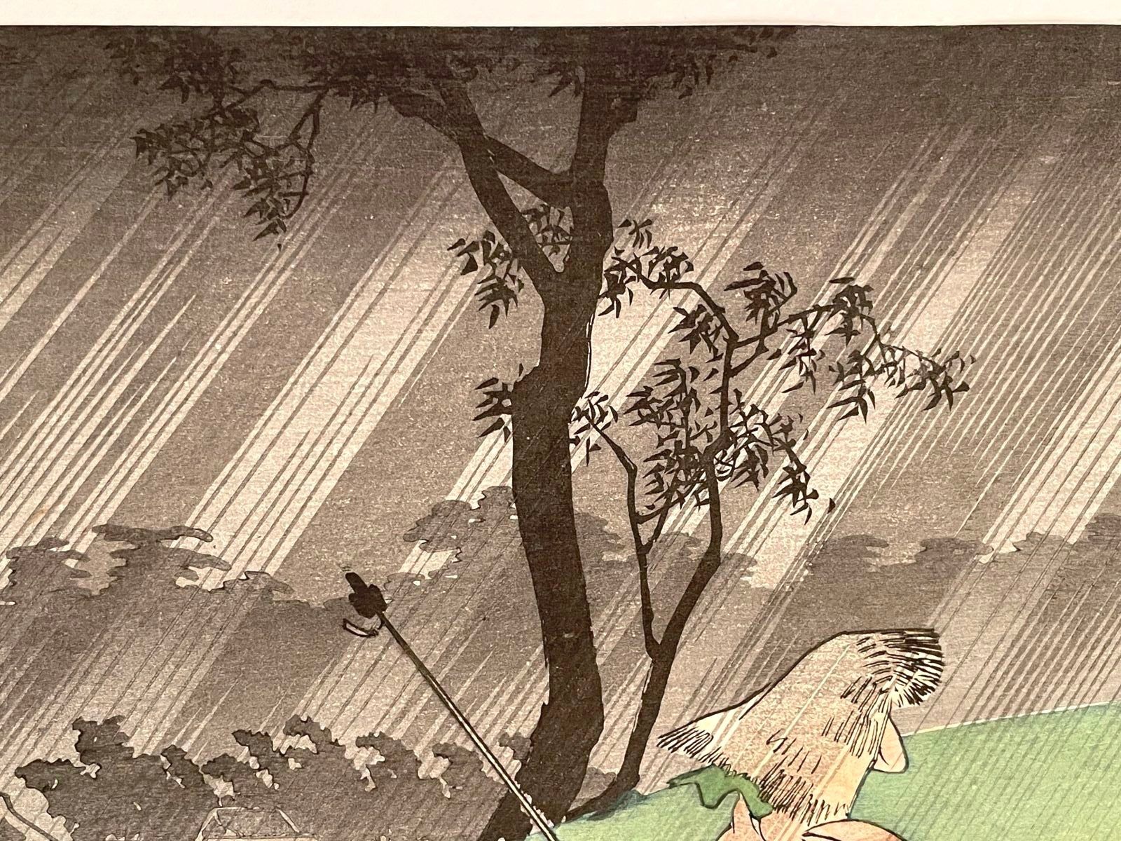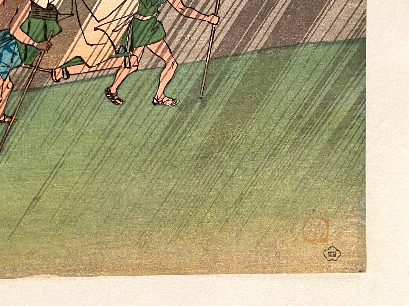 Print, otanzaku yoko-e, Shono no ame (庄野の雨), Storm Rain in Shono. Shōtei cachet and cachet 4 in a flower.