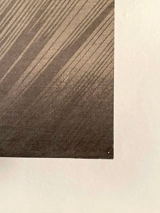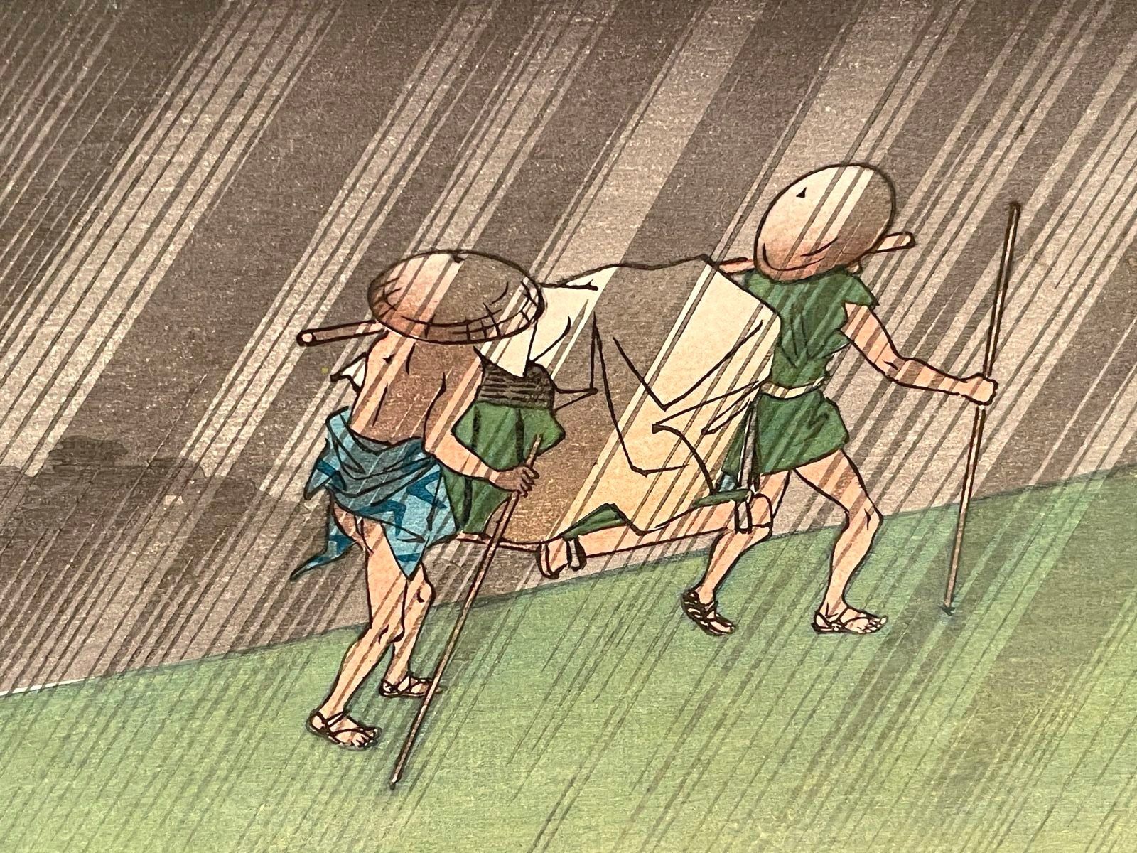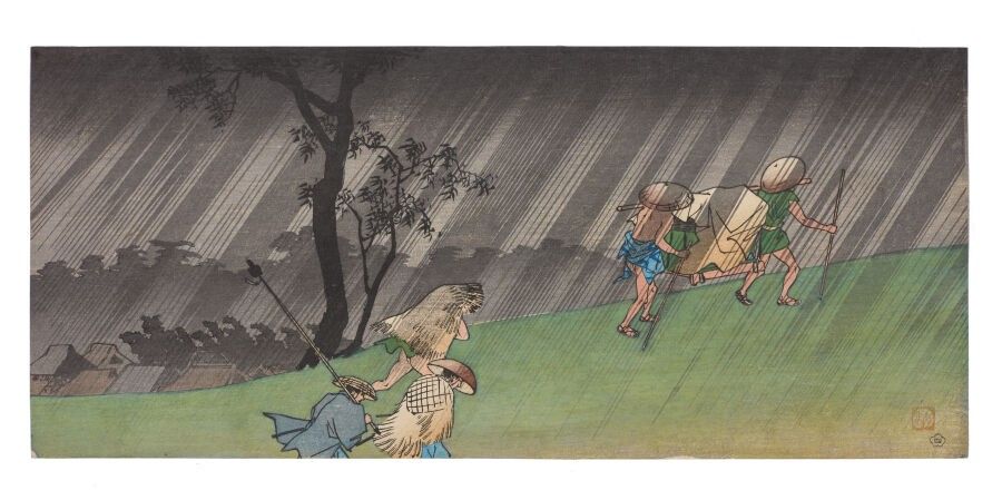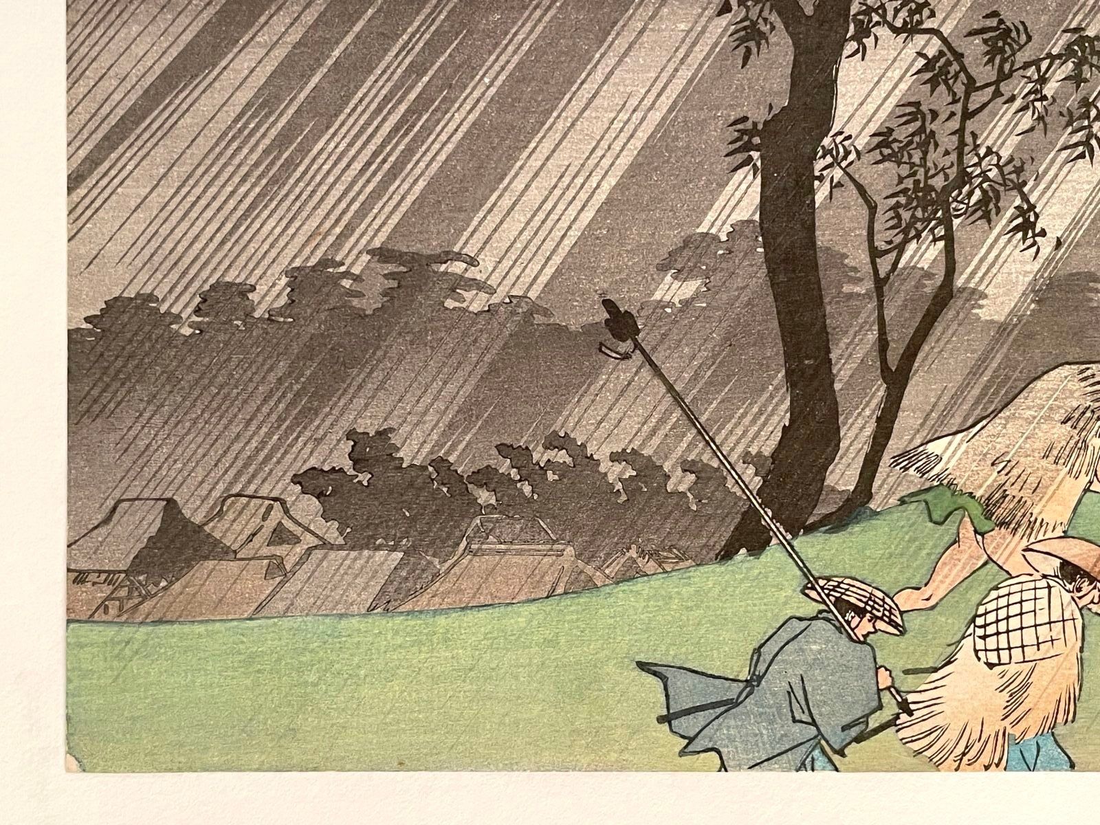 Print, otanzaku yoko-e, Shono no ame (庄野の雨), Storm Rain in Shono. Shōtei cachet and cachet 4 in a flower.