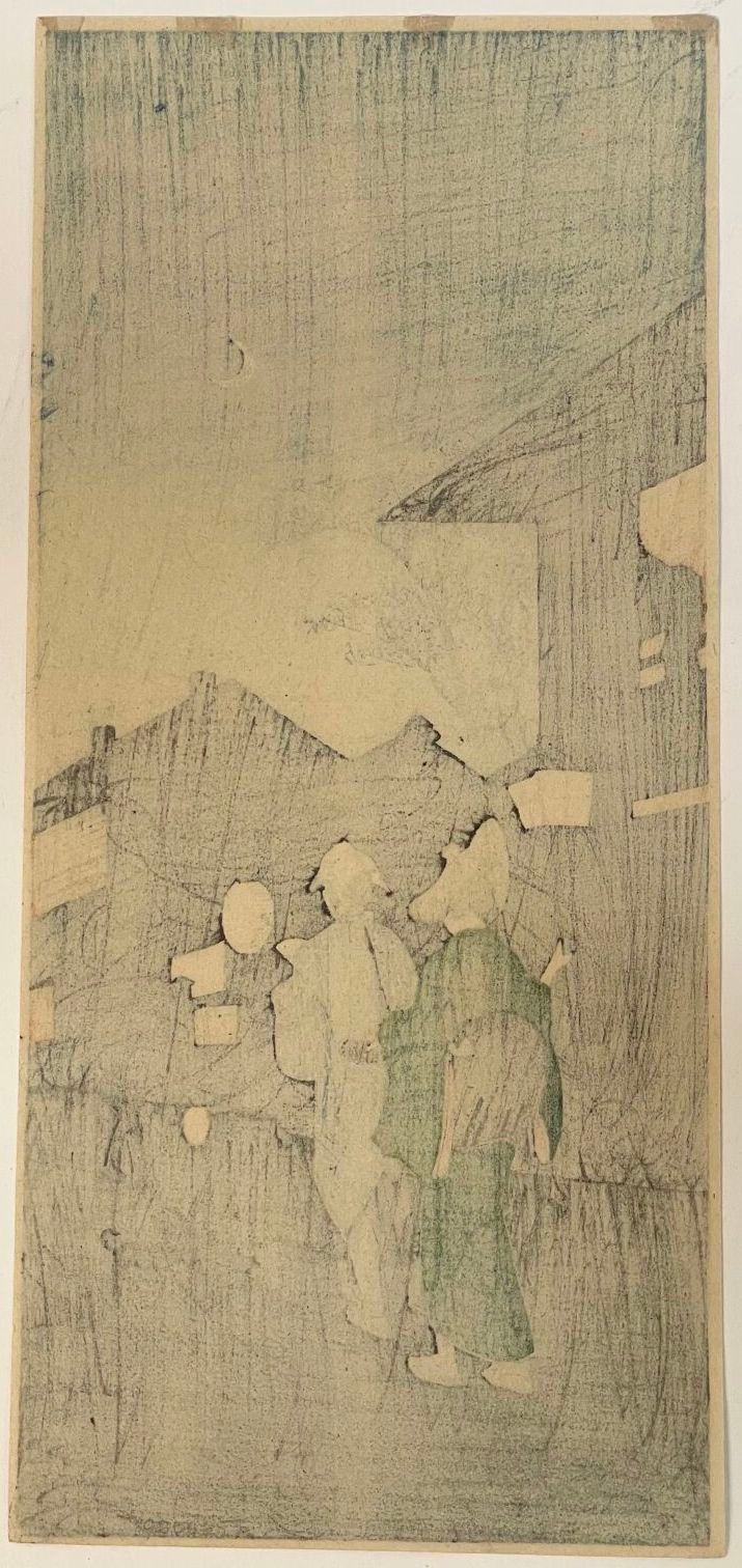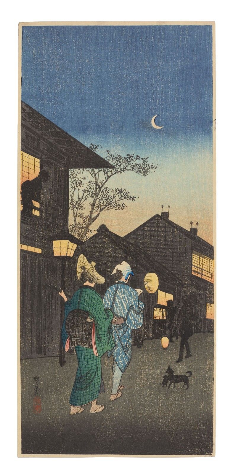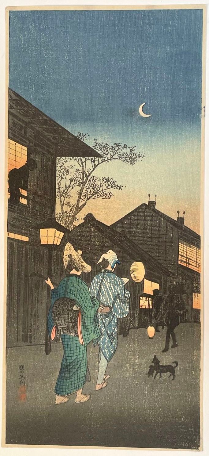 Print, otanzaku tate-e, Shinaga no yoru (品川の夜) Evening in Shinagawa. Stamp of the artist Yoshie. Publisher Watanabe Shōzaburō. Circa 1920.