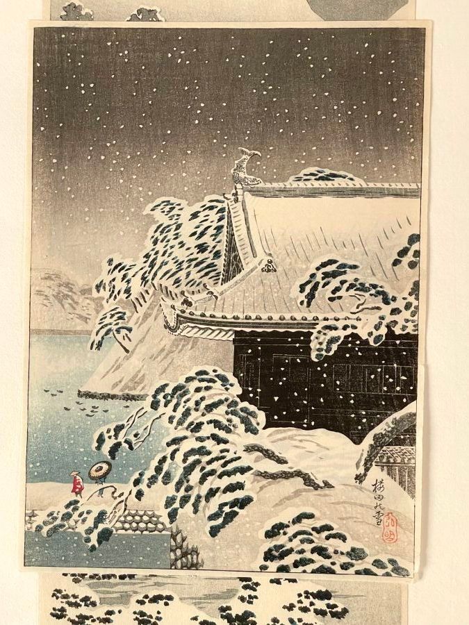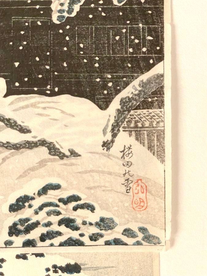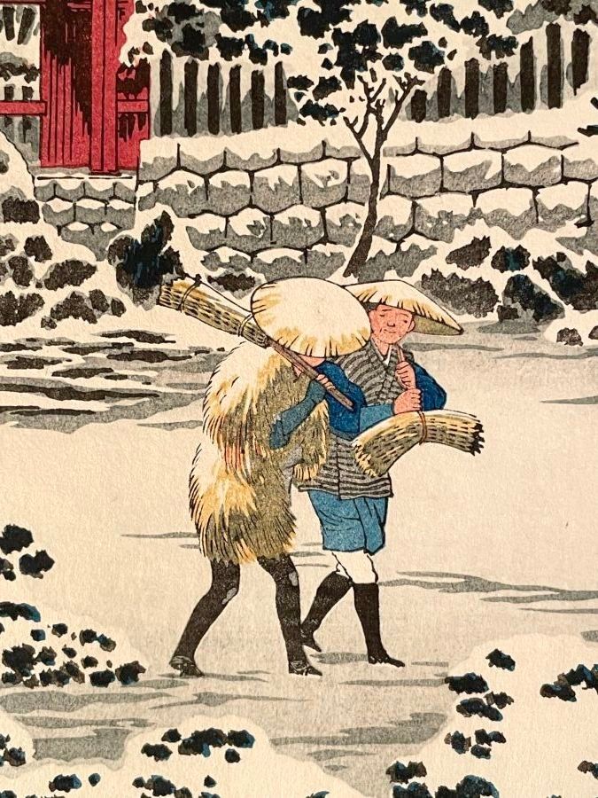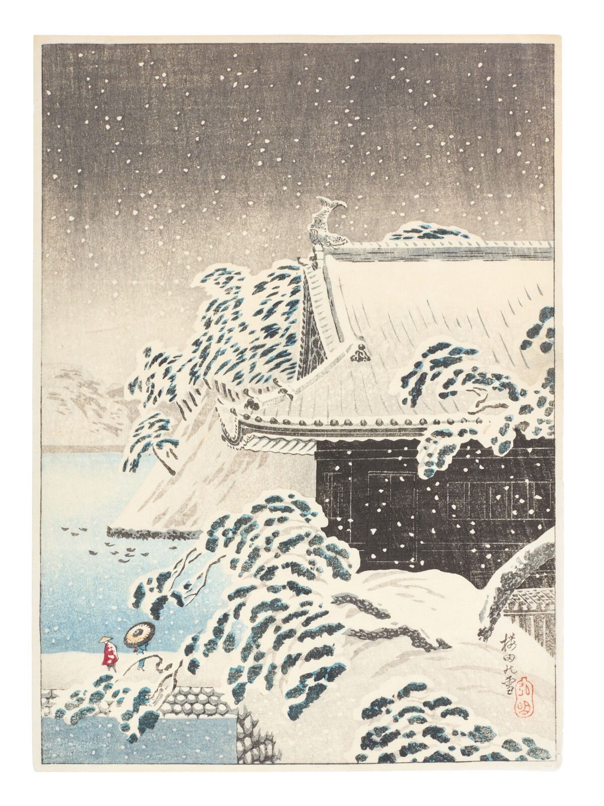 - Chuban tate-e, plate Sakurada mon yuki (桜田門雪) Snow at Sakurada Gate. Stamp of the artist Hiroaki. Circa 1930. Dim. 25,4 x 18,2 cm.