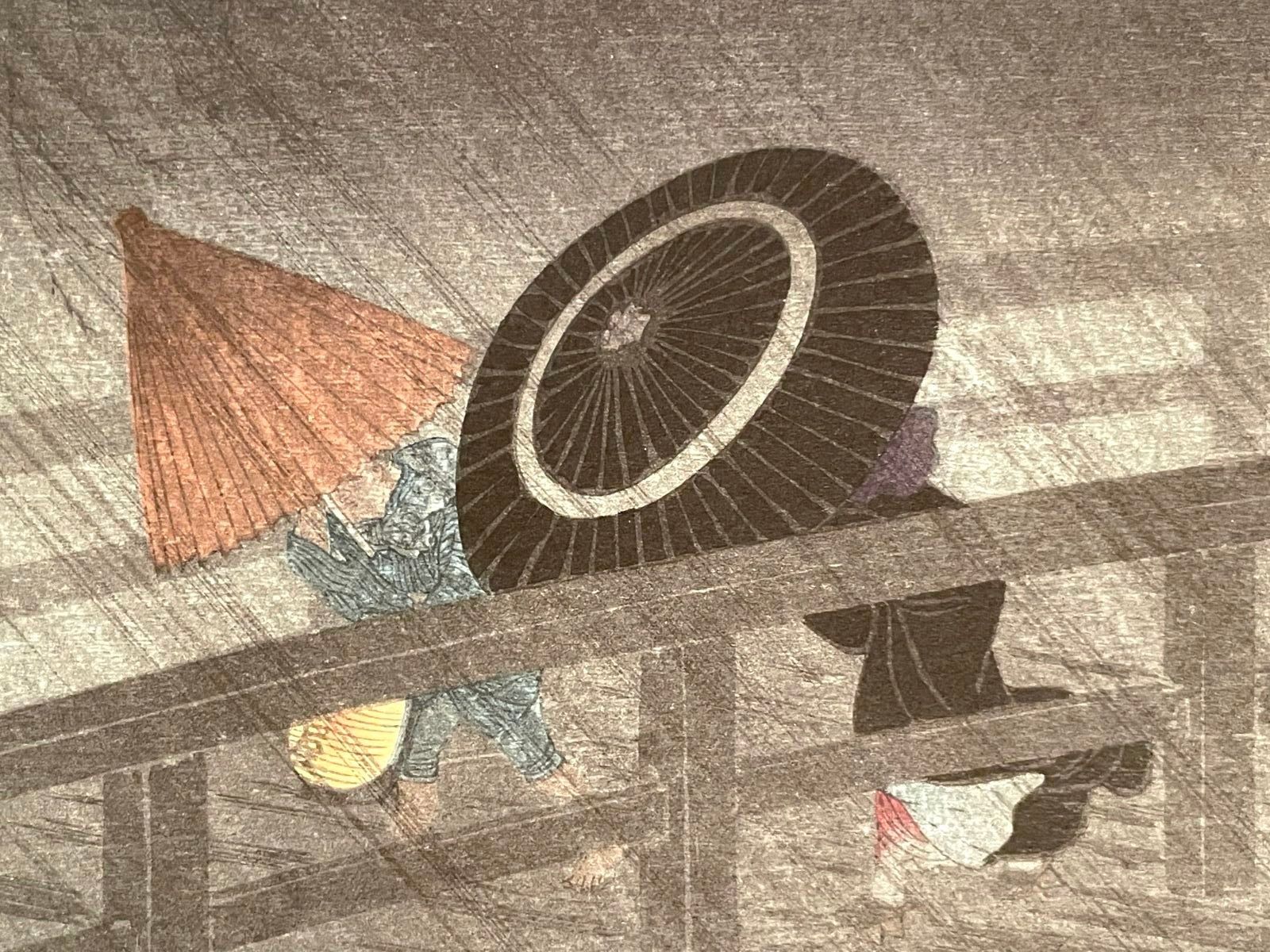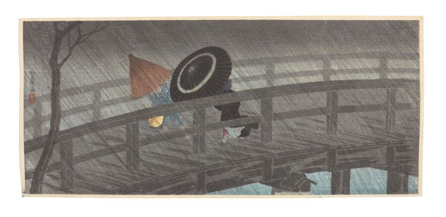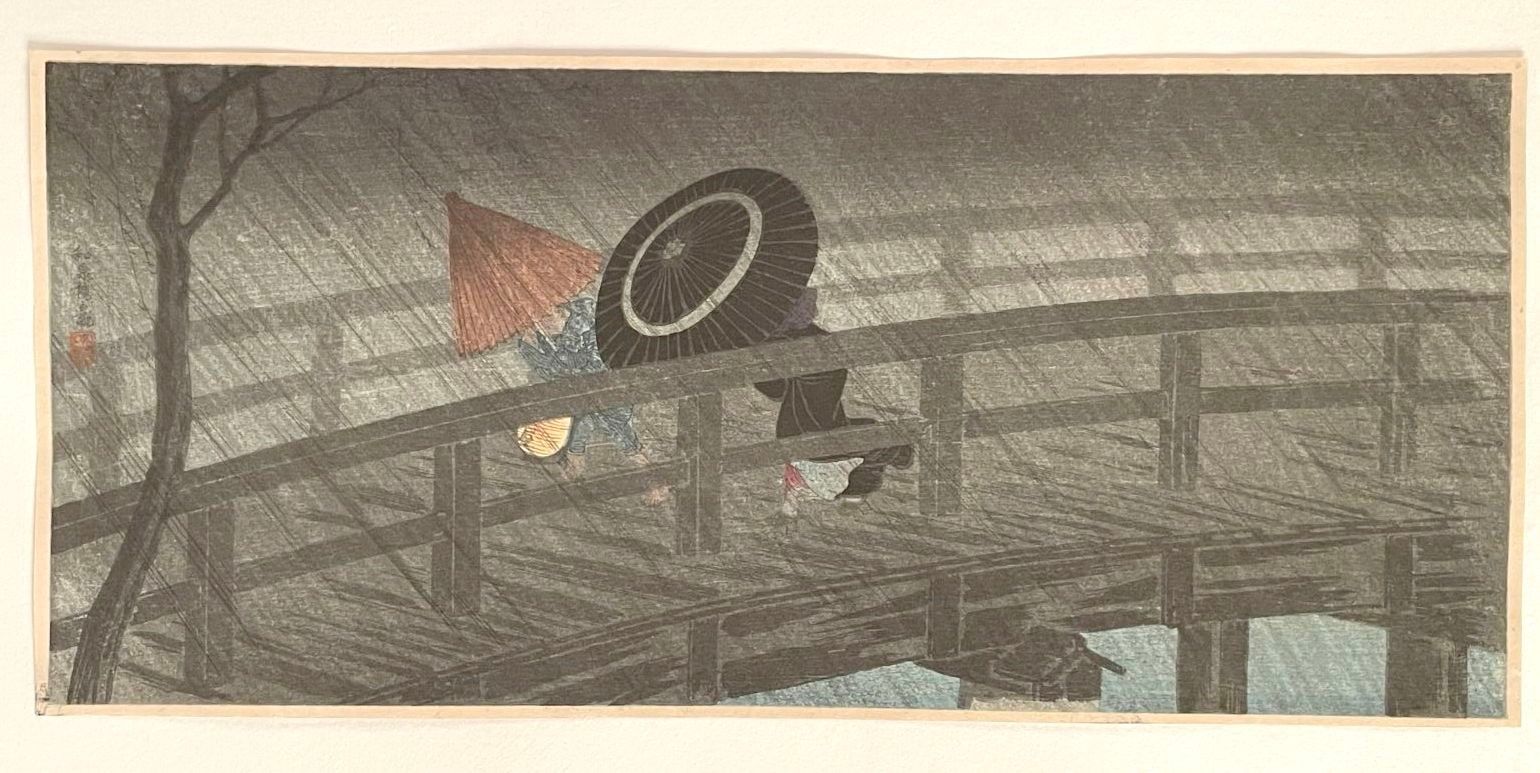 Print, otanzaku yoko-e, plate Izumibashi no ame (和泉はしの夜雨) Rain on Izumi Bridge. Stamp of the artist Shotei. 1930s.