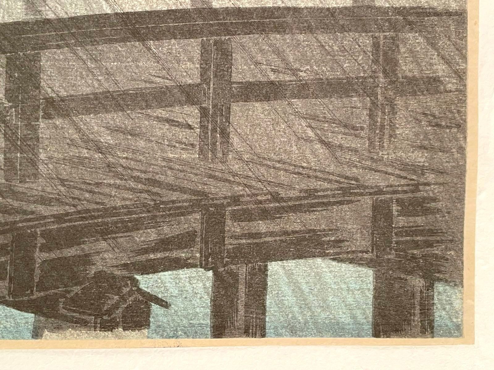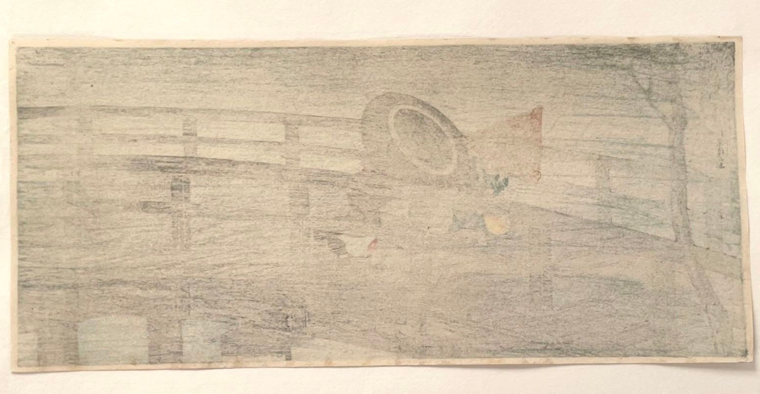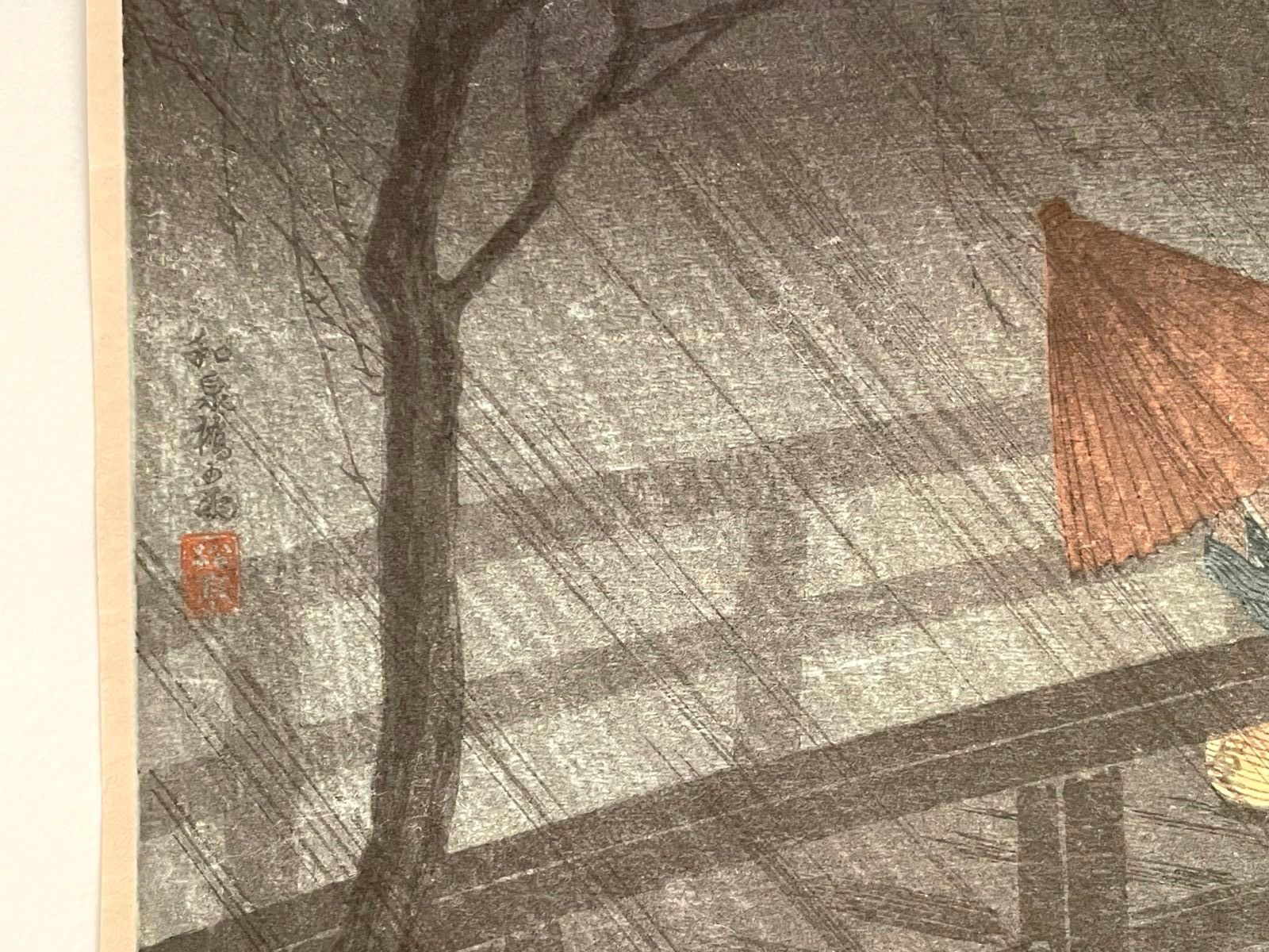 Print, otanzaku yoko-e, plate Izumibashi no ame (和泉はしの夜雨) Rain on Izumi Bridge. Stamp of the artist Shotei. 1930s.