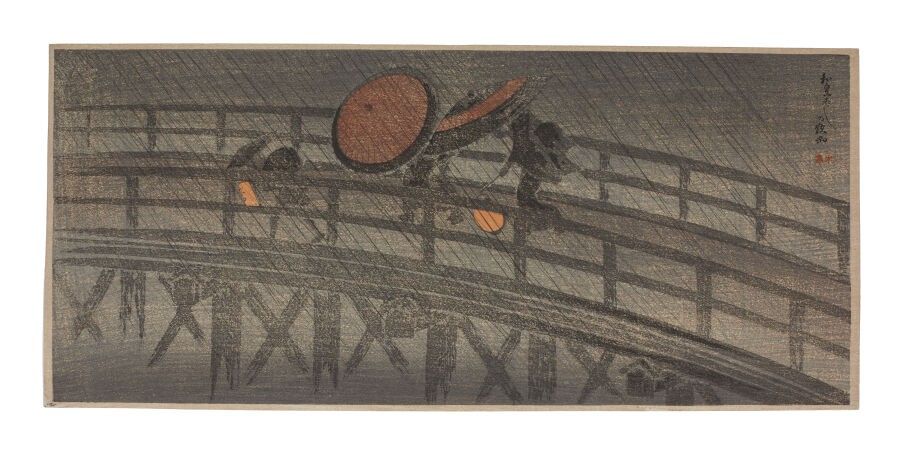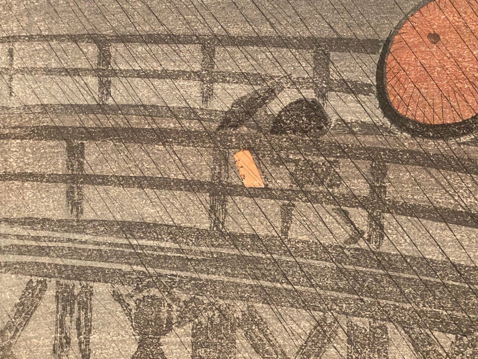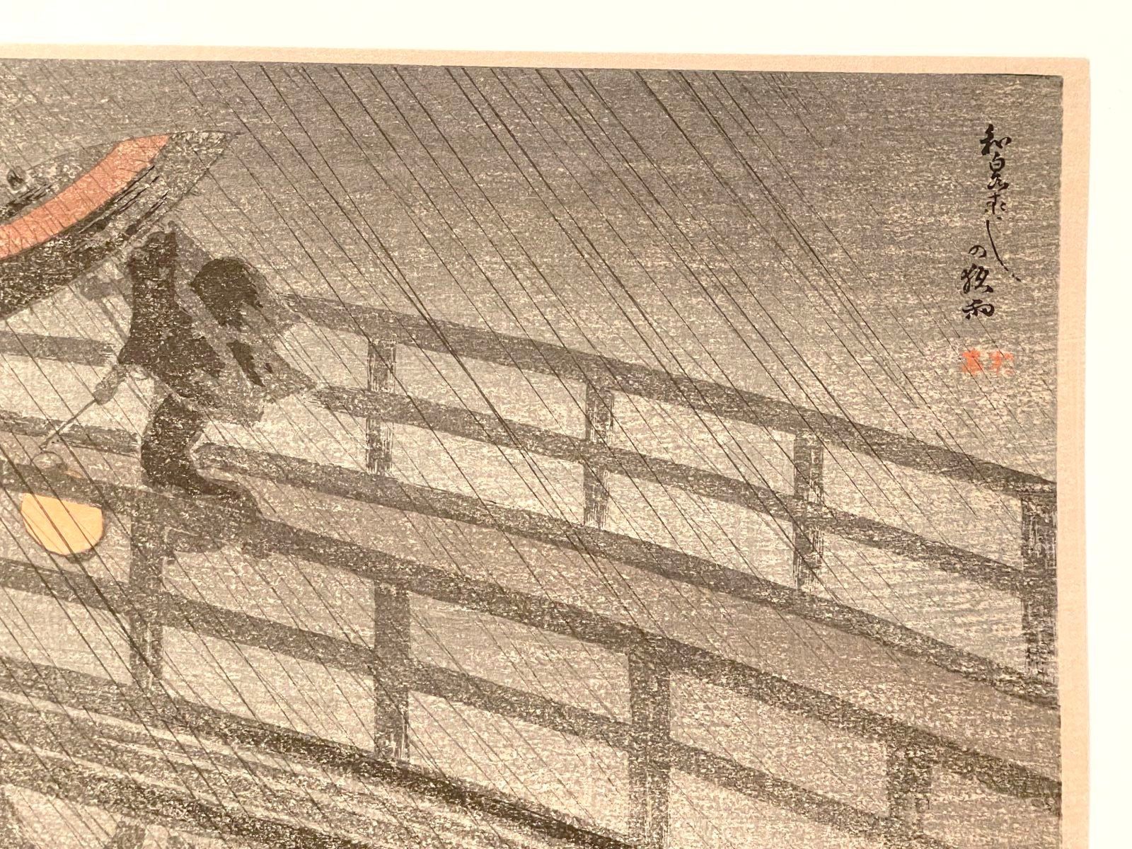 Print, otanzaku yoko-e, Izumi hashi no yoru ame (和泉橋の雨), Rainy evening on the Izumi bridge. Shotei stamp. Circa 1920 (Restoration.)