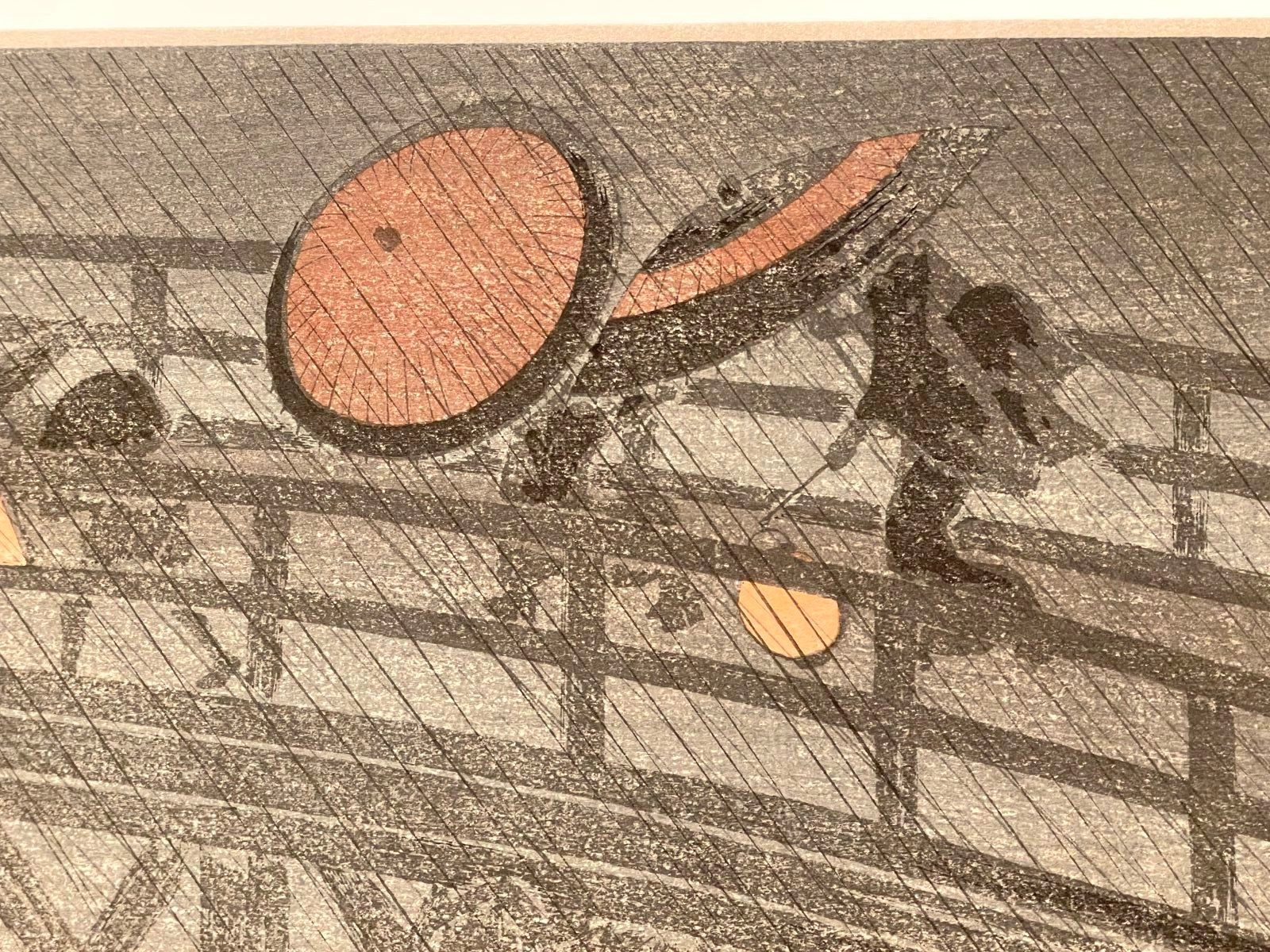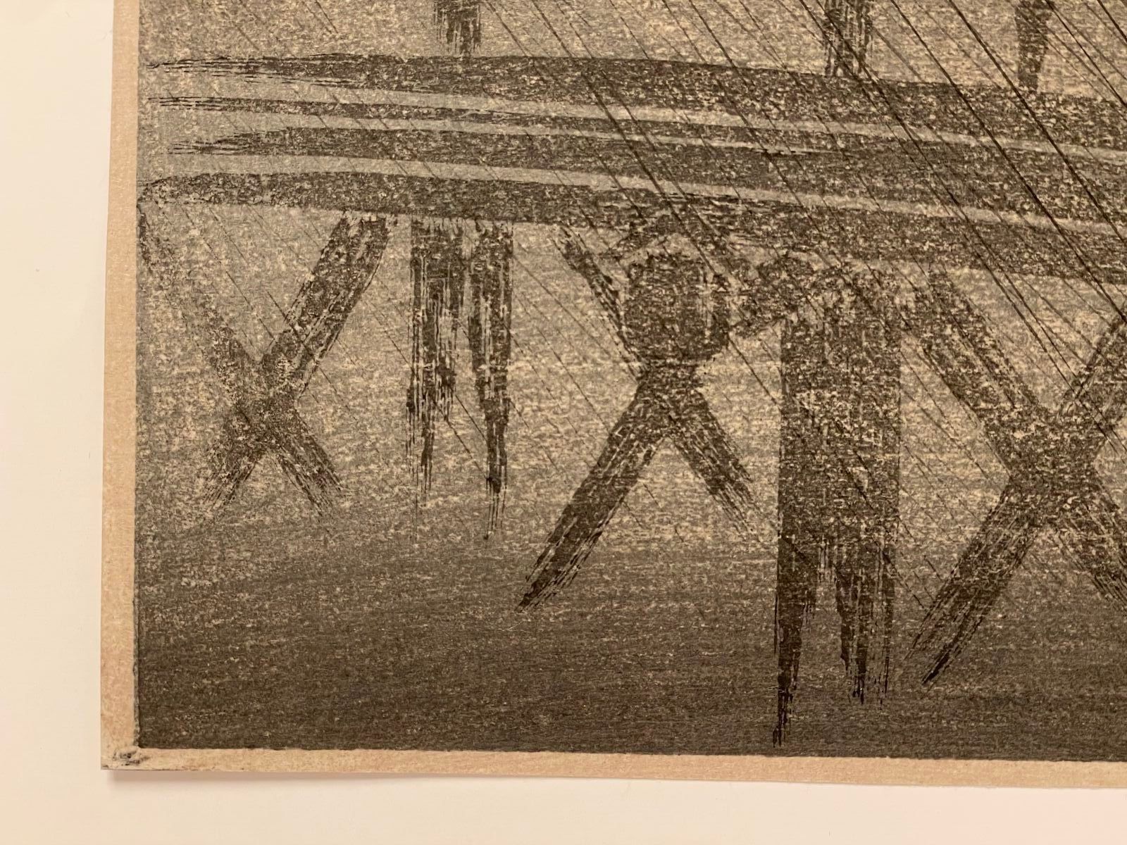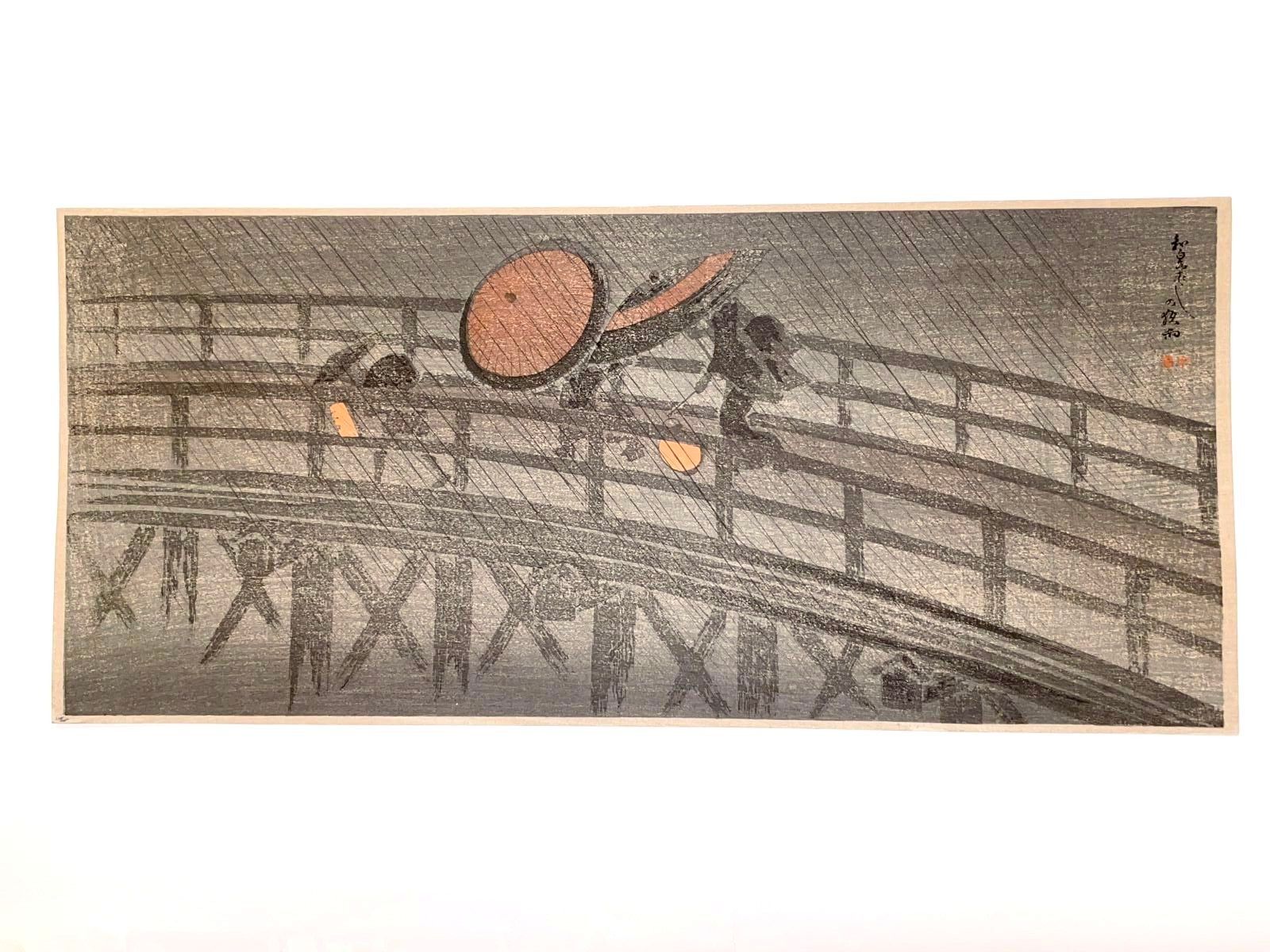 Print, otanzaku yoko-e, Izumi hashi no yoru ame (和泉橋の雨), Rainy evening on the Izumi bridge. Shotei stamp. Circa 1920 (Restoration.)