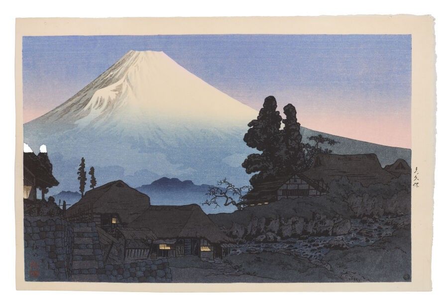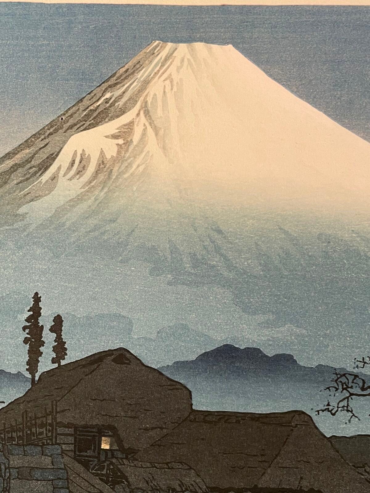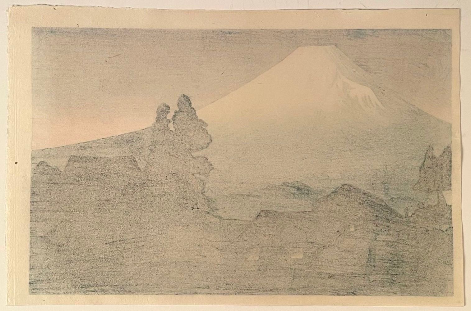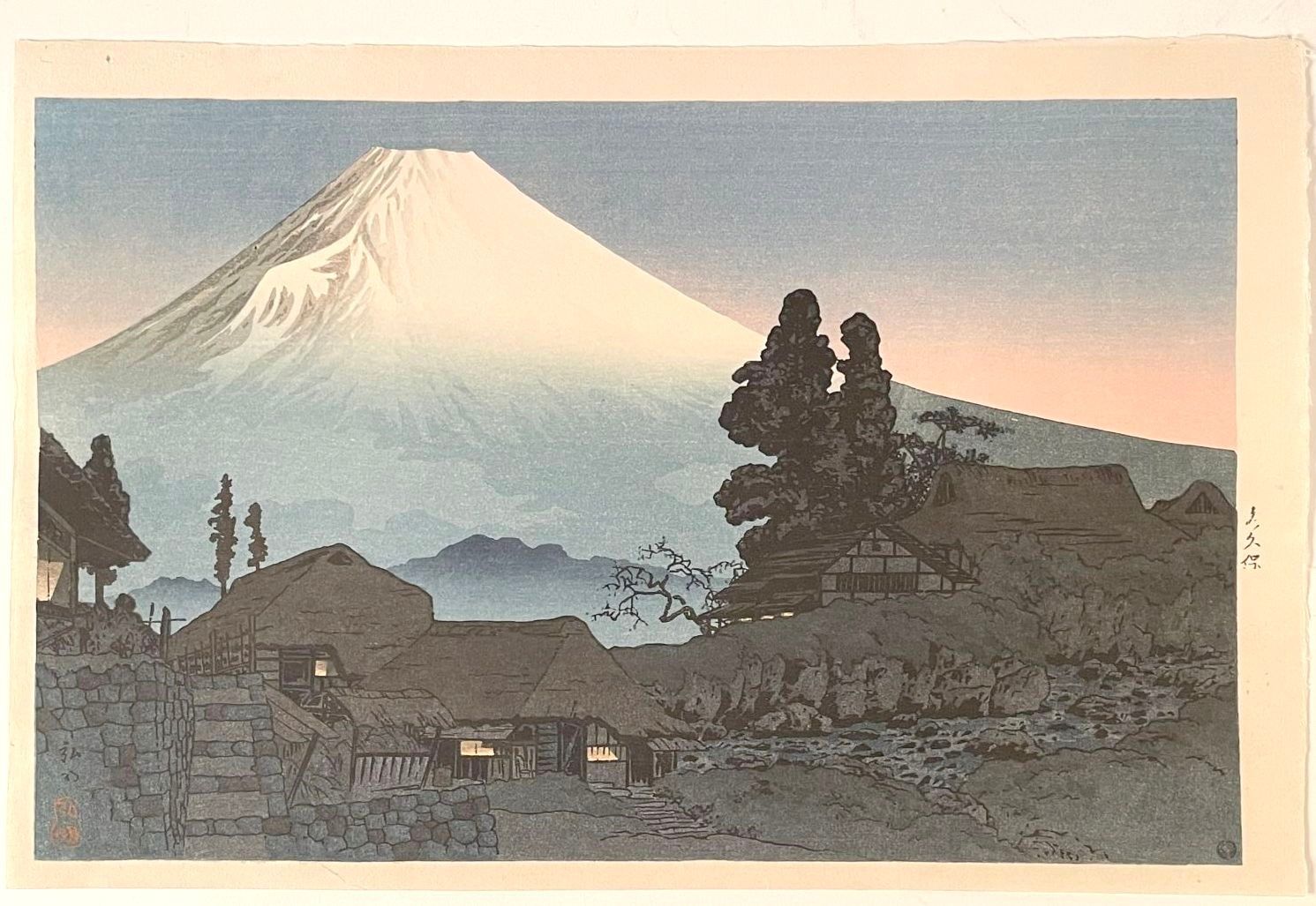 Print, oban yoko-e, Mizukubo (水久保) [Mount Fuji as seen from] Mizukubo. Signed Shotei and red stamp Hiroaki. Publisher Watanabe Shozaburo and round stamp in the plate. 1936.