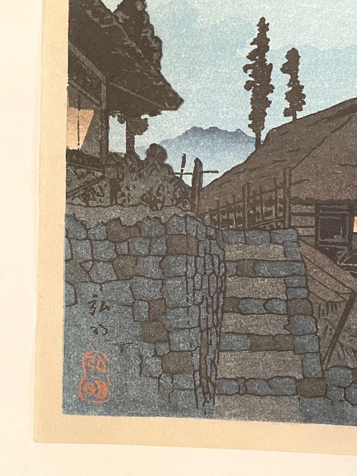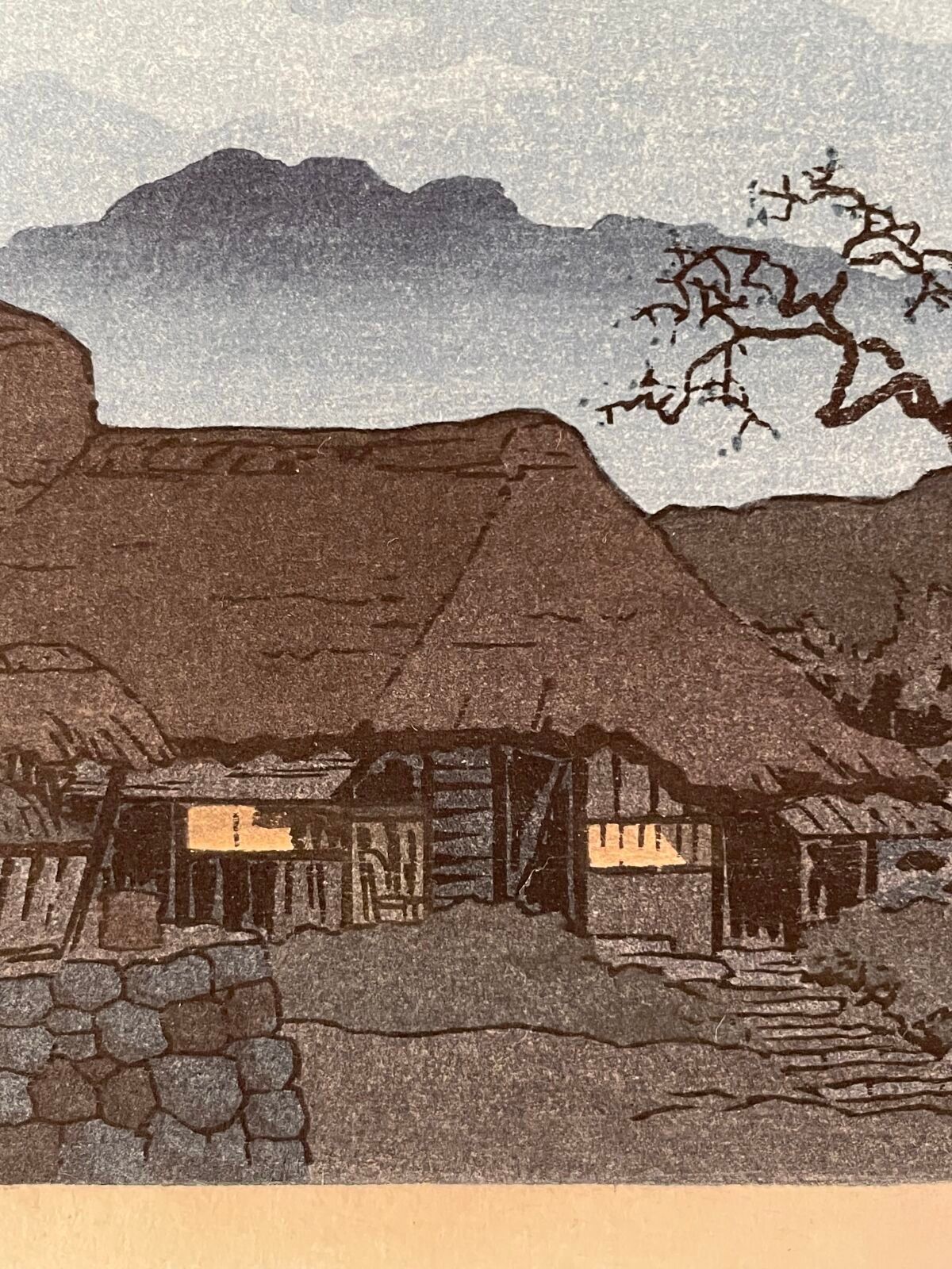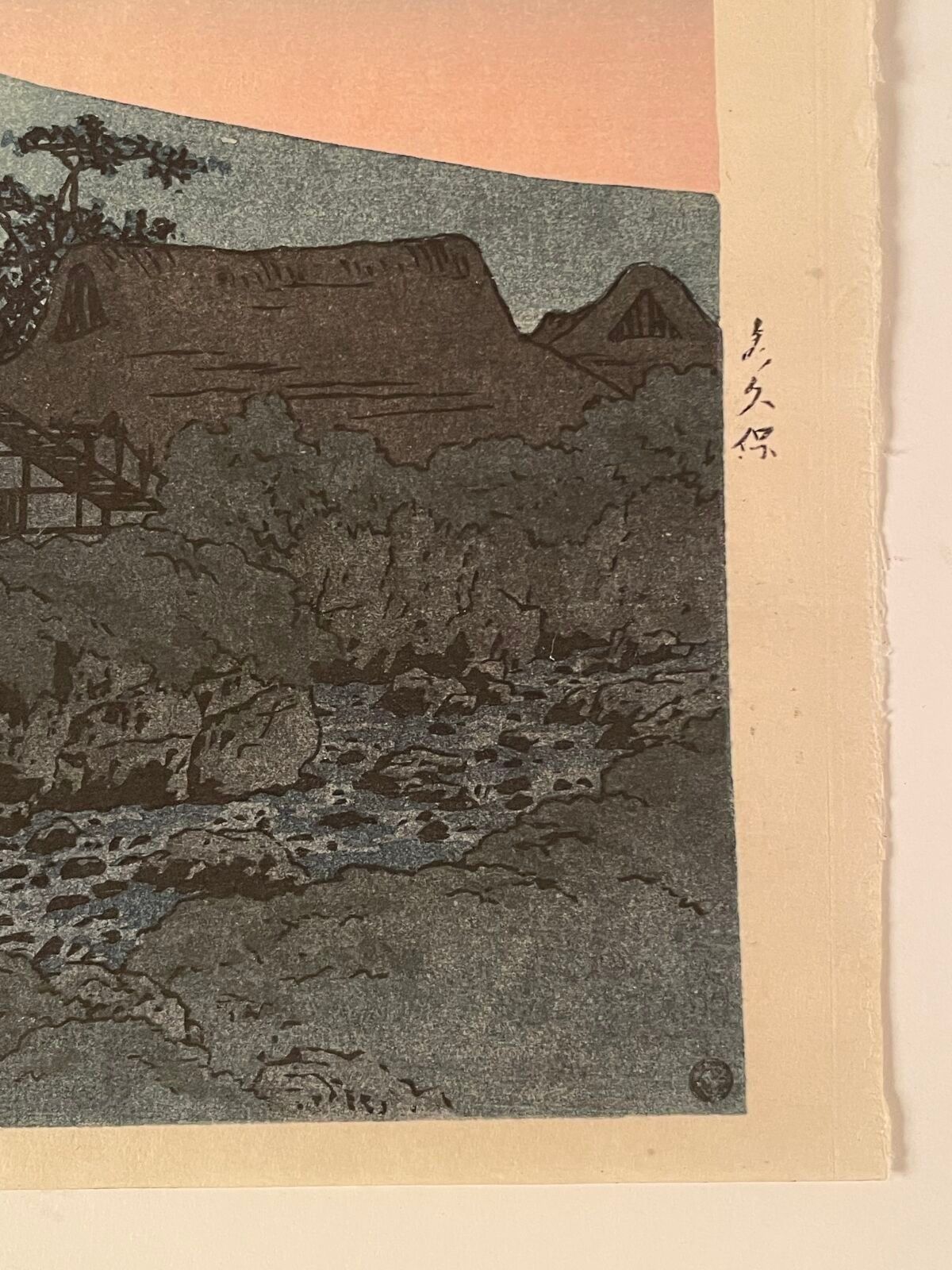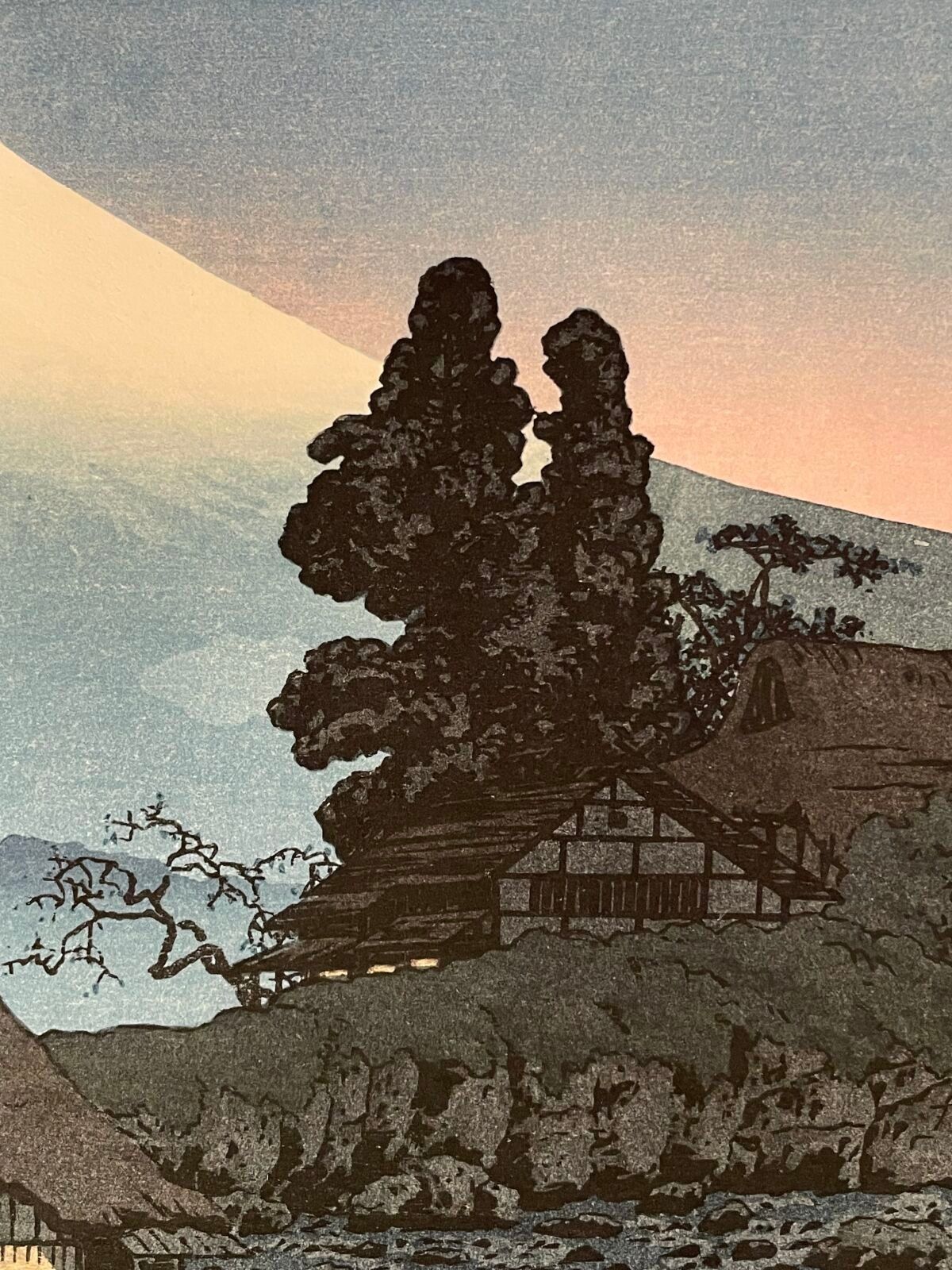 Print, oban yoko-e, Mizukubo (水久保) [Mount Fuji as seen from] Mizukubo. Signed Shotei and red stamp Hiroaki. Publisher Watanabe Shozaburo and round stamp in the plate. 1936.