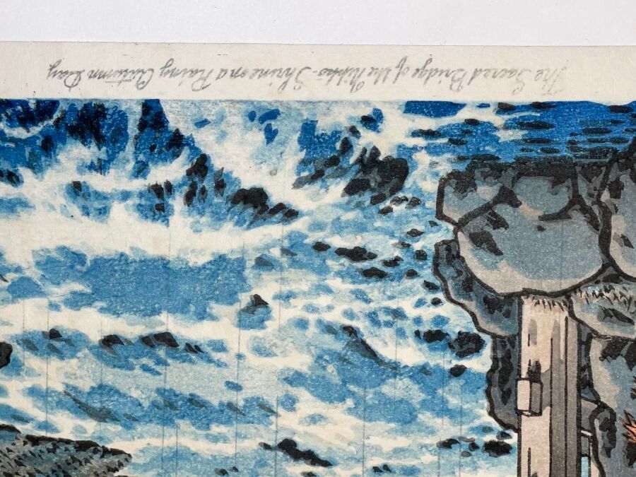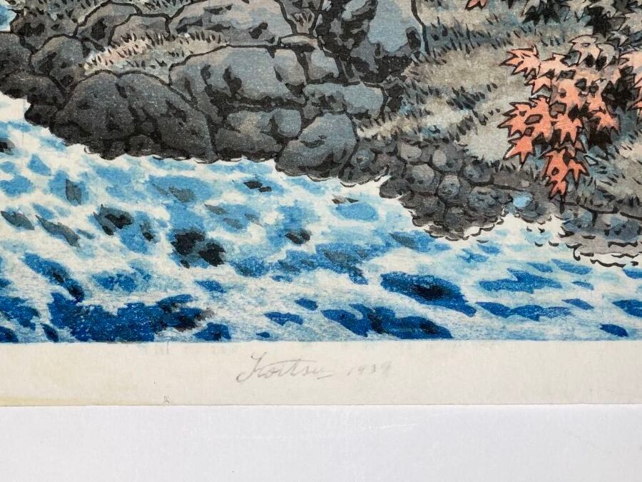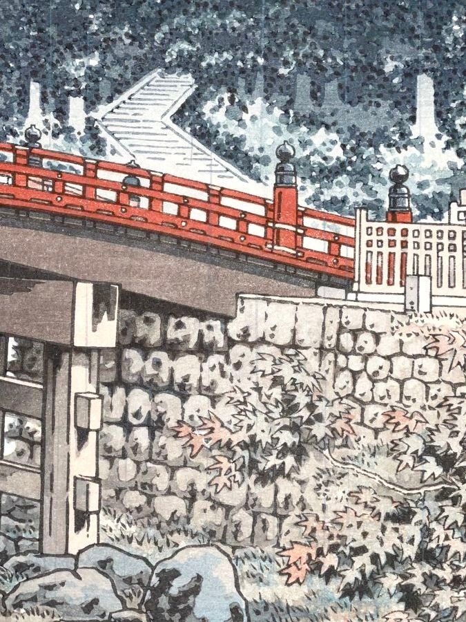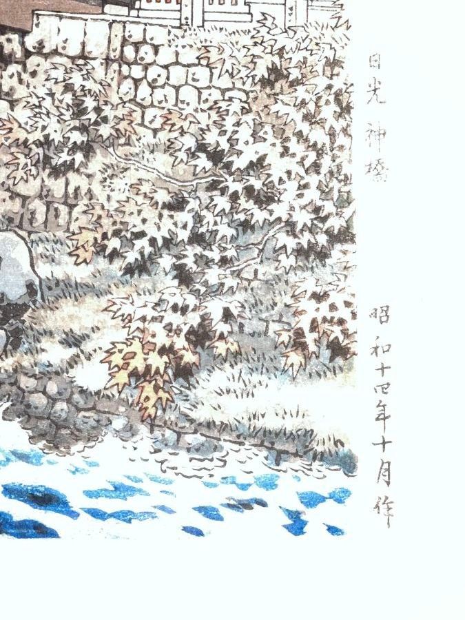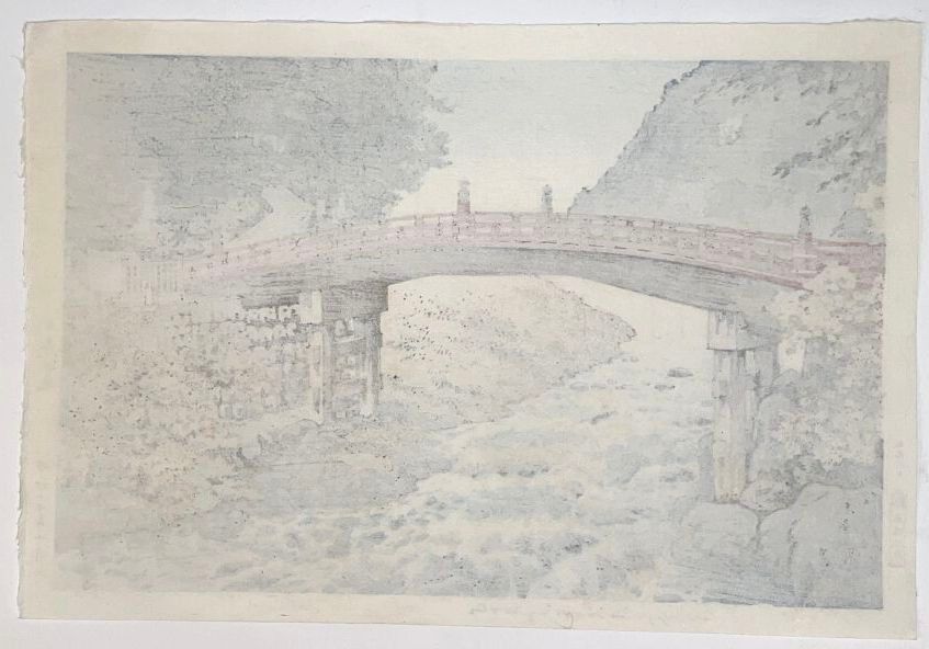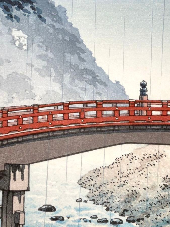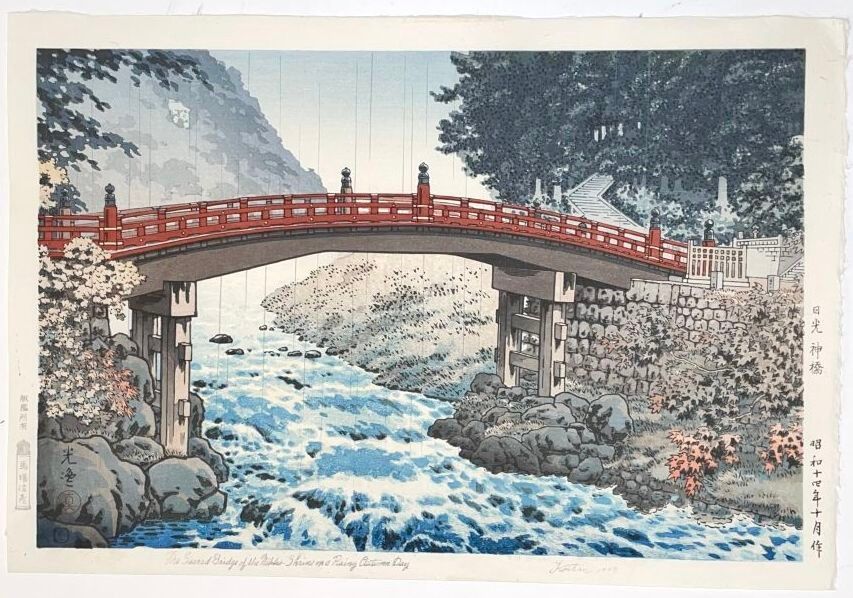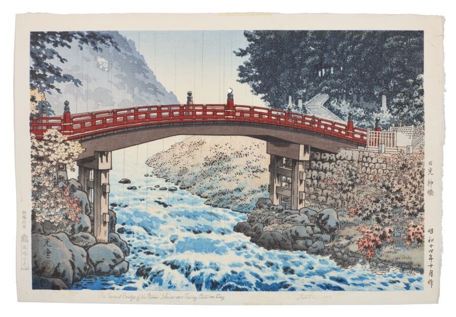 Print, oban yoko-e, Nikko Shinkyo (日光神橋), The sacred bridge of Nikko. Signed Koitsu and stamped Shin. Publisher's stamp Baba Nobuhiko in the left margin and lower left. Titled in the lower margin "The sacred bridge of the Nikko-Shrine on a rainy autumn day" and "Koitsu 193 9". Dated 10th month of Showa 14 (1939).