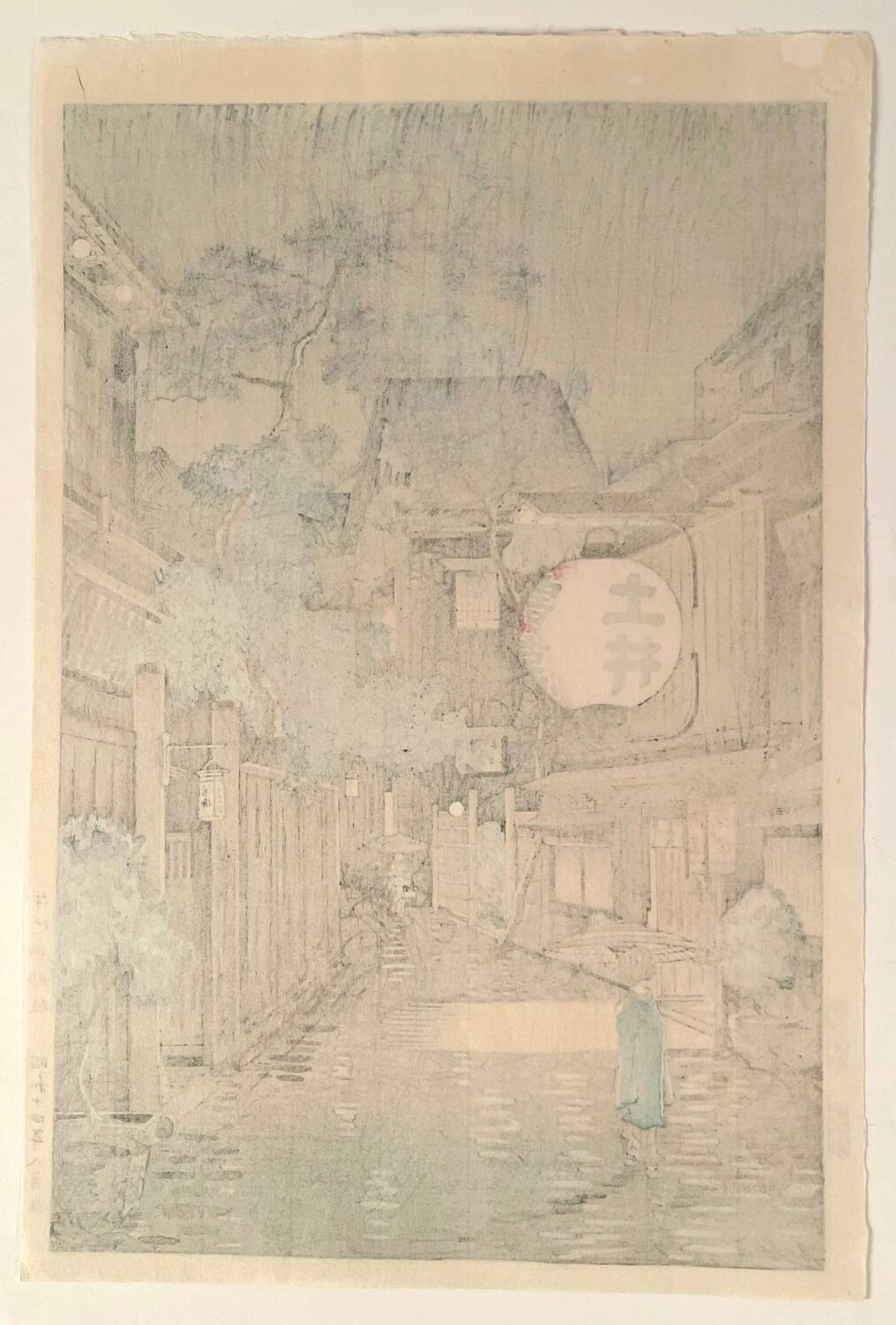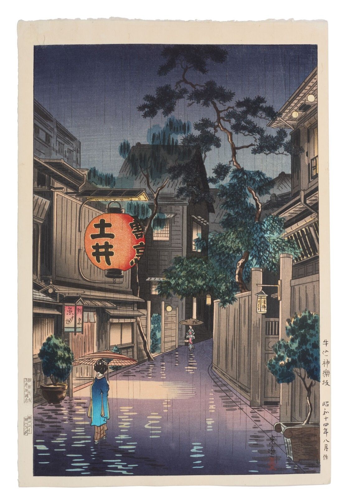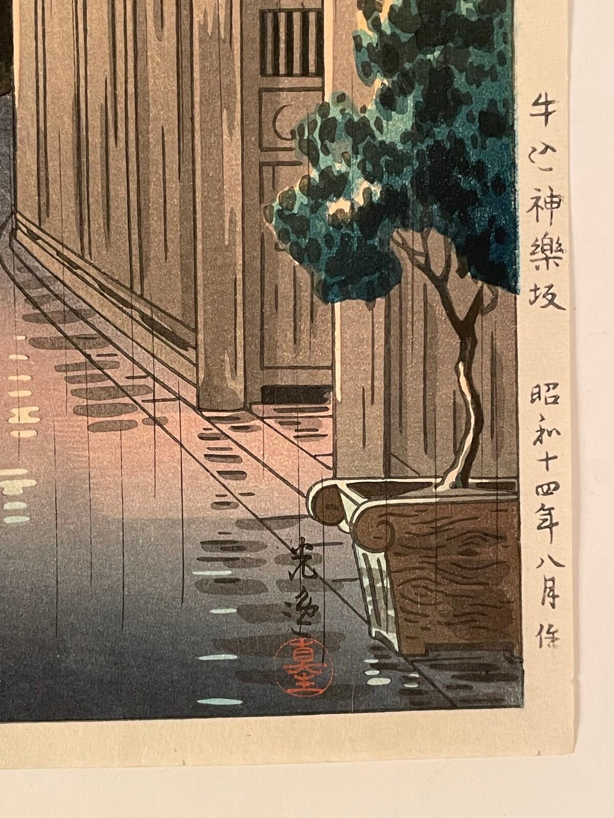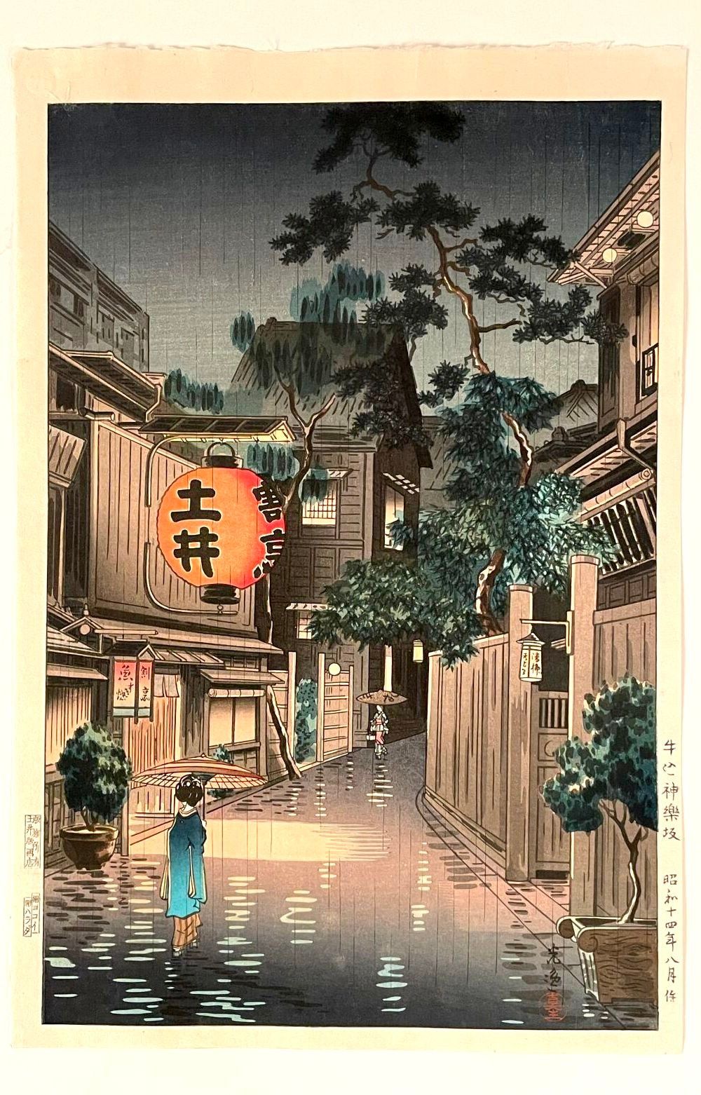 Print, oban tate-e, Ushigome kagurazaka (牛込神楽坂), Ushigome kagurazaka. Signed Koitsu and stamped Shinsei. Dated Showa 14 (1936). Publisher's stamp of Doi Hangaten, engraver Harada and printer Yokoi, watermark Do top left. Posthumous edition 1950-1963.