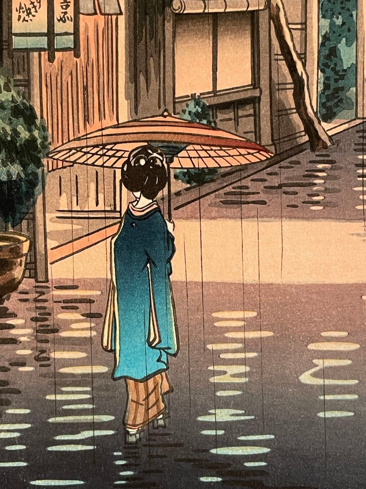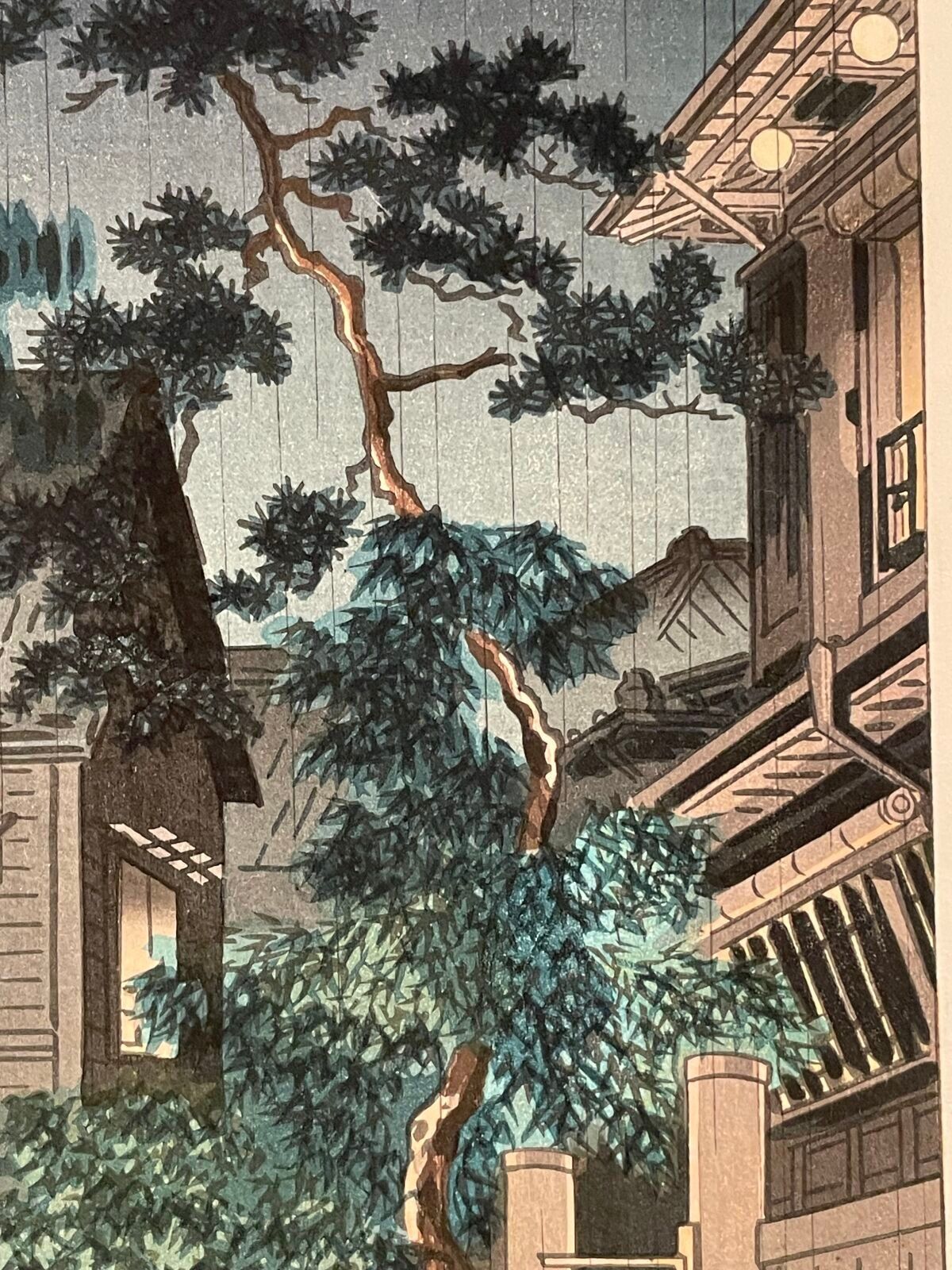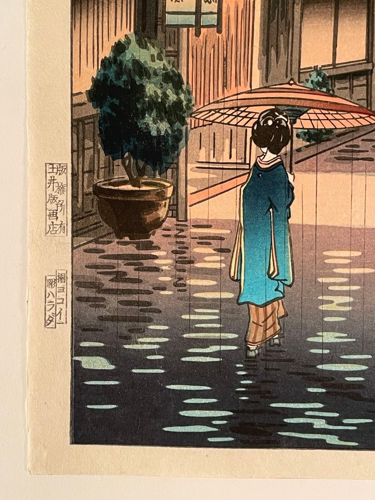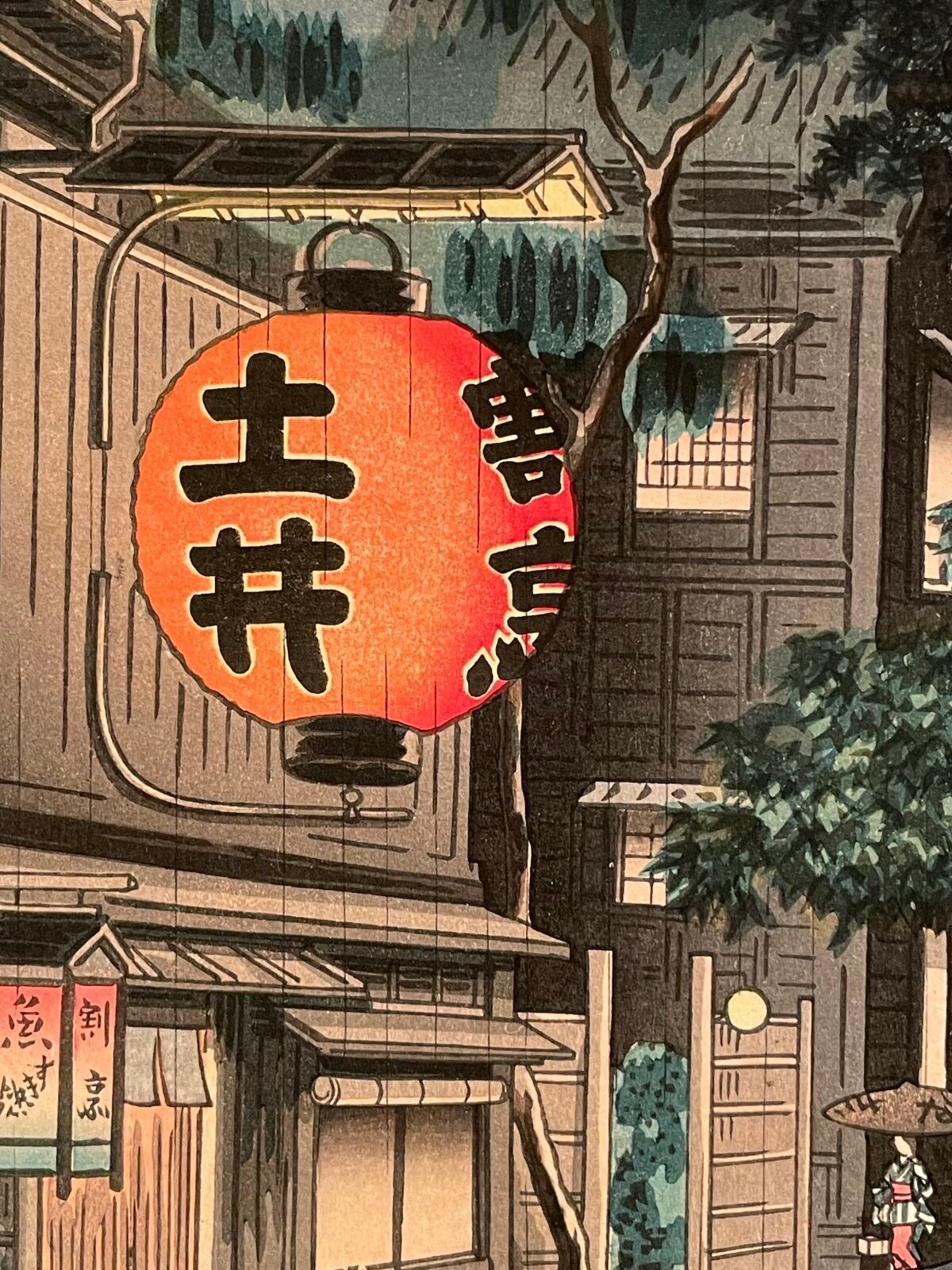 Print, oban tate-e, Ushigome kagurazaka (牛込神楽坂), Ushigome kagurazaka. Signed Koitsu and stamped Shinsei. Dated Showa 14 (1936). Publisher's stamp of Doi Hangaten, engraver Harada and printer Yokoi, watermark Do top left. Posthumous edition 1950-1963.