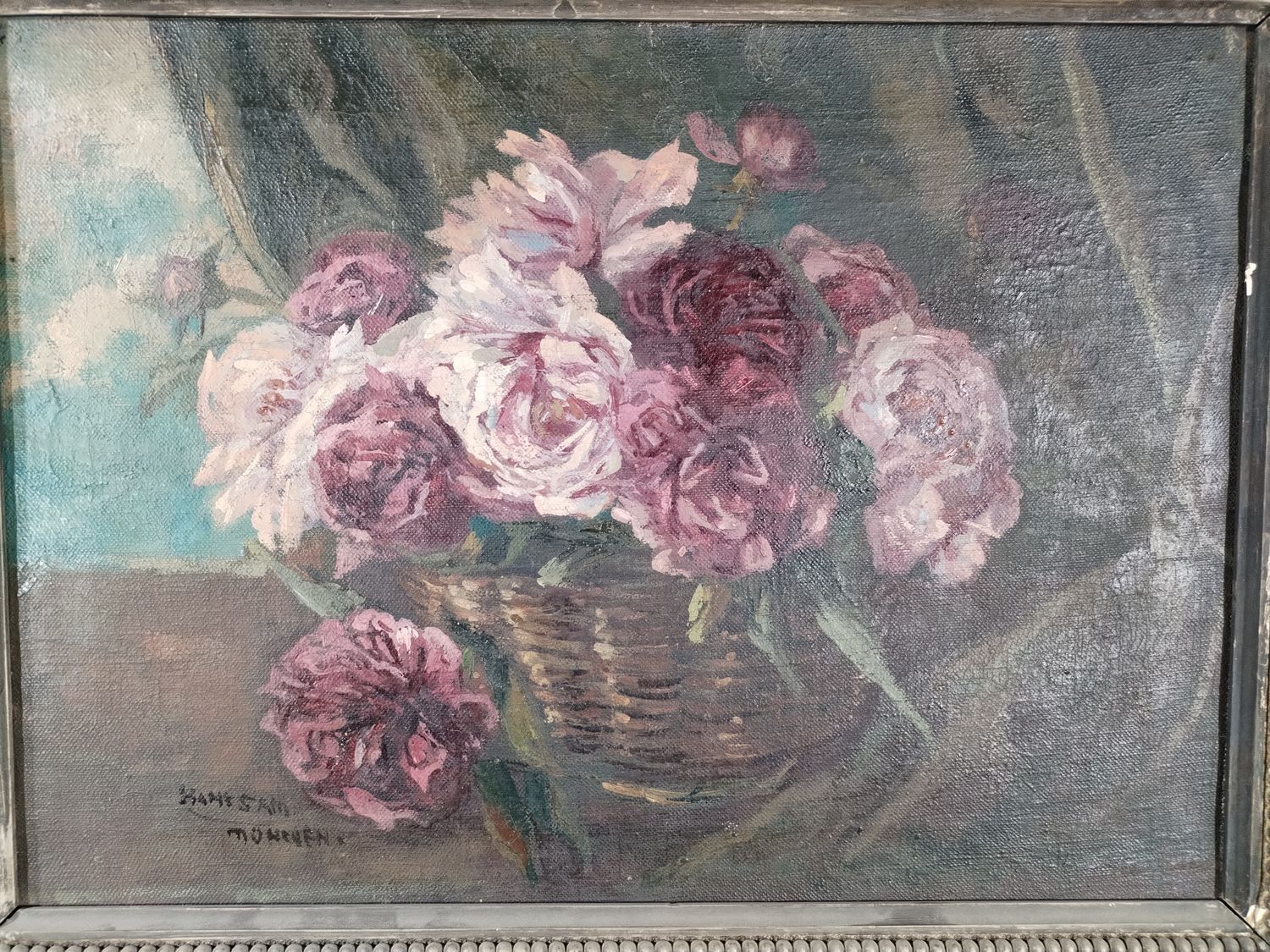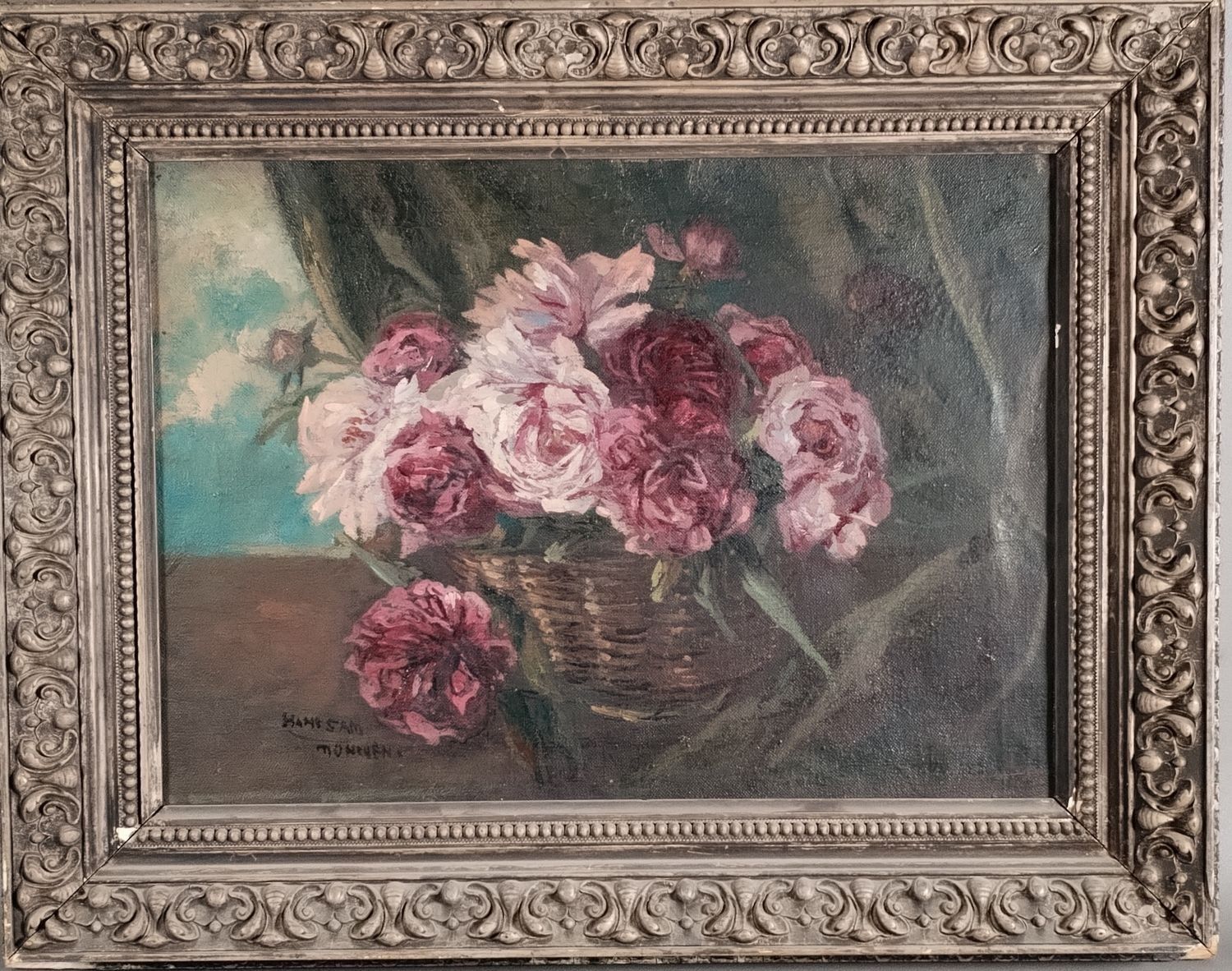HAMTSAM. Oil on canvas. "Bouquet of roses in a basket".