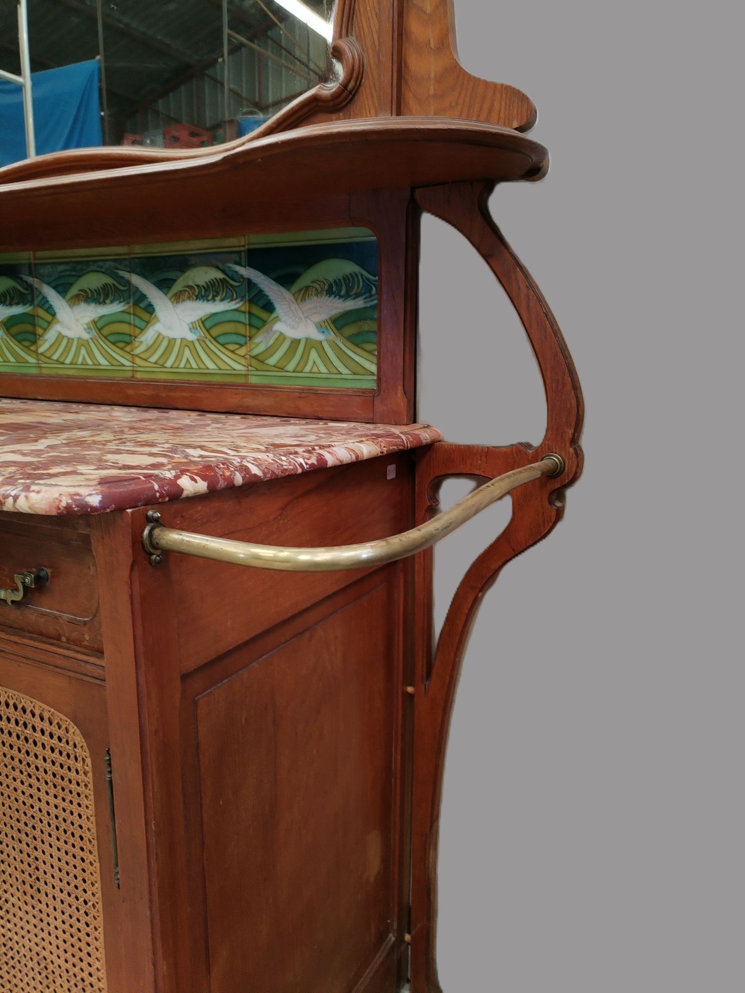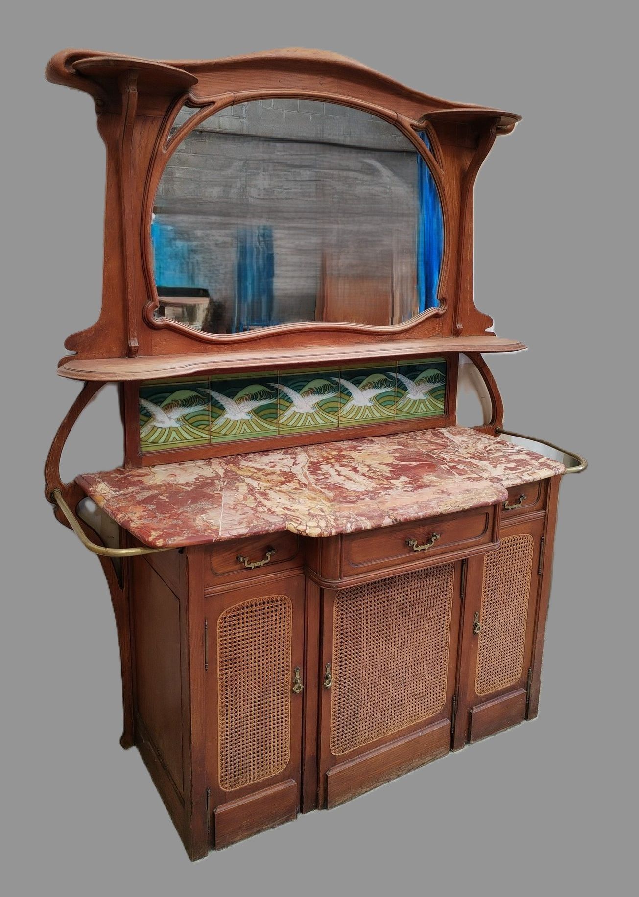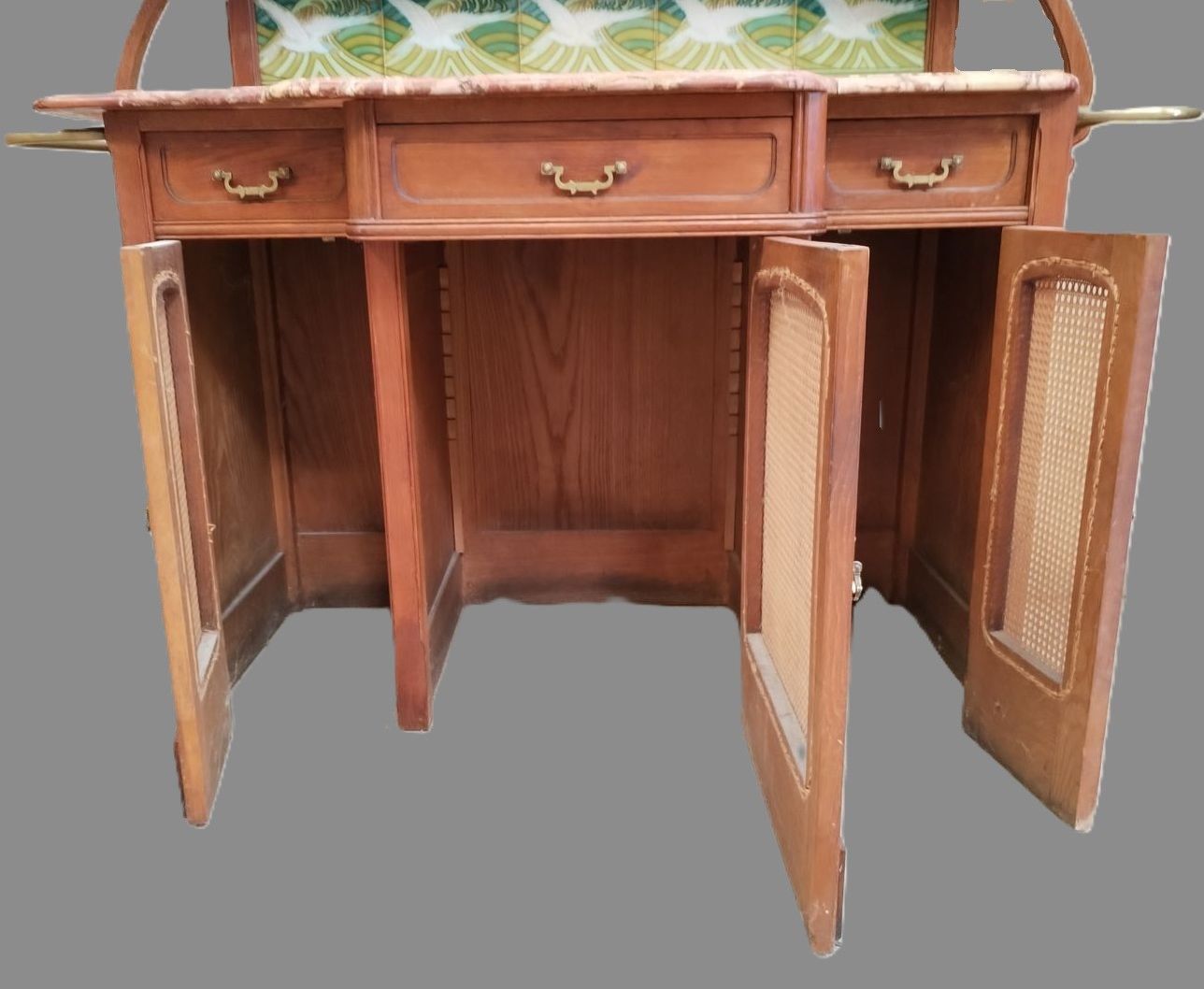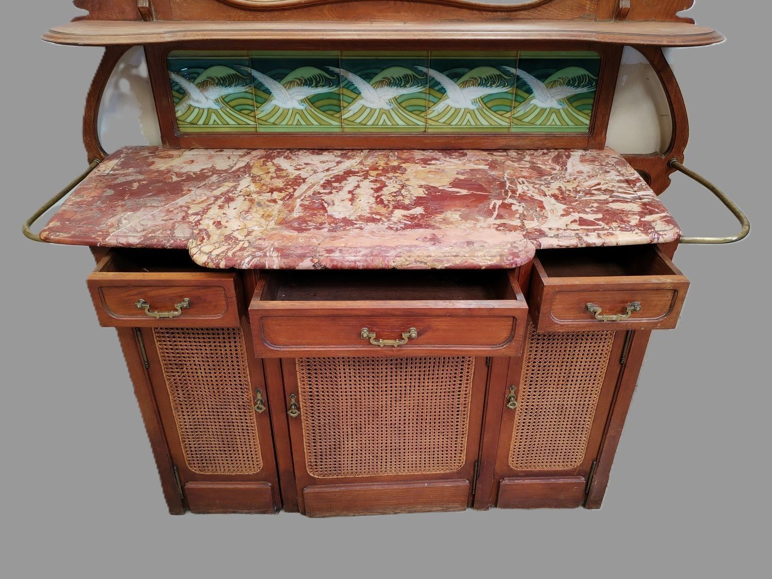 Walnut sideboard with two parts, the entablature in veined red marble; it has a frieze of birds in earthenware tiles, three doors and three drawers; the upper part is veneered with a mirror.