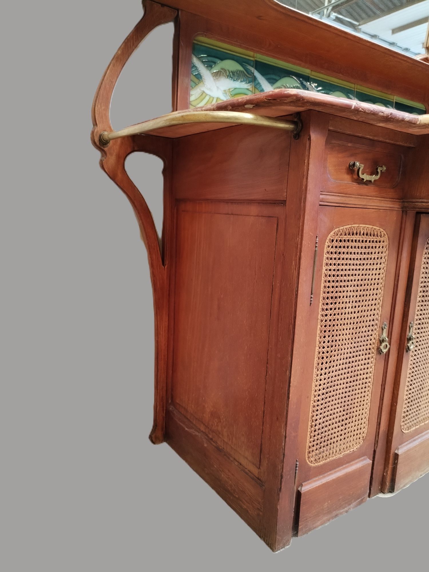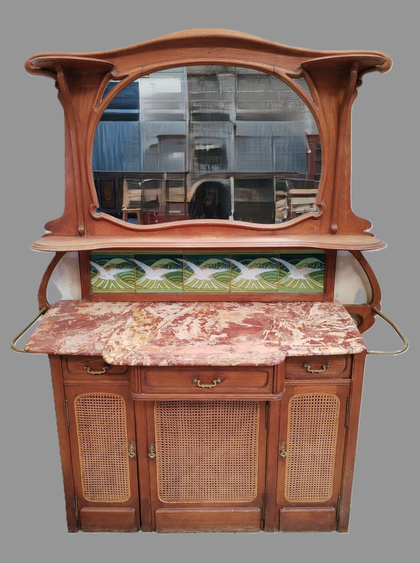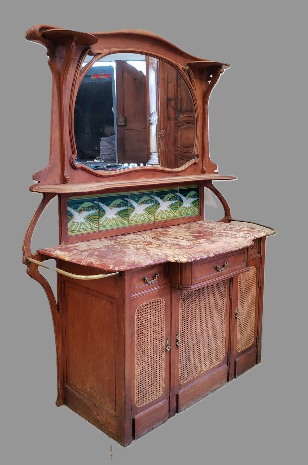 Walnut sideboard with two parts, the entablature in veined red marble; it has a frieze of birds in earthenware tiles, three doors and three drawers; the upper part is veneered with a mirror.