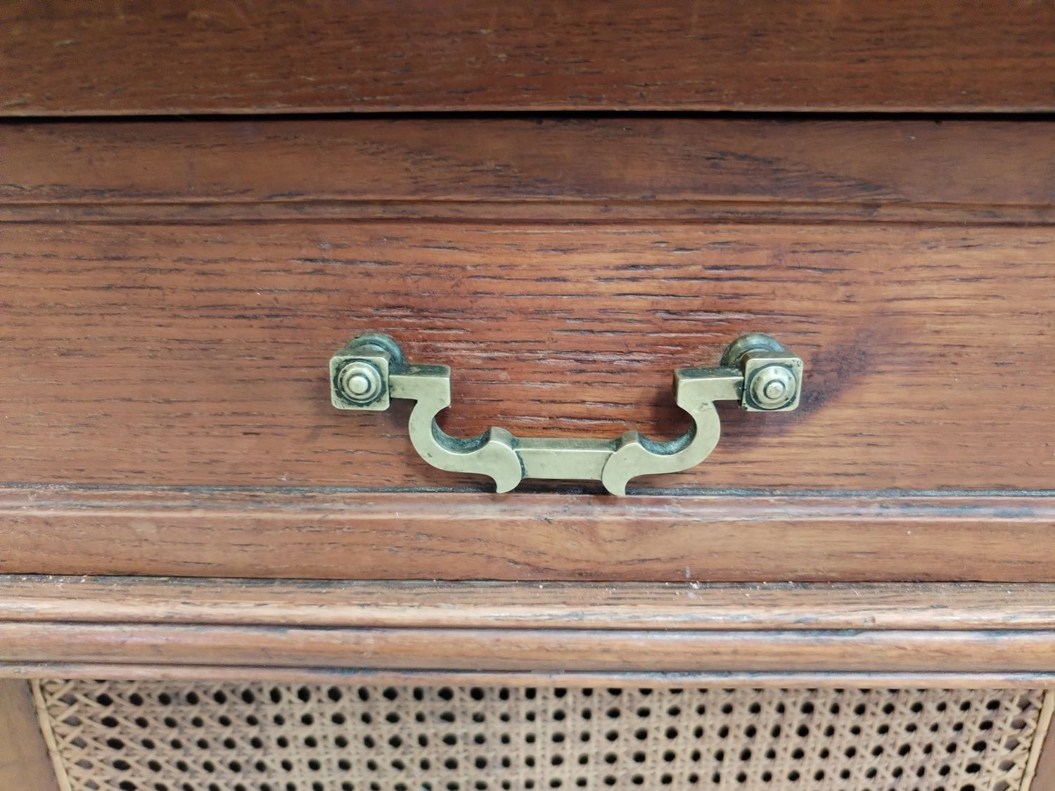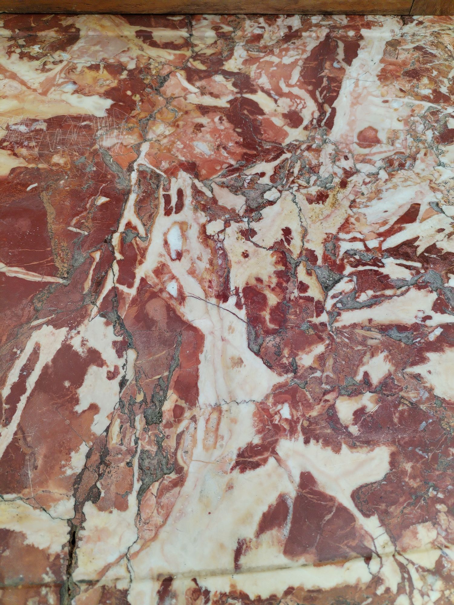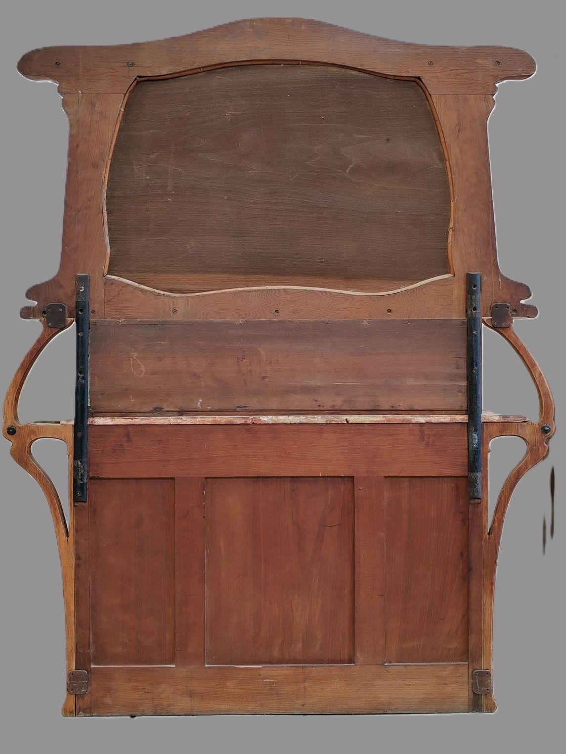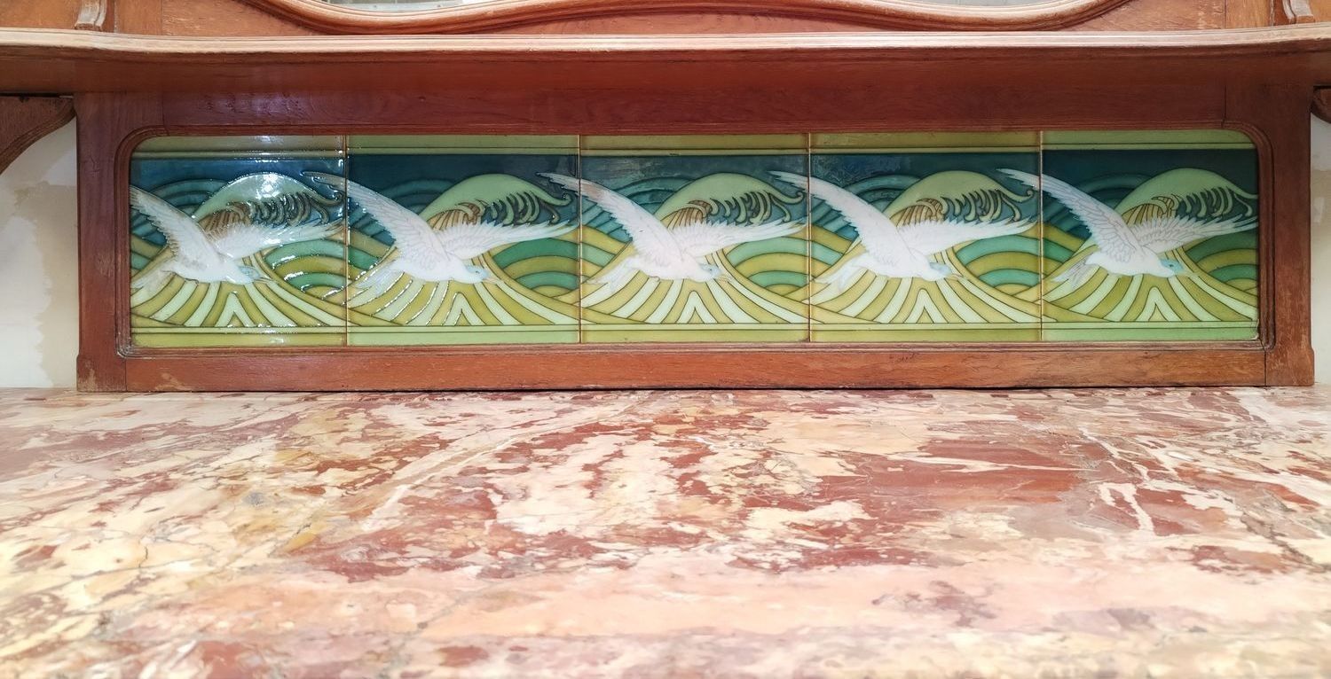 Walnut sideboard with two parts, the entablature in veined red marble; it has a frieze of birds in earthenware tiles, three doors and three drawers; the upper part is veneered with a mirror.