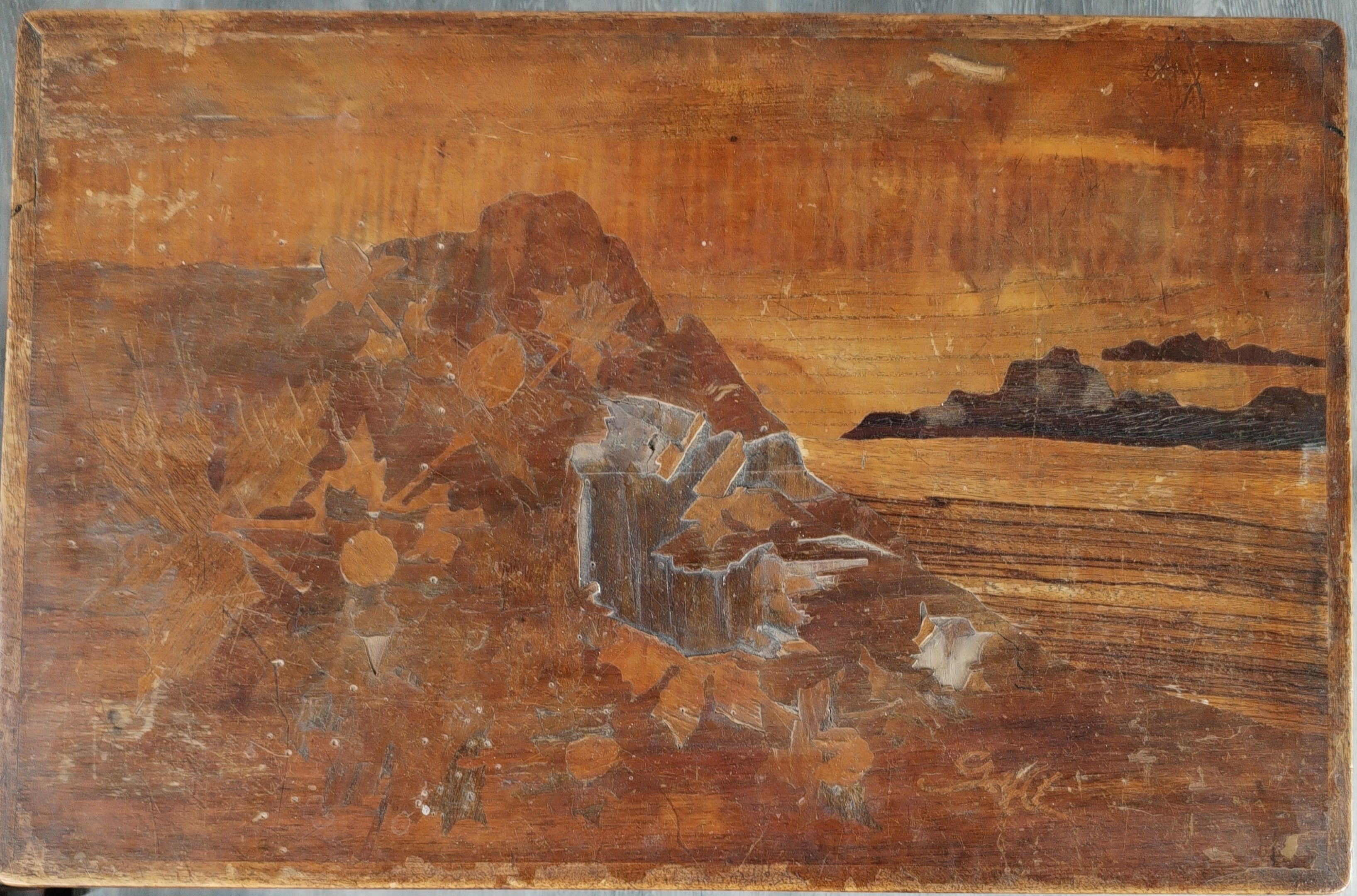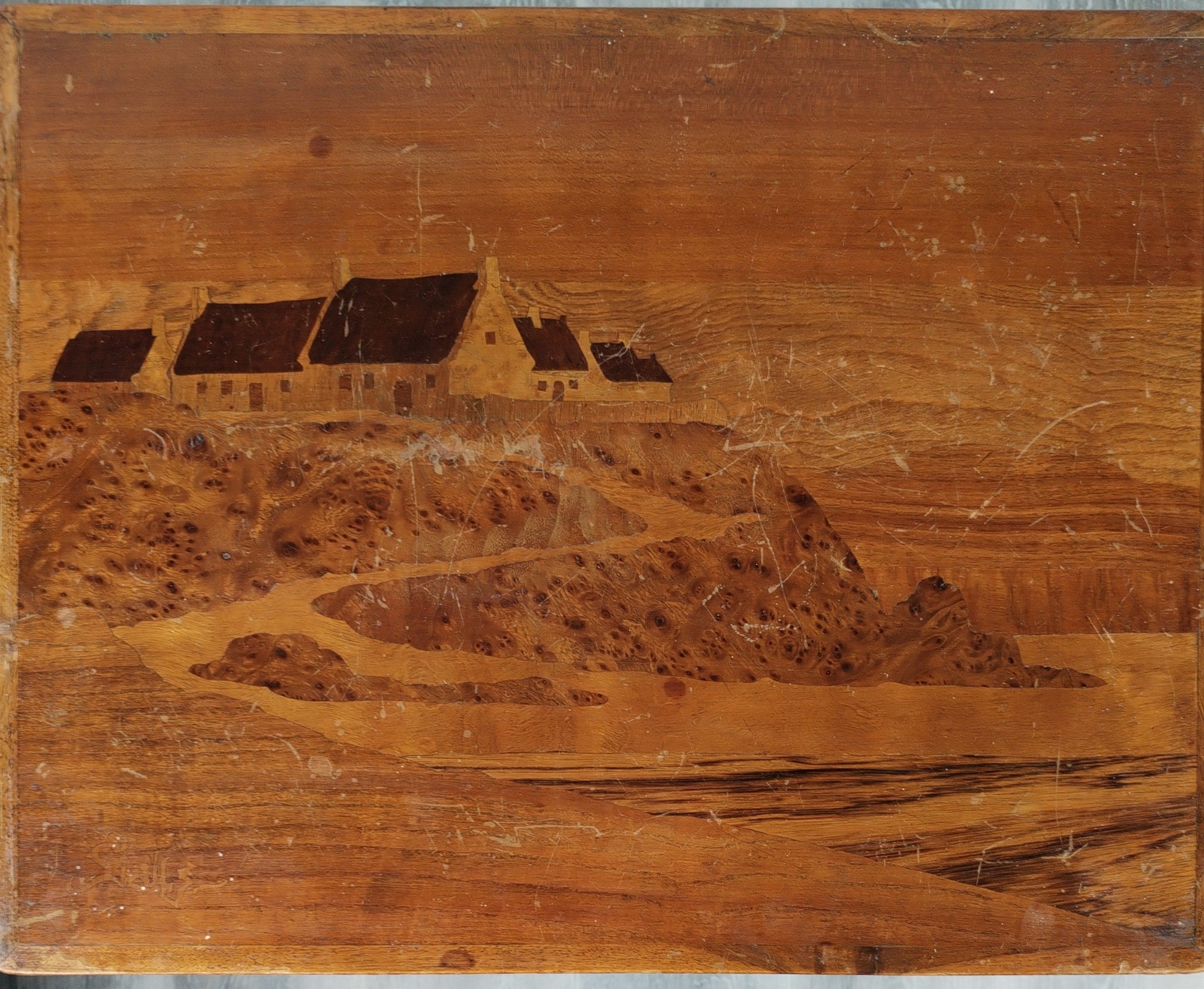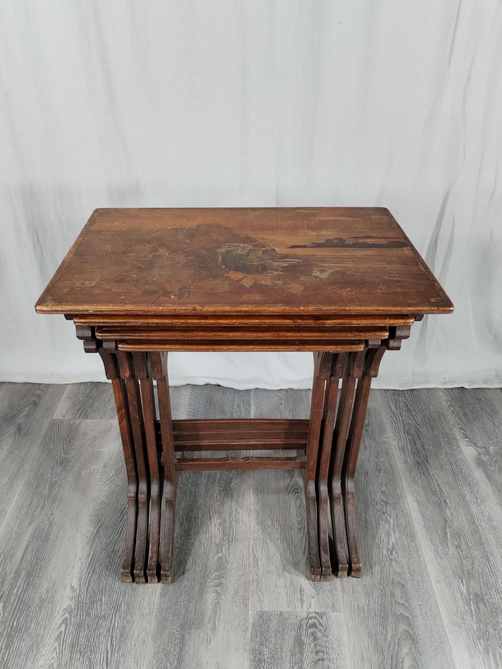 Set of 4 beechwood nesting tables with tops inlaid with a branch of thistle on a background of rocks.