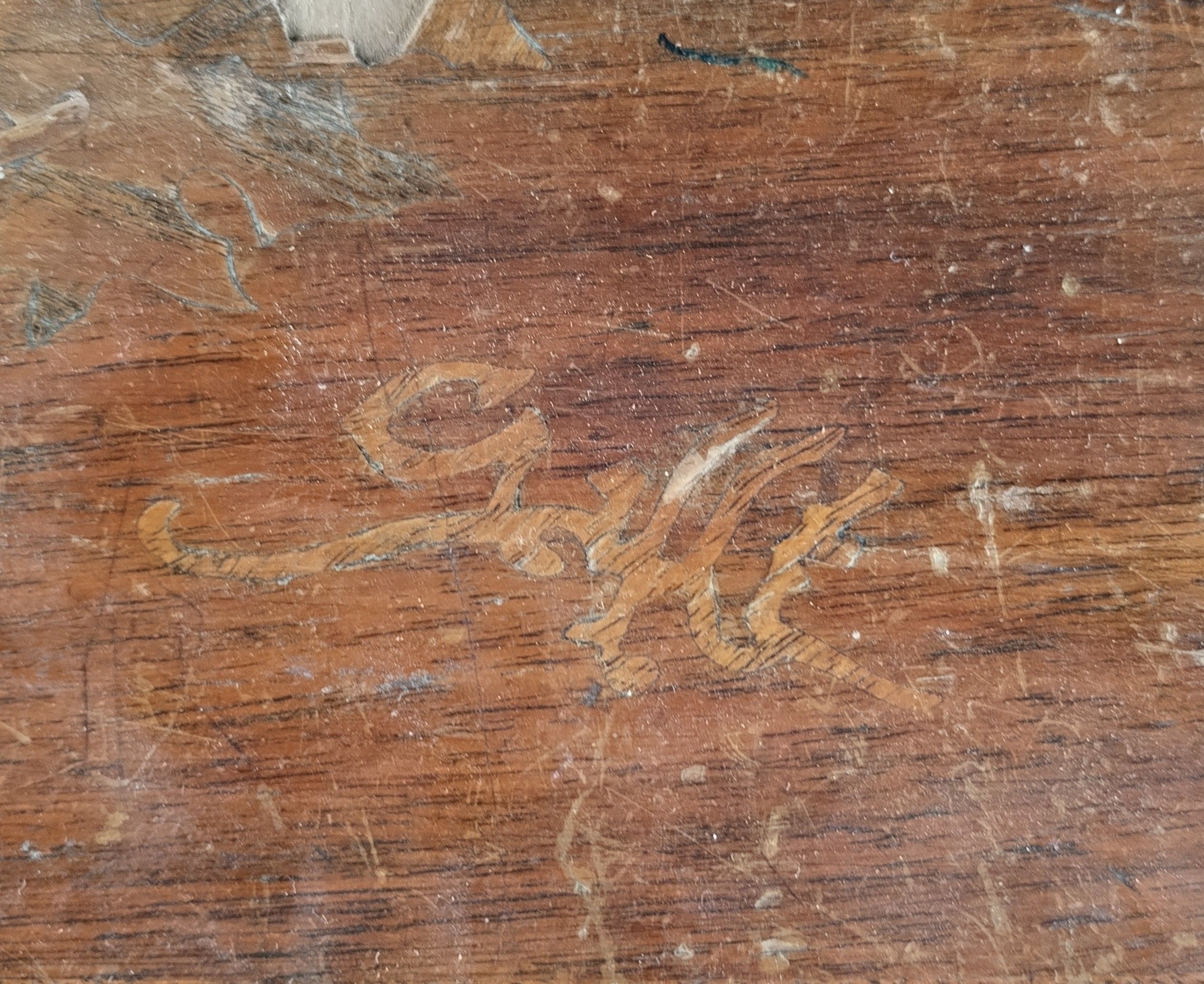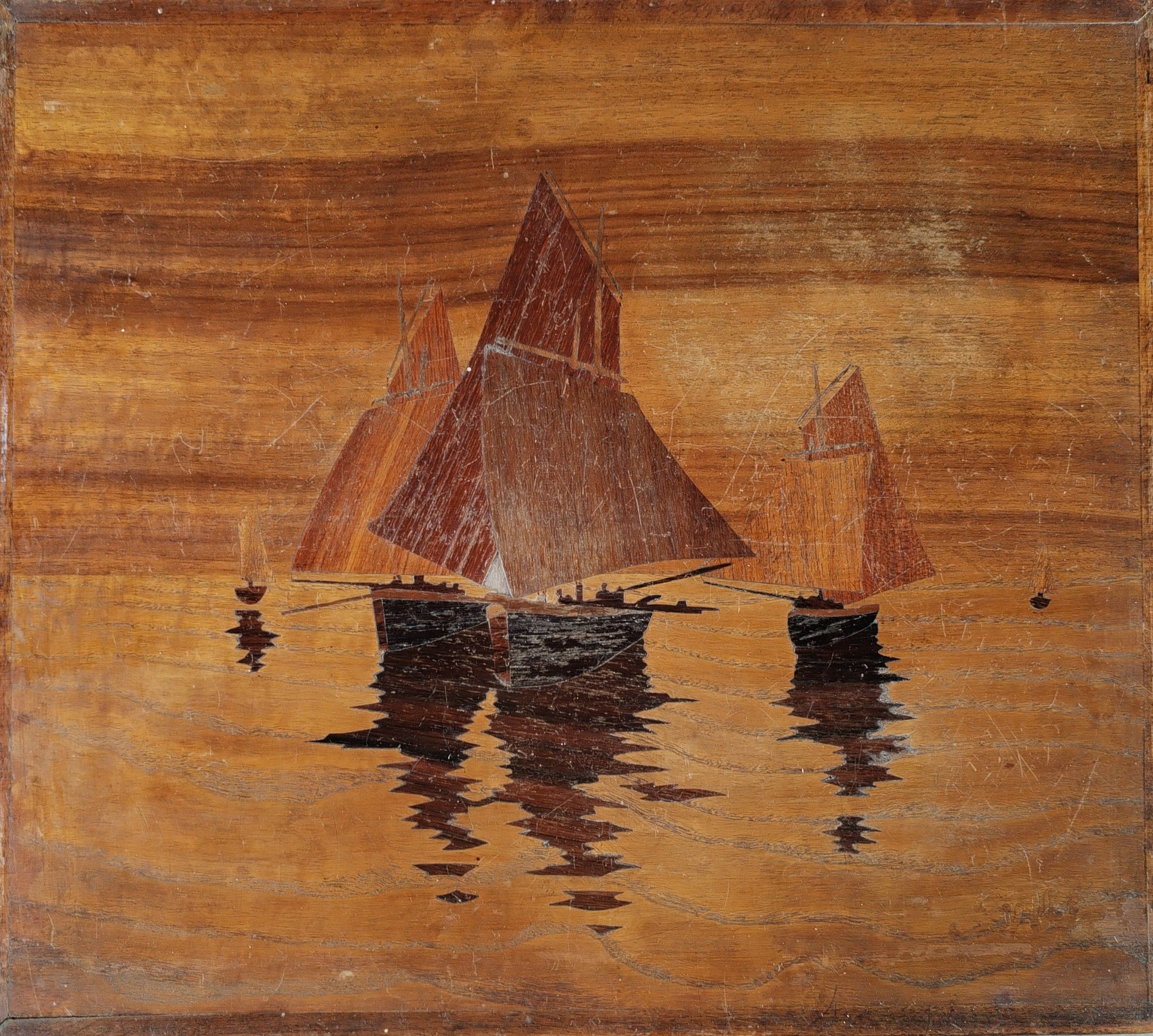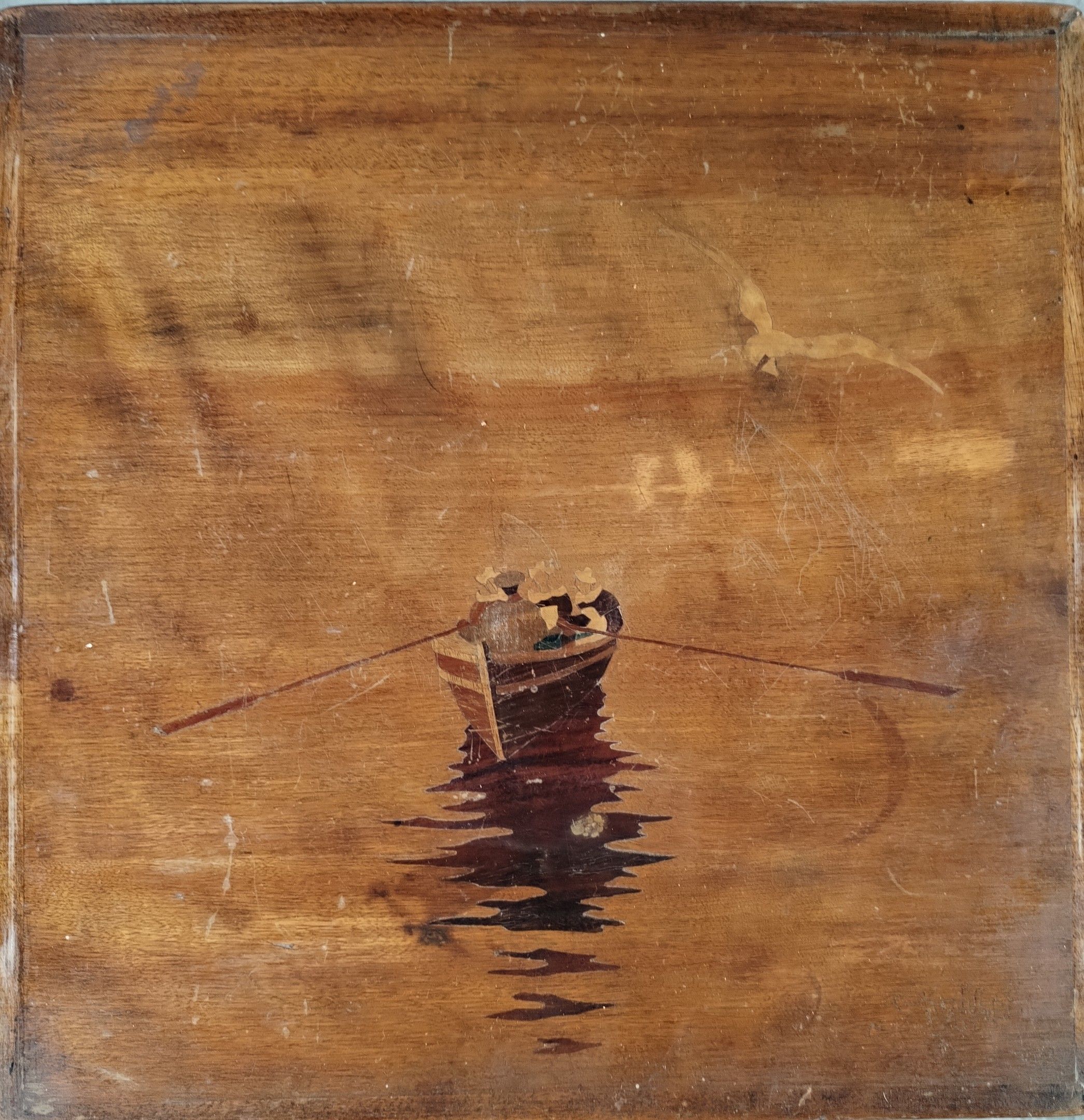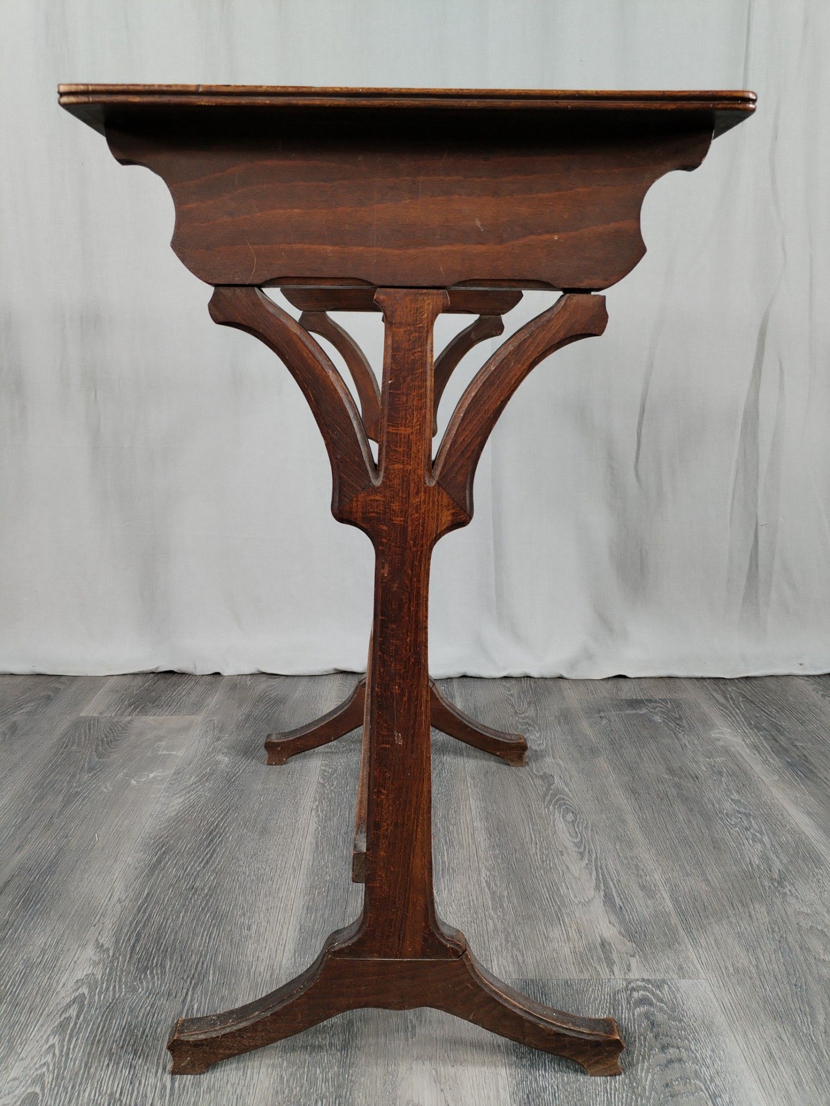 Set of 4 beechwood nesting tables with tops inlaid with a branch of thistle on a background of rocks.