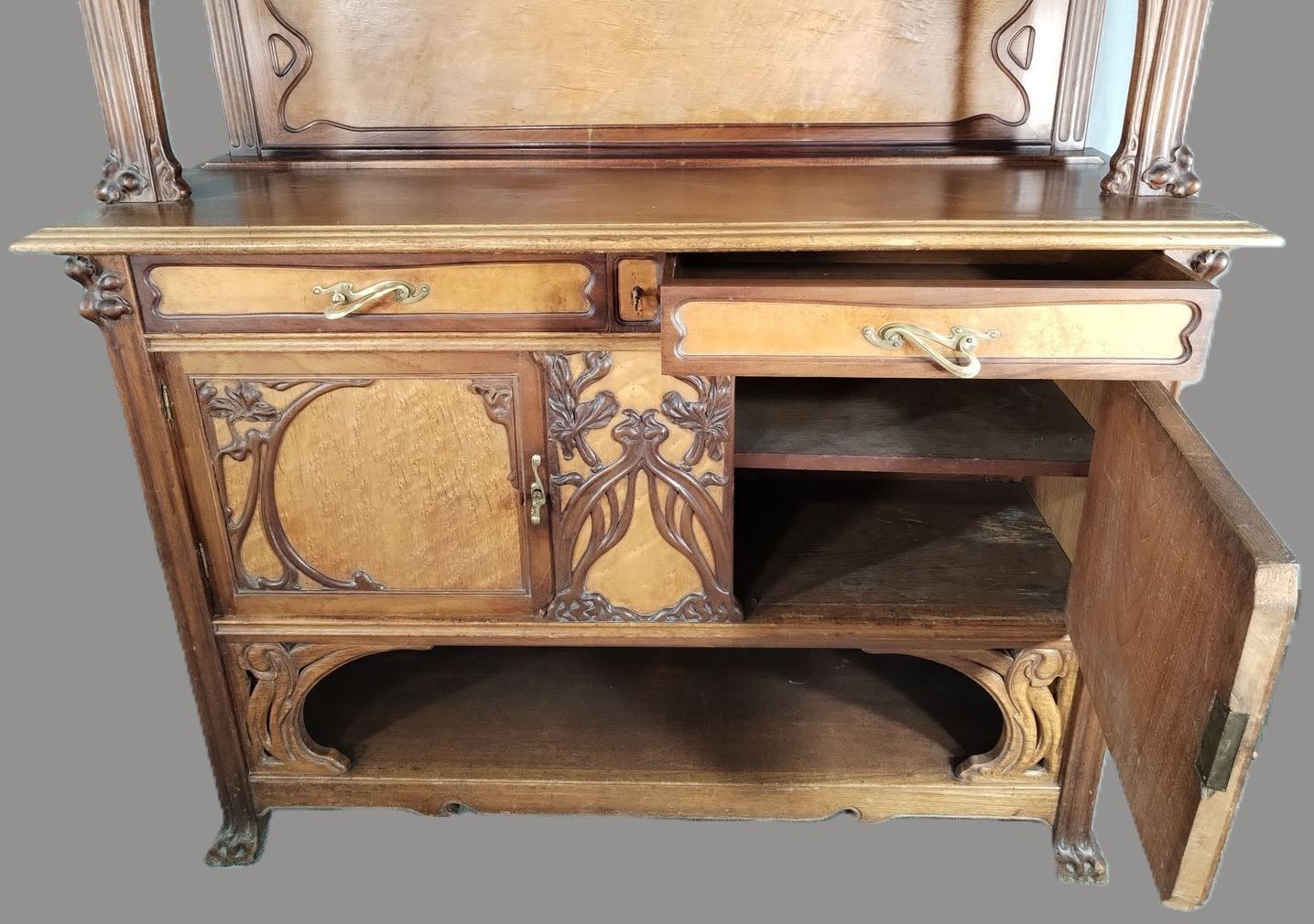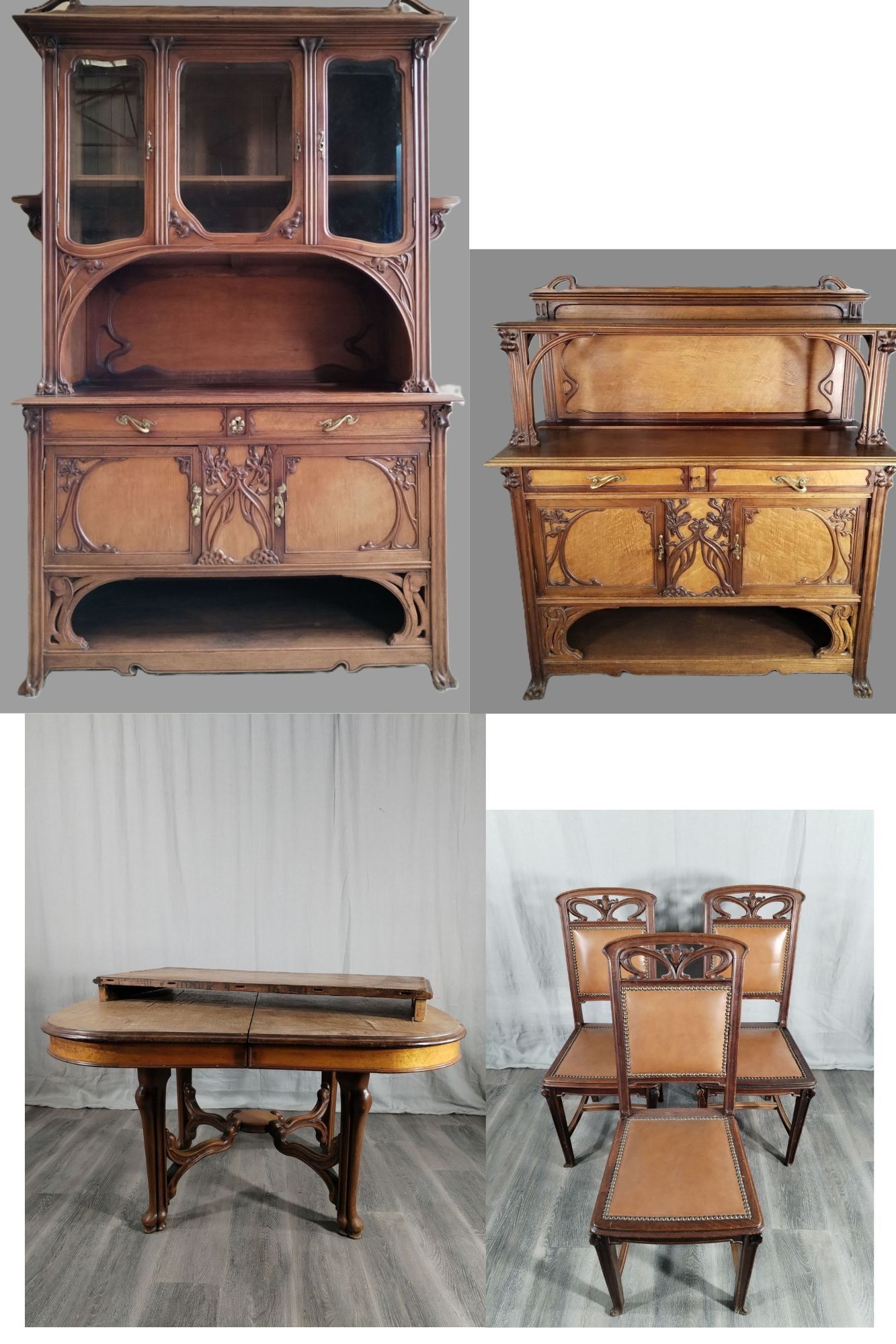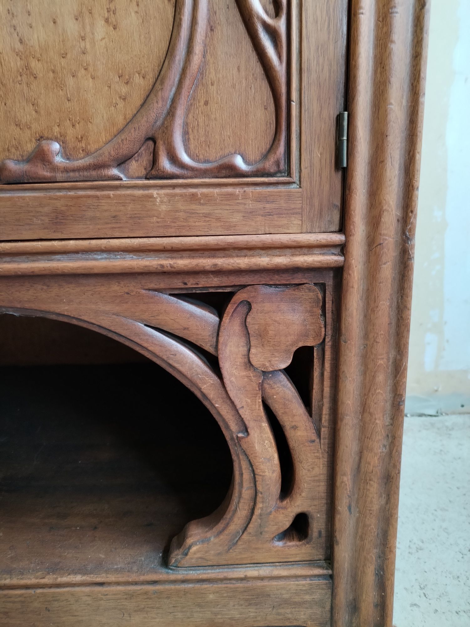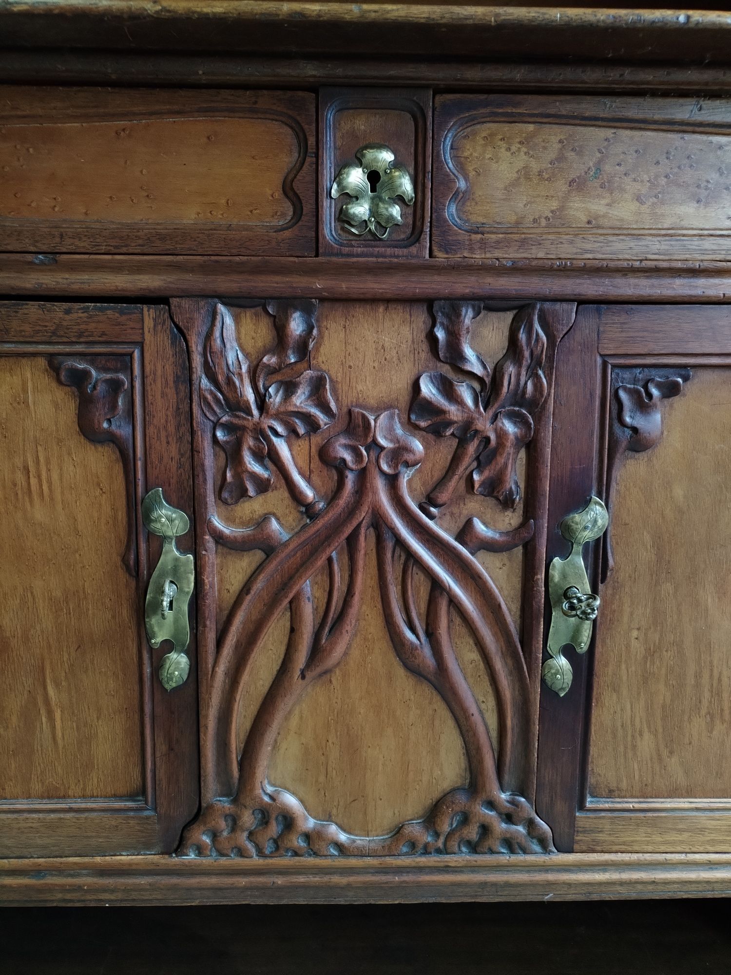 Walnut and ash veneer dining room, decorated with branches and buds. The gilt brass handles are carved with scrolls.