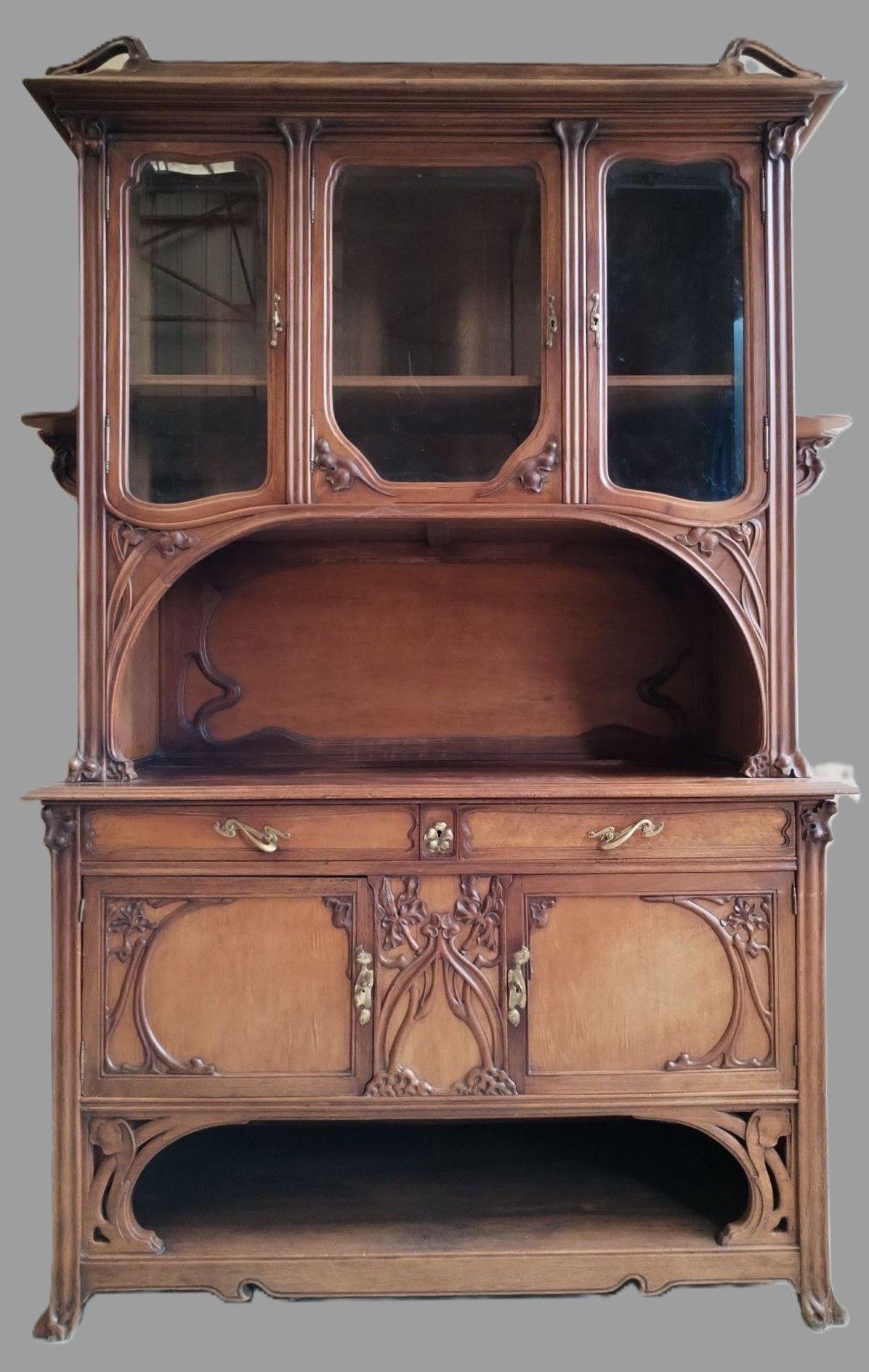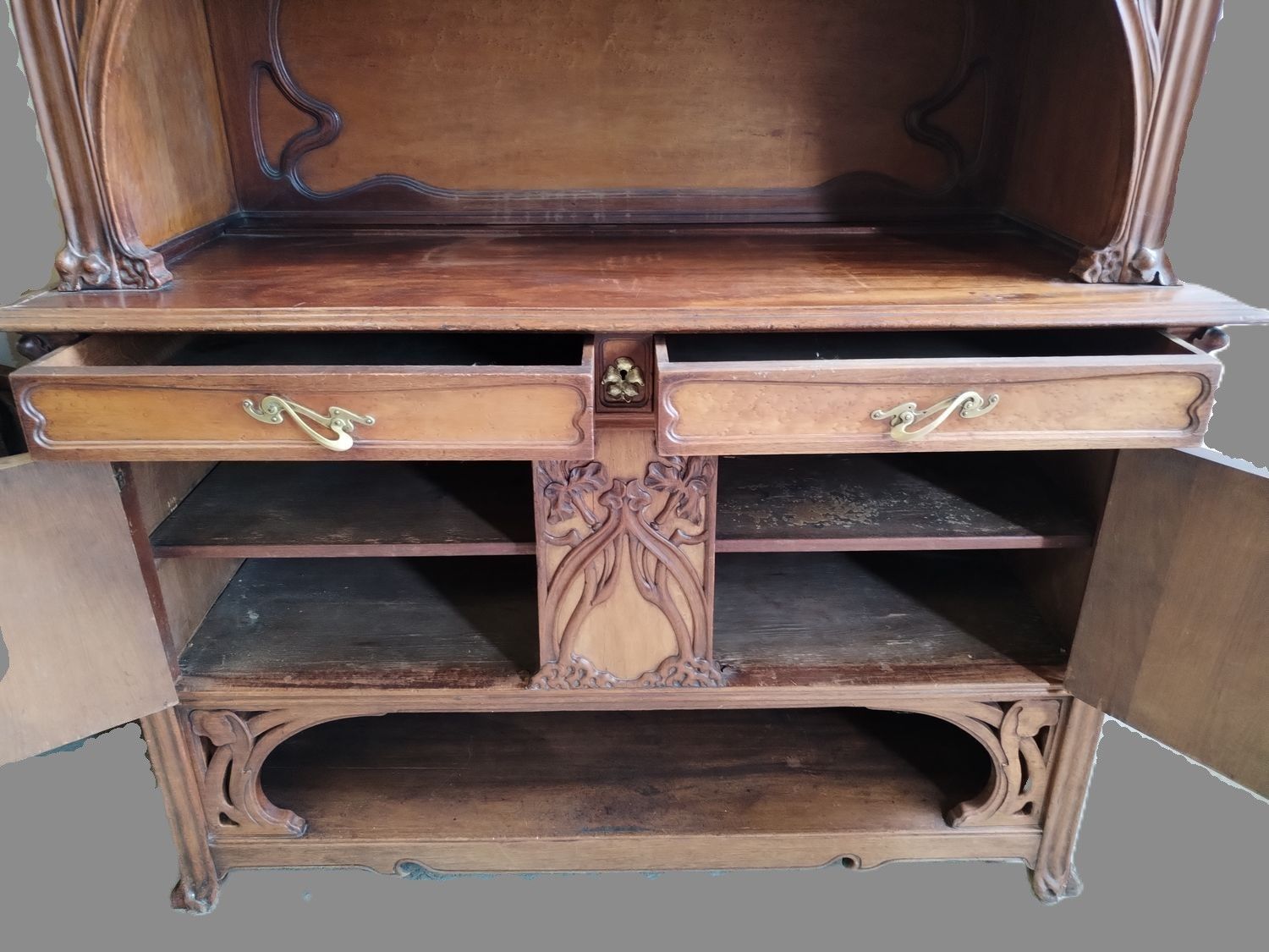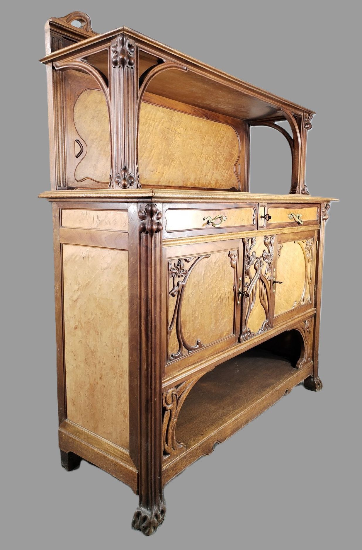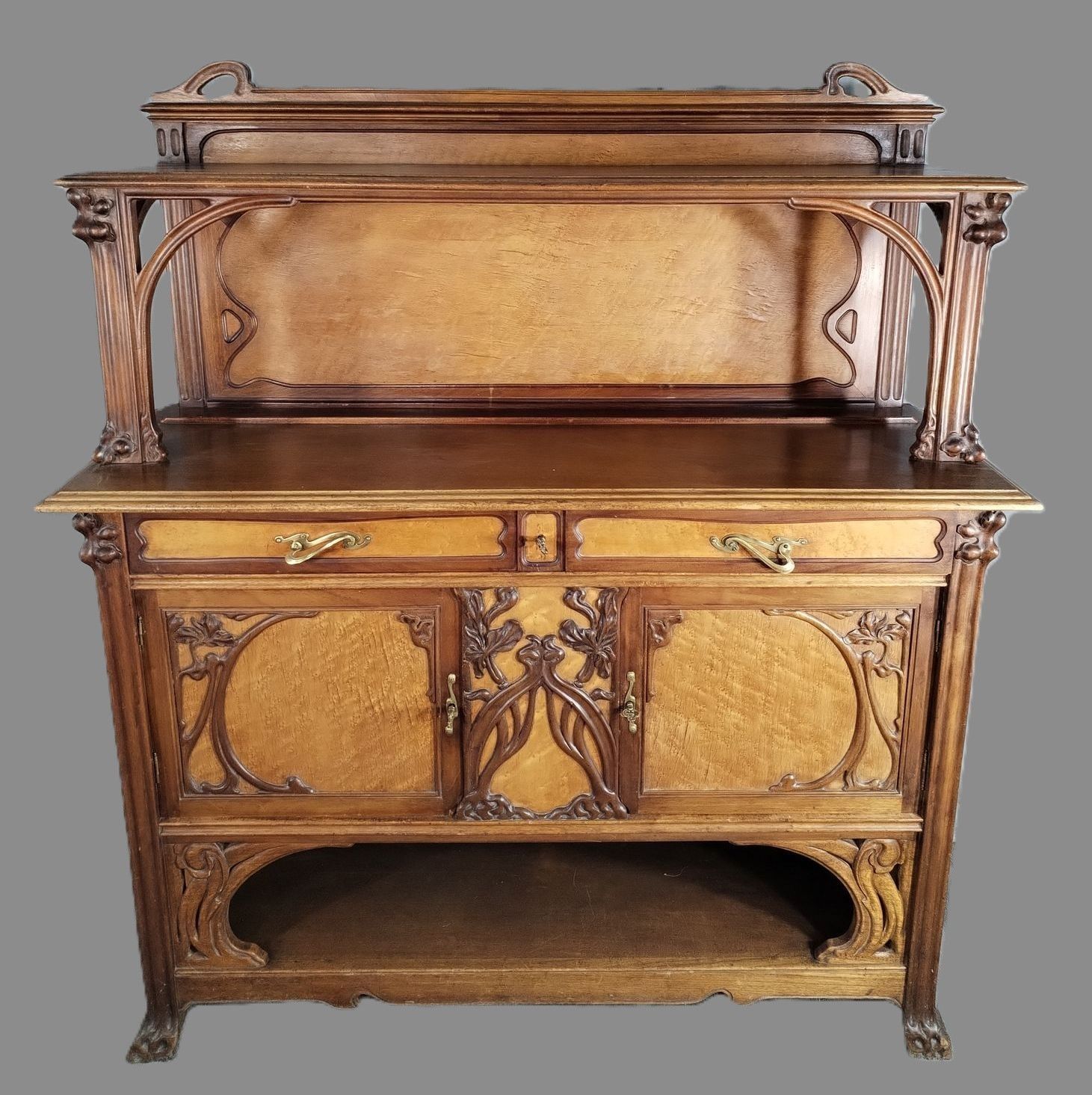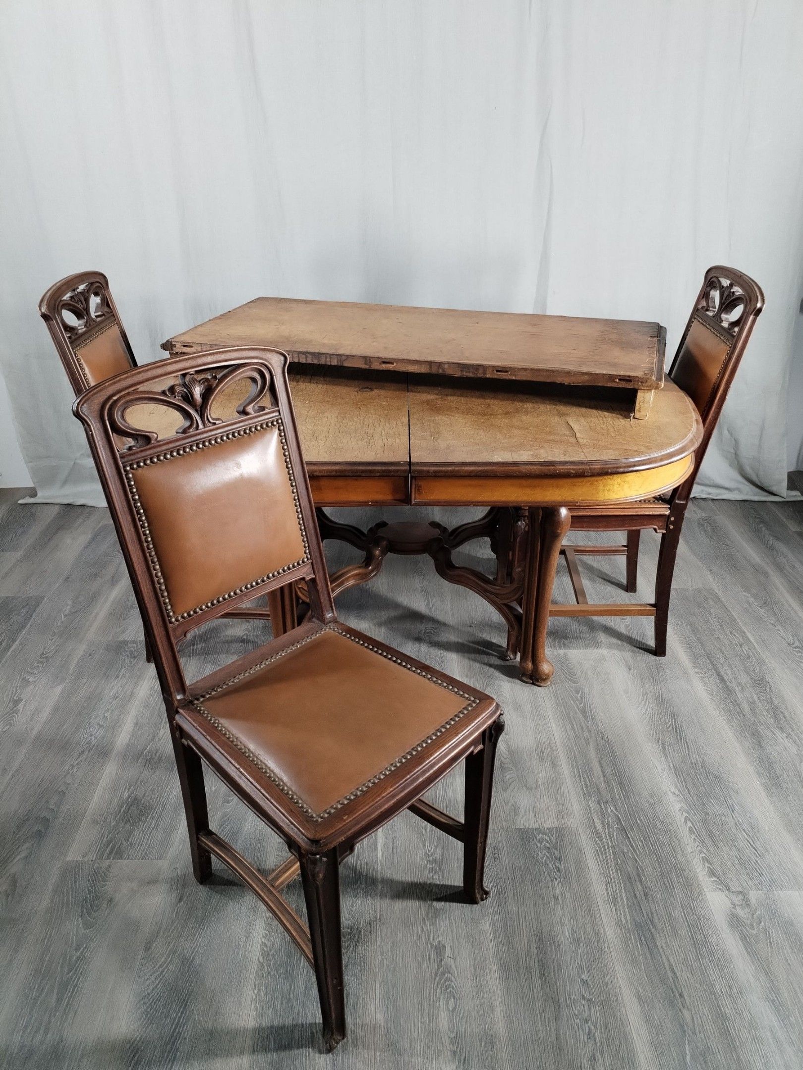 Walnut and ash veneer dining room, decorated with branches and buds. The gilt brass handles are carved with scrolls.