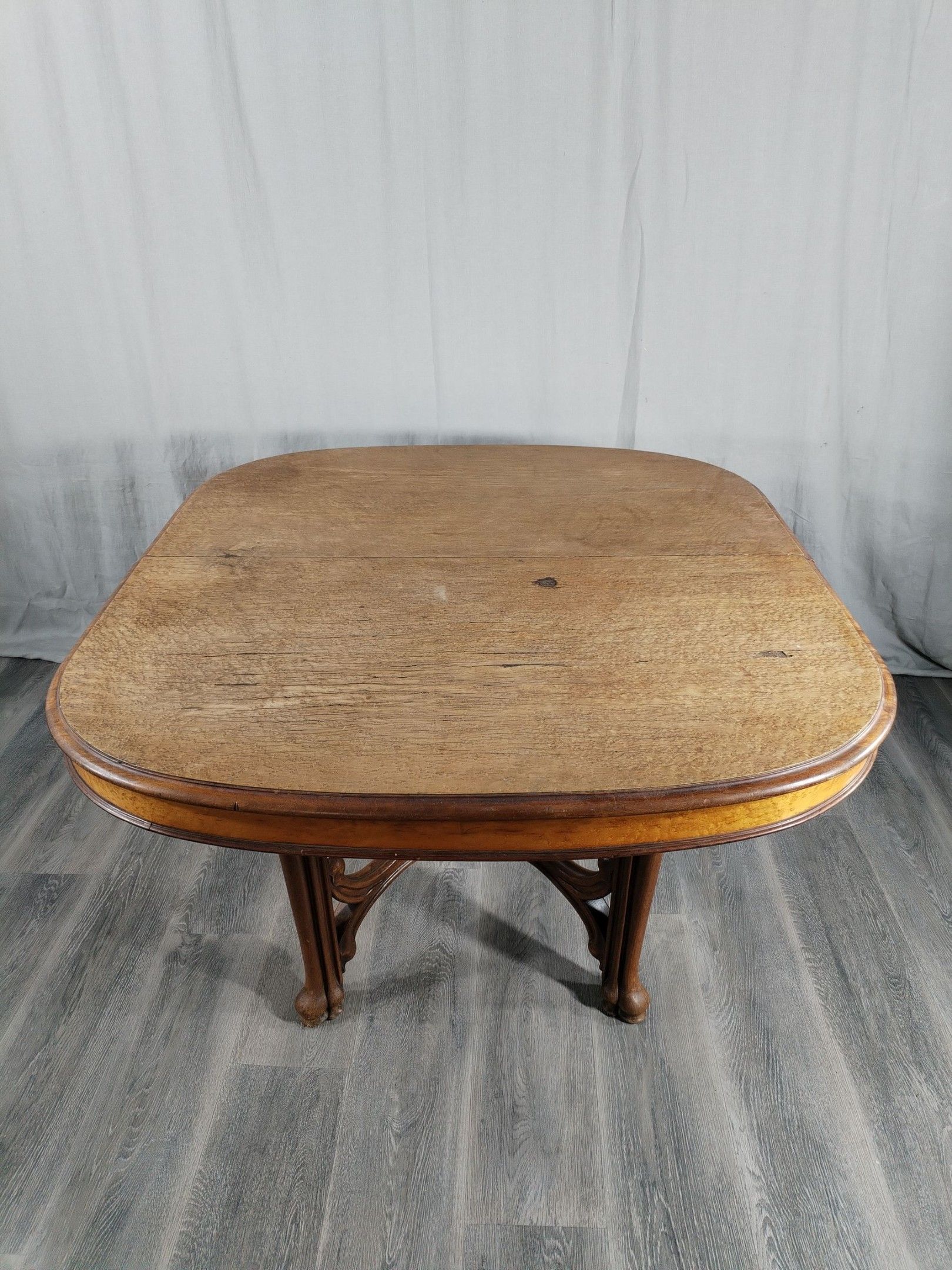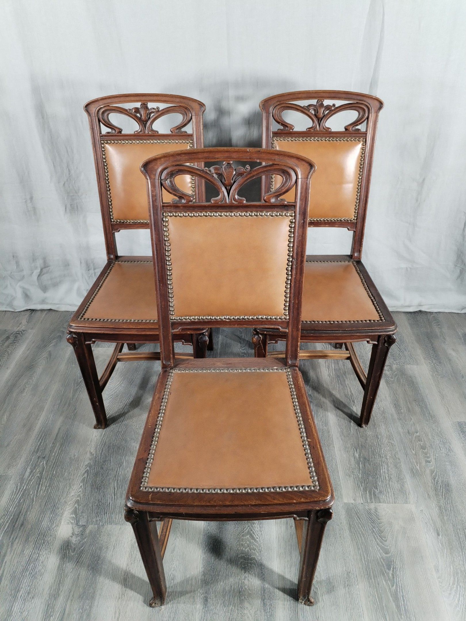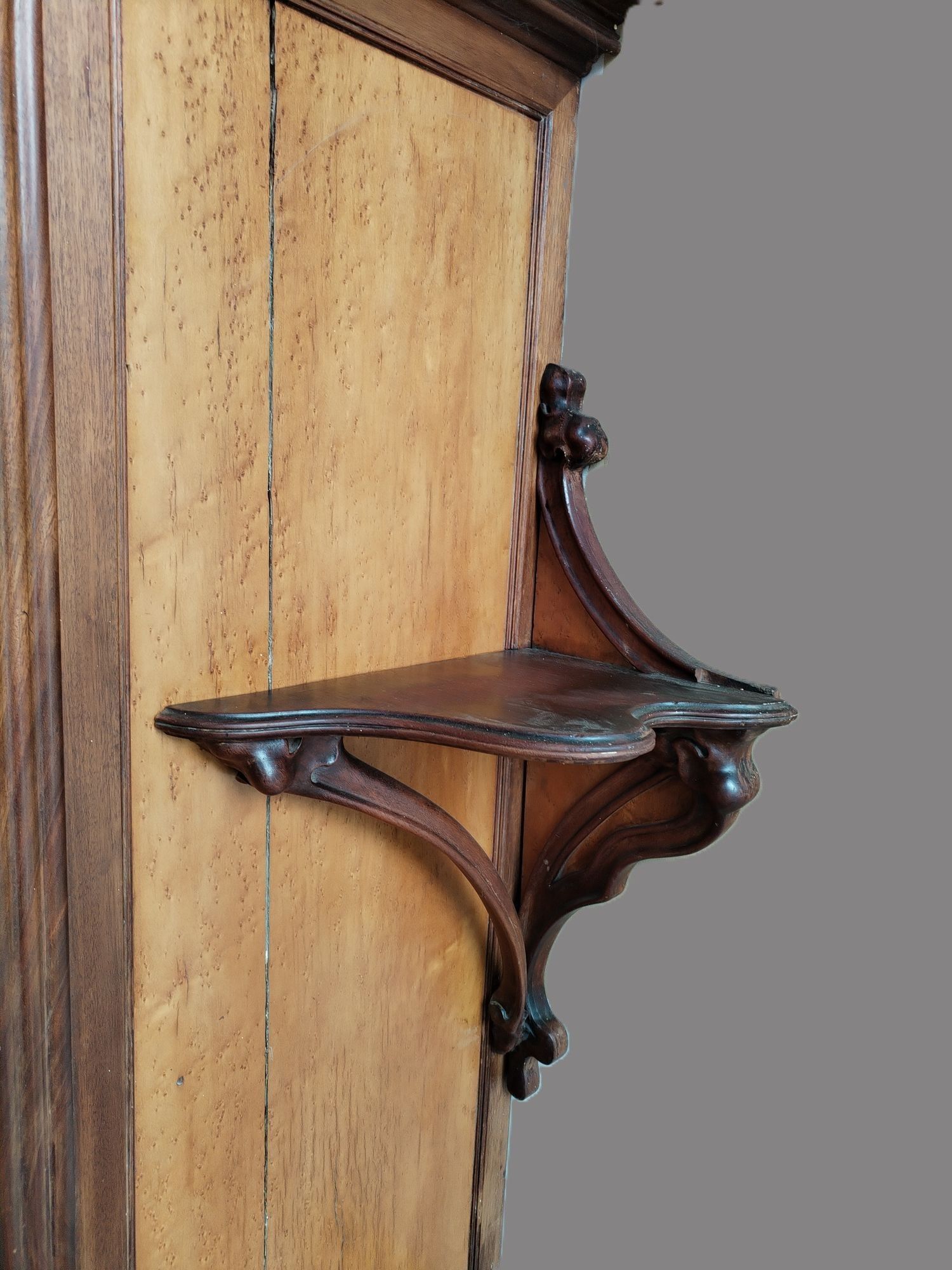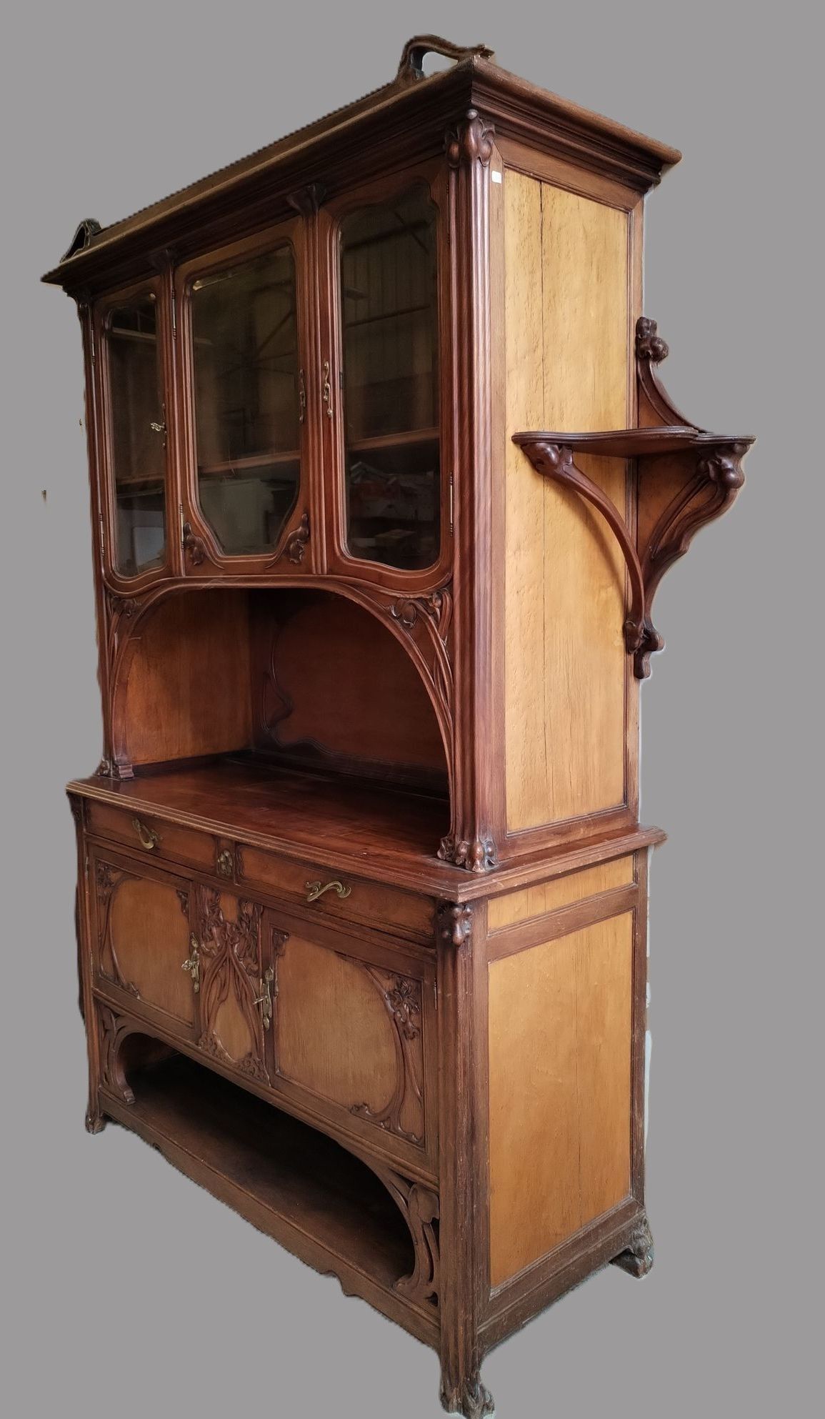 Walnut and ash veneer dining room, decorated with branches and buds. The gilt brass handles are carved with scrolls.