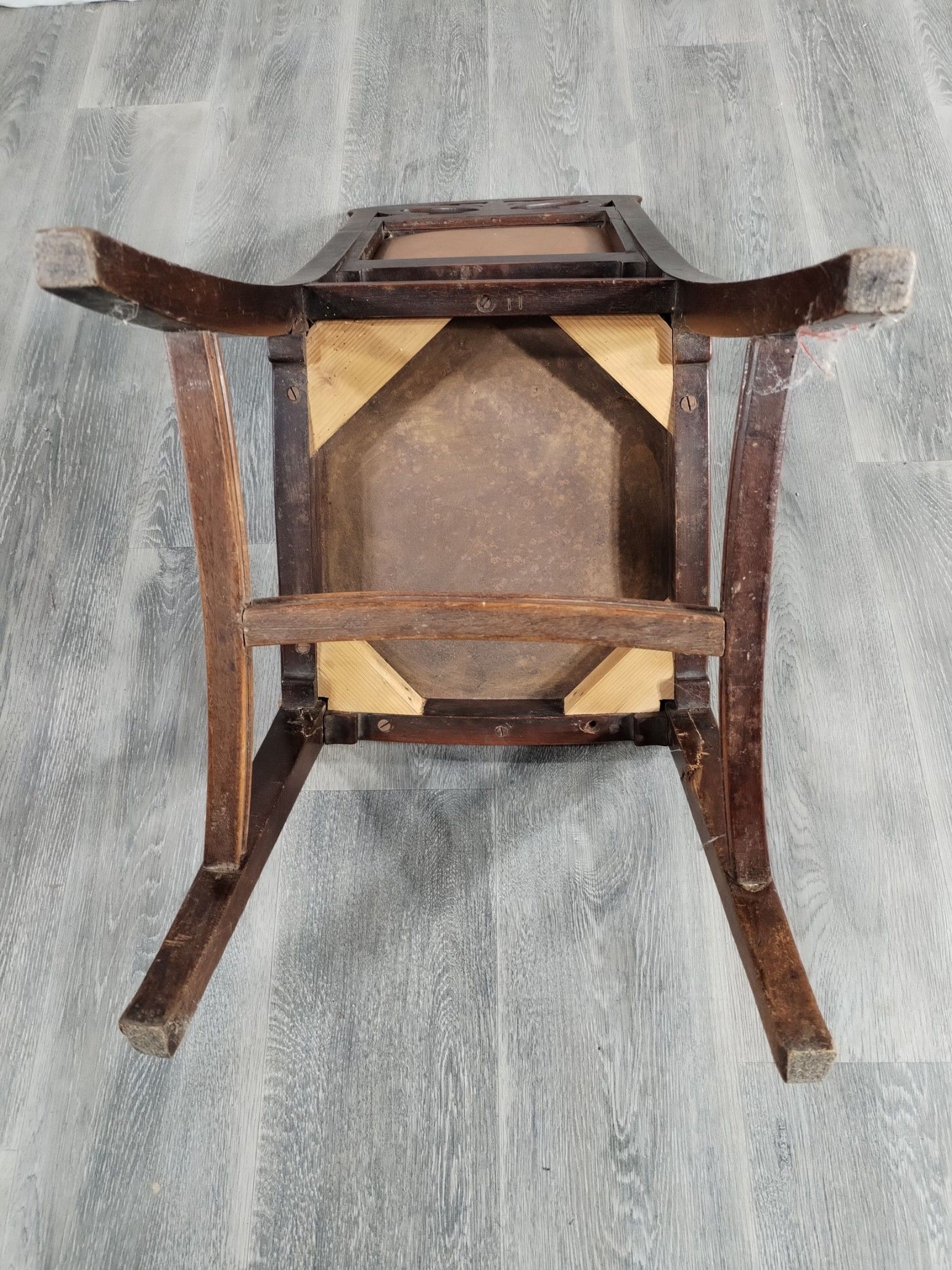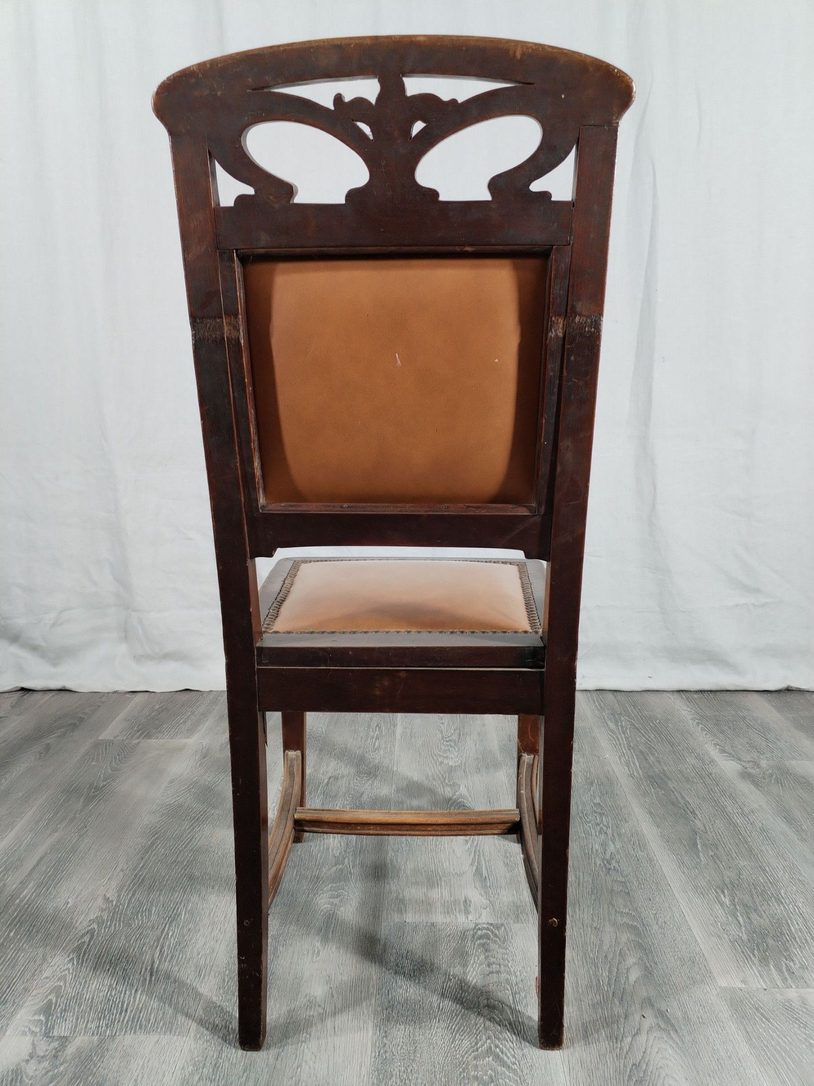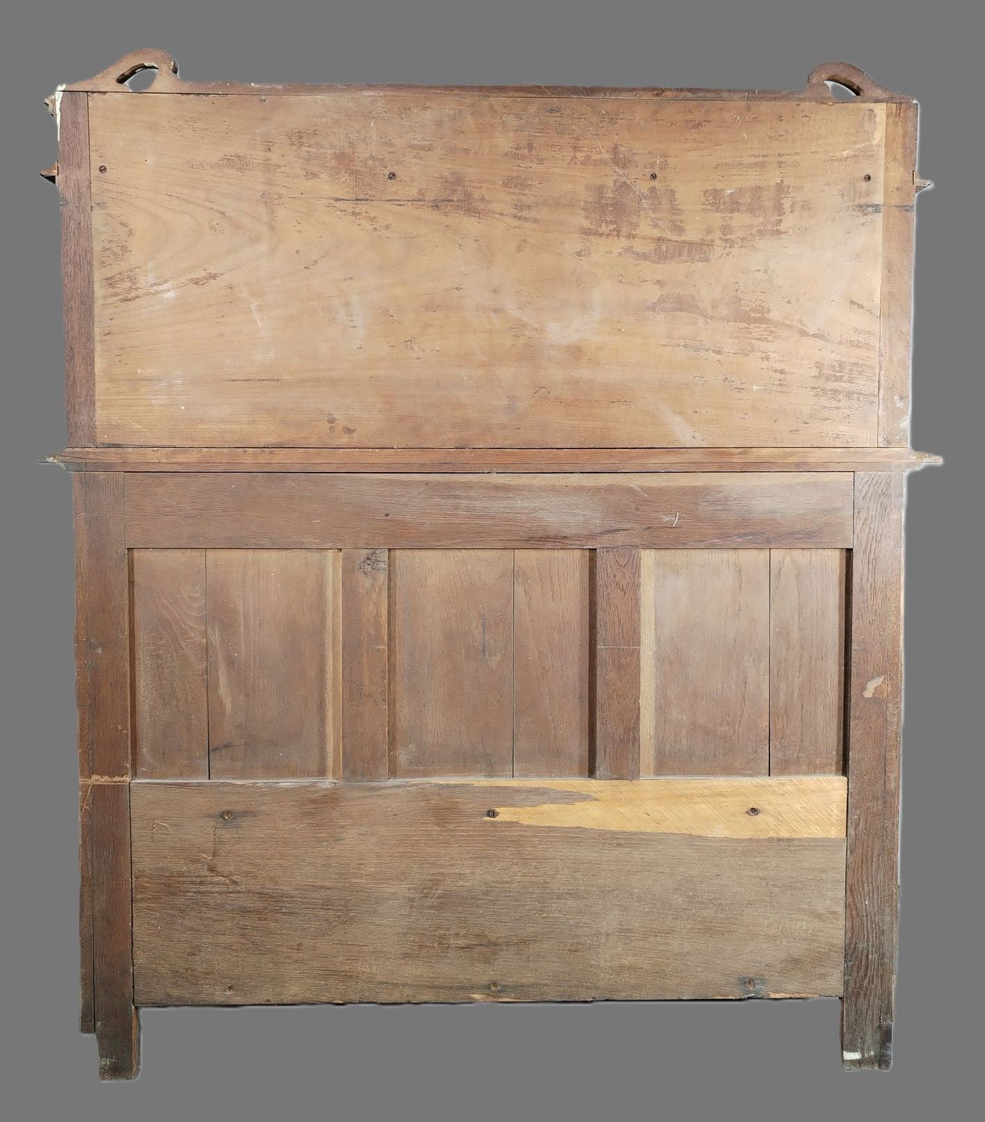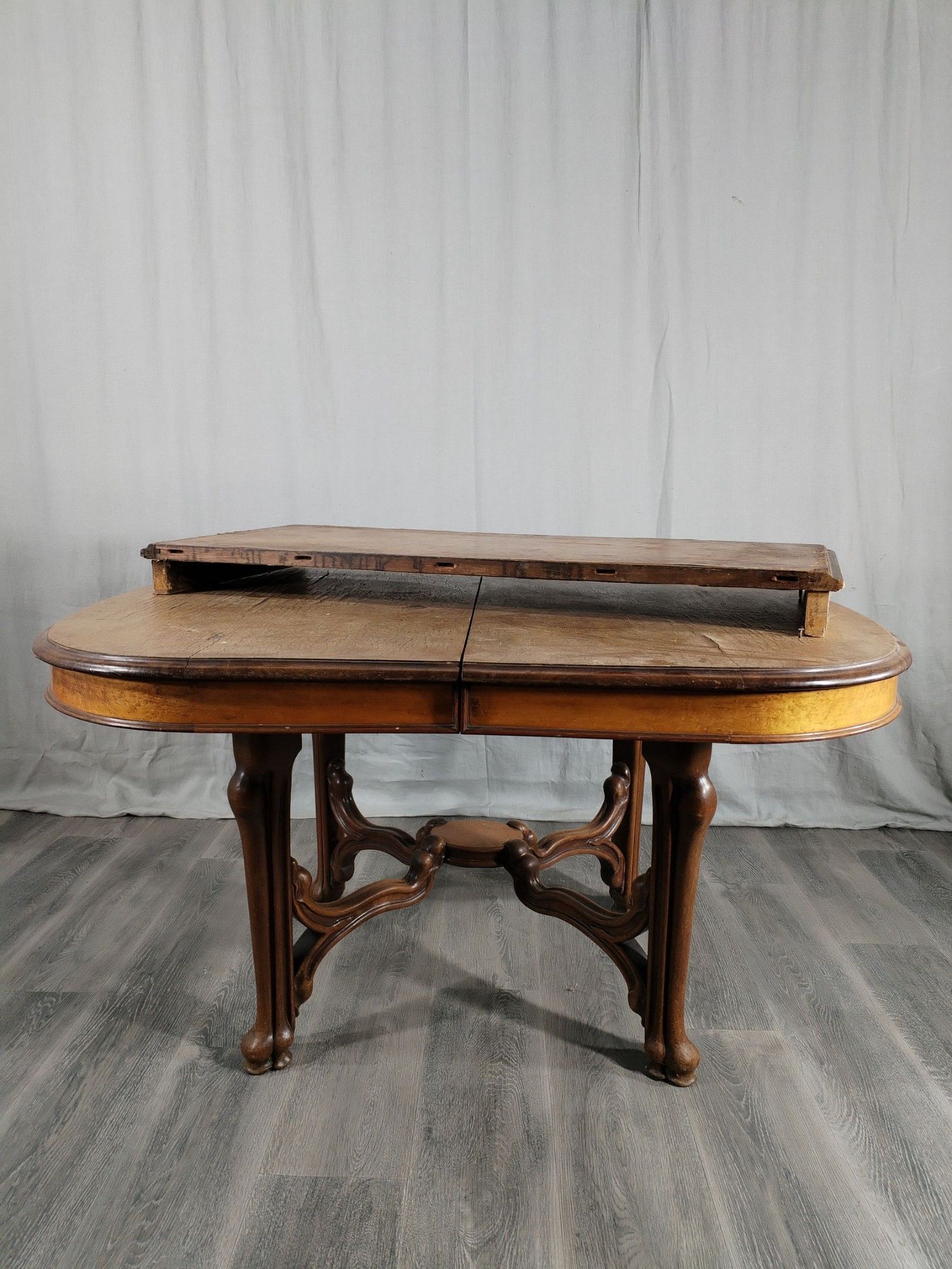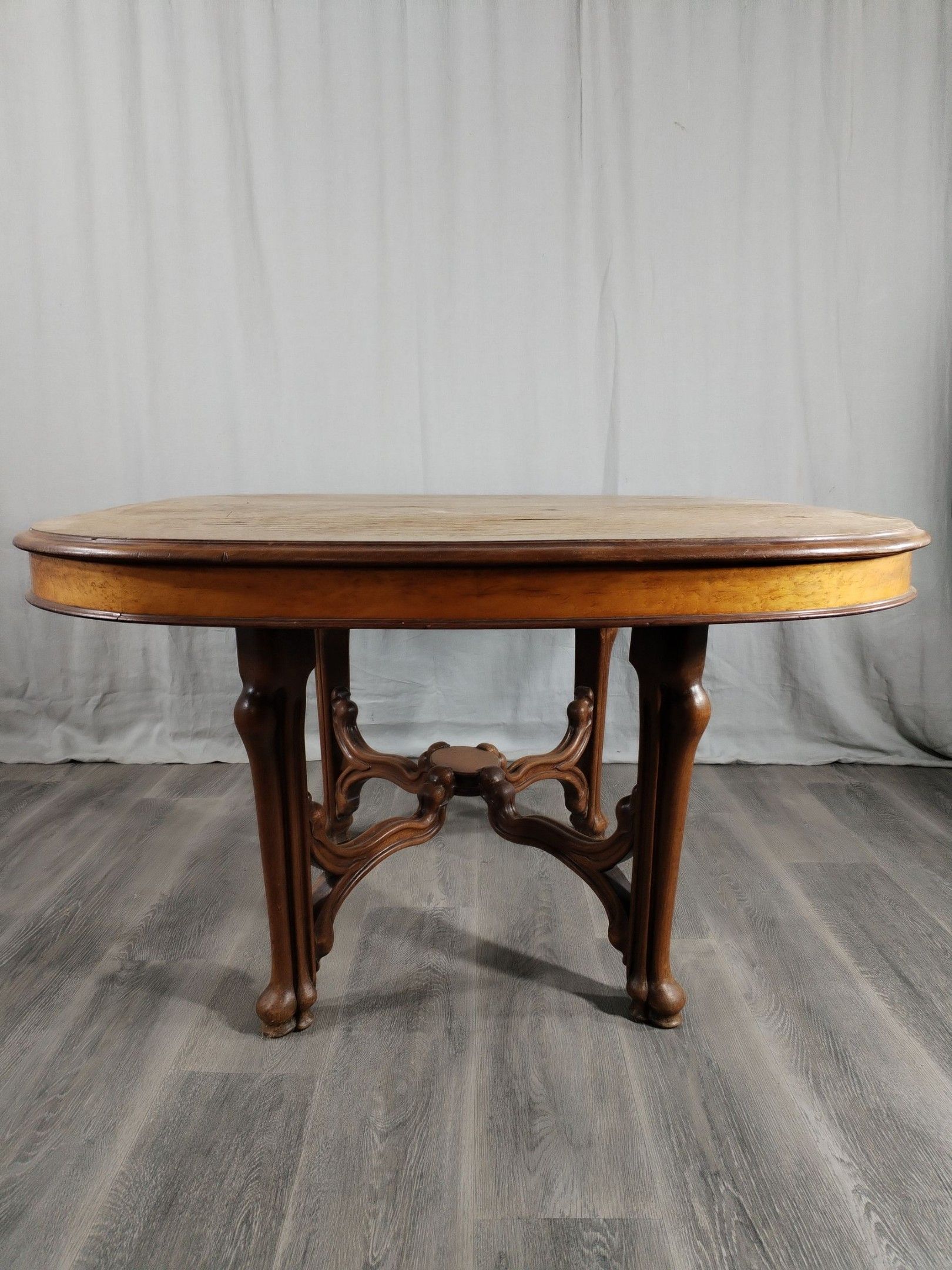 Walnut and ash veneer dining room, decorated with branches and buds. The gilt brass handles are carved with scrolls.