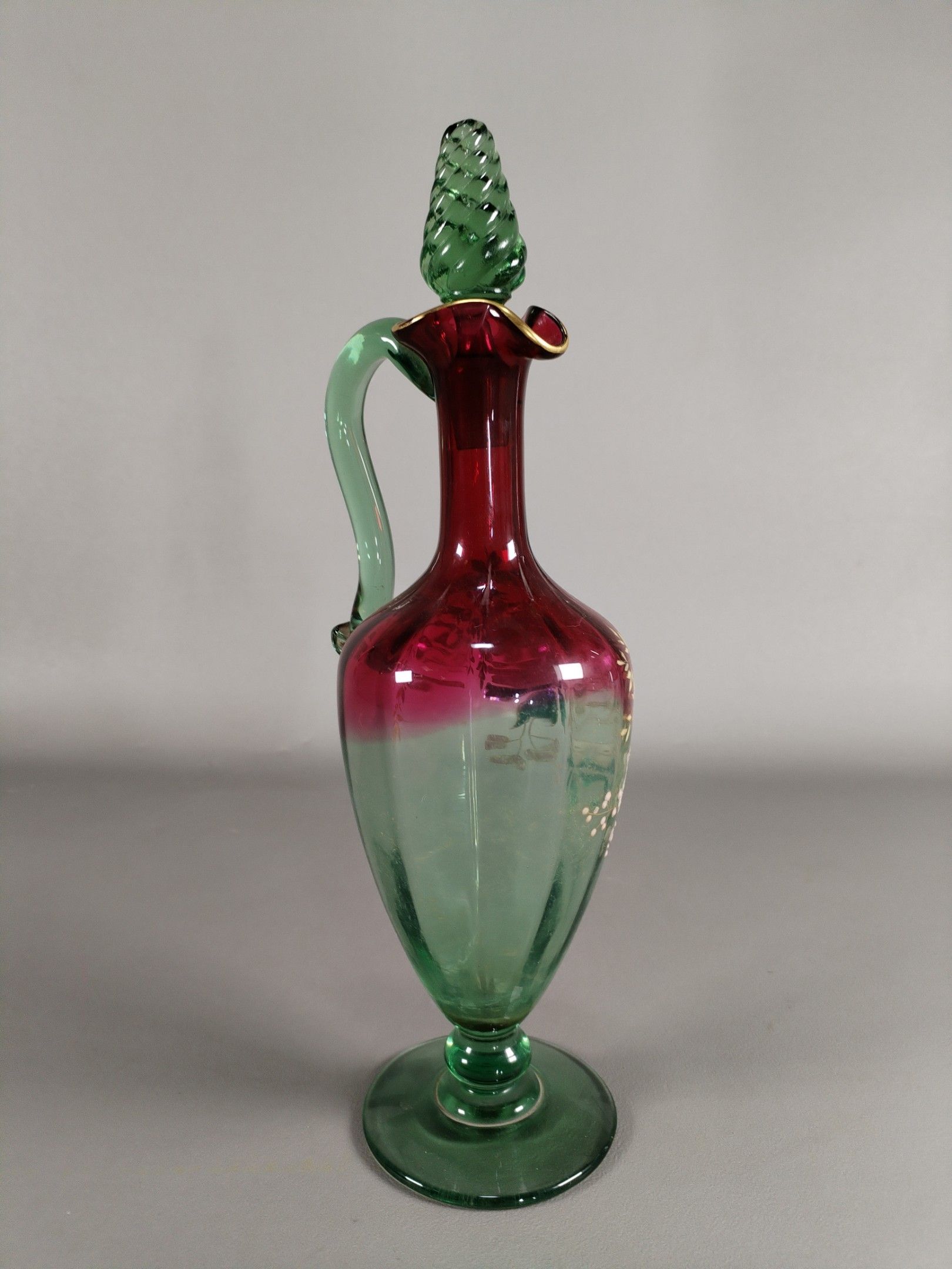 Covered ewer in red and blue tinted glass with enamelled dec…