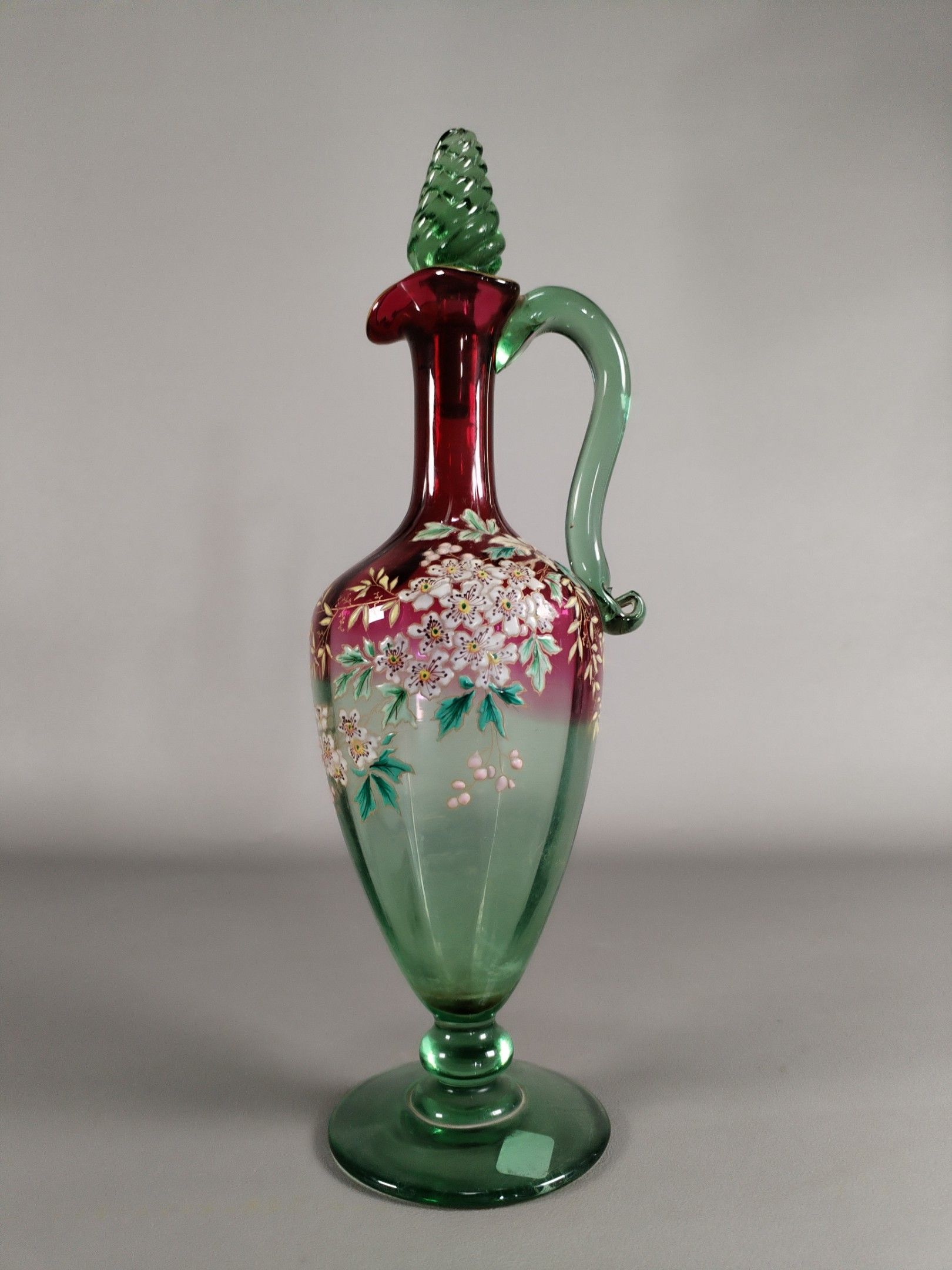Covered ewer in red and blue tinted glass with enamelled decoration of white flowers.