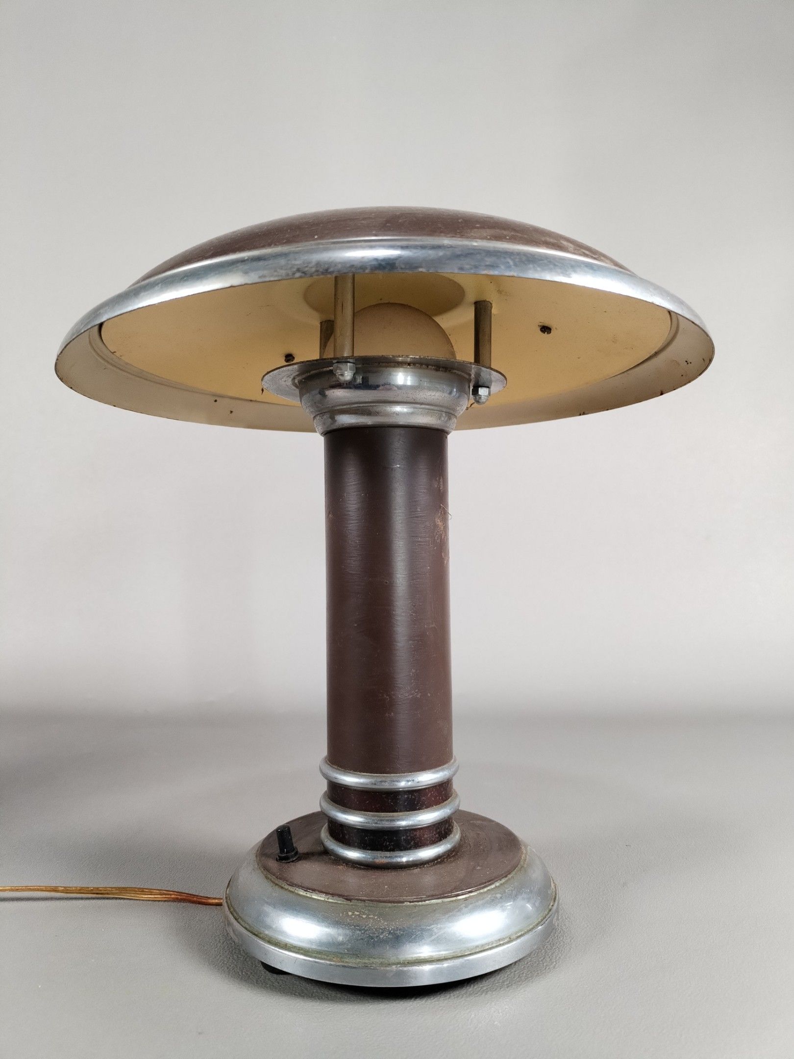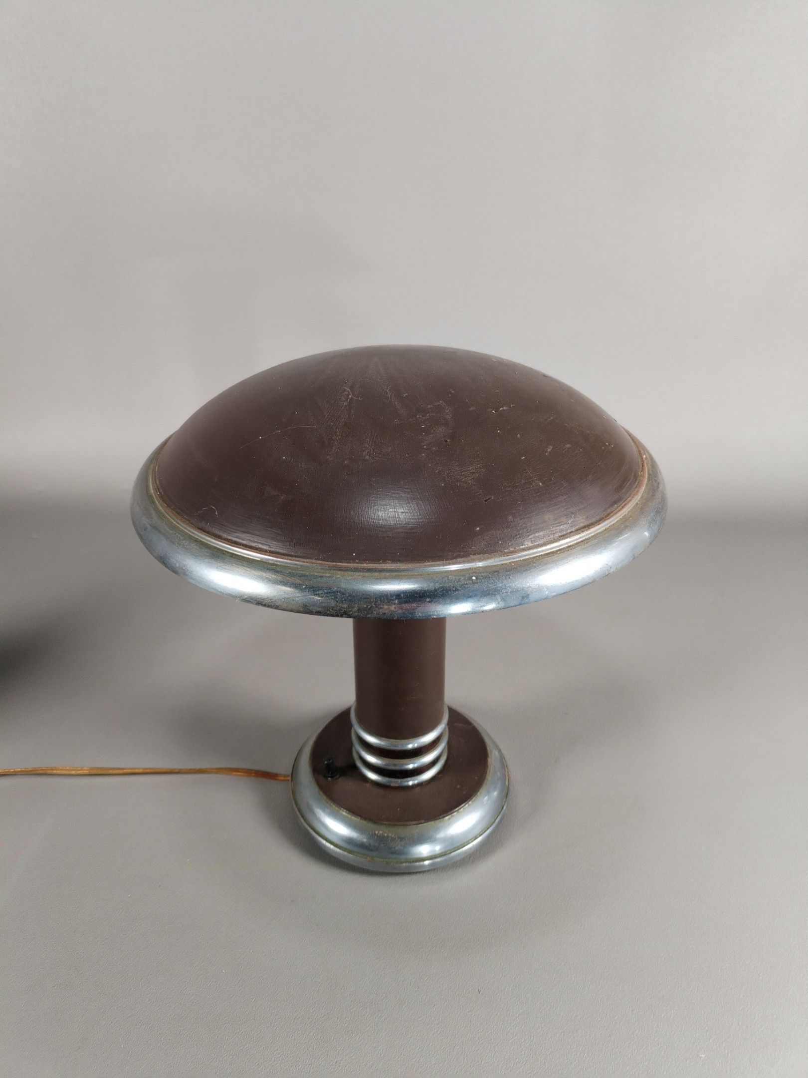 Mushroom-shaped desk lamp in aluminium and lacquered iron.