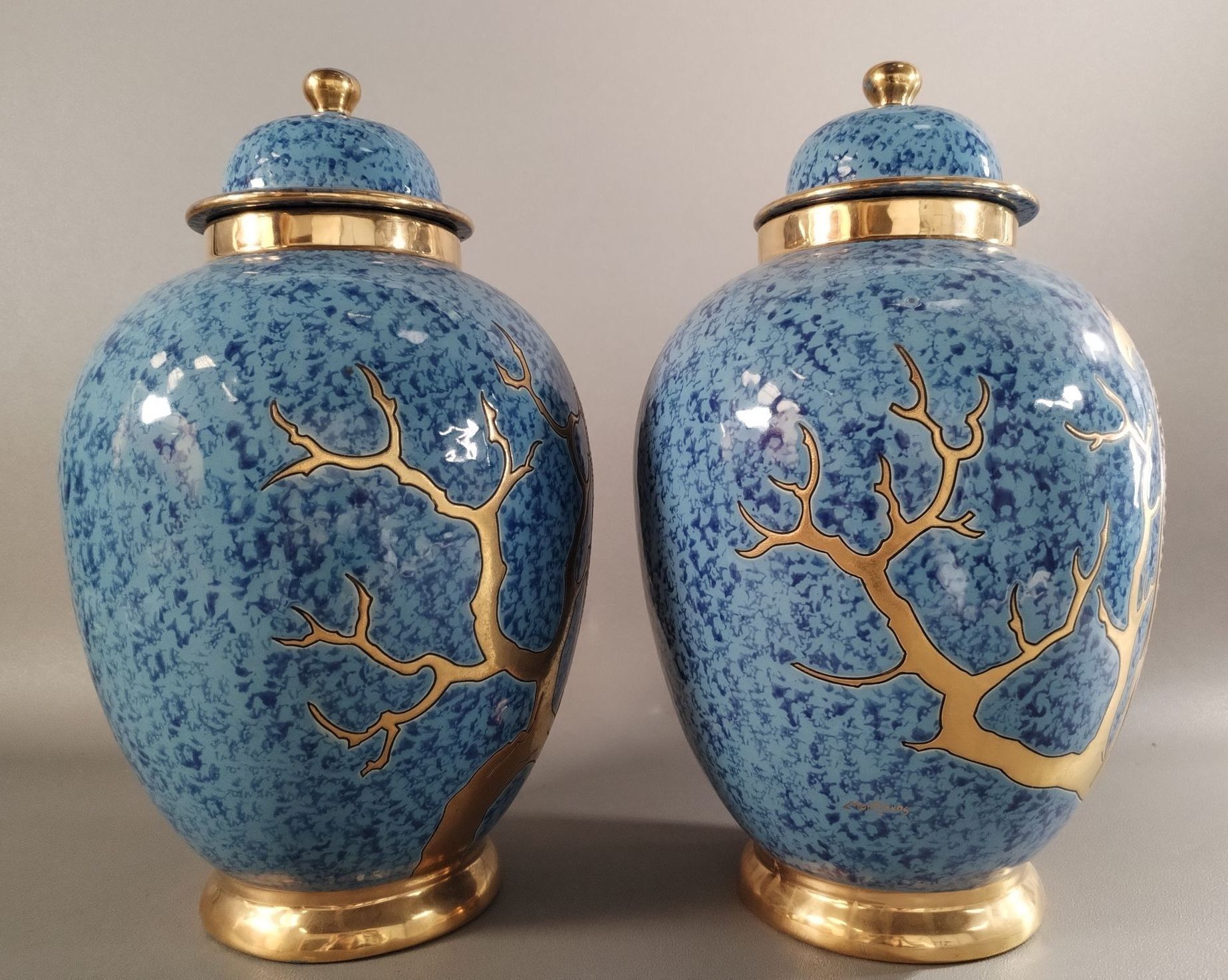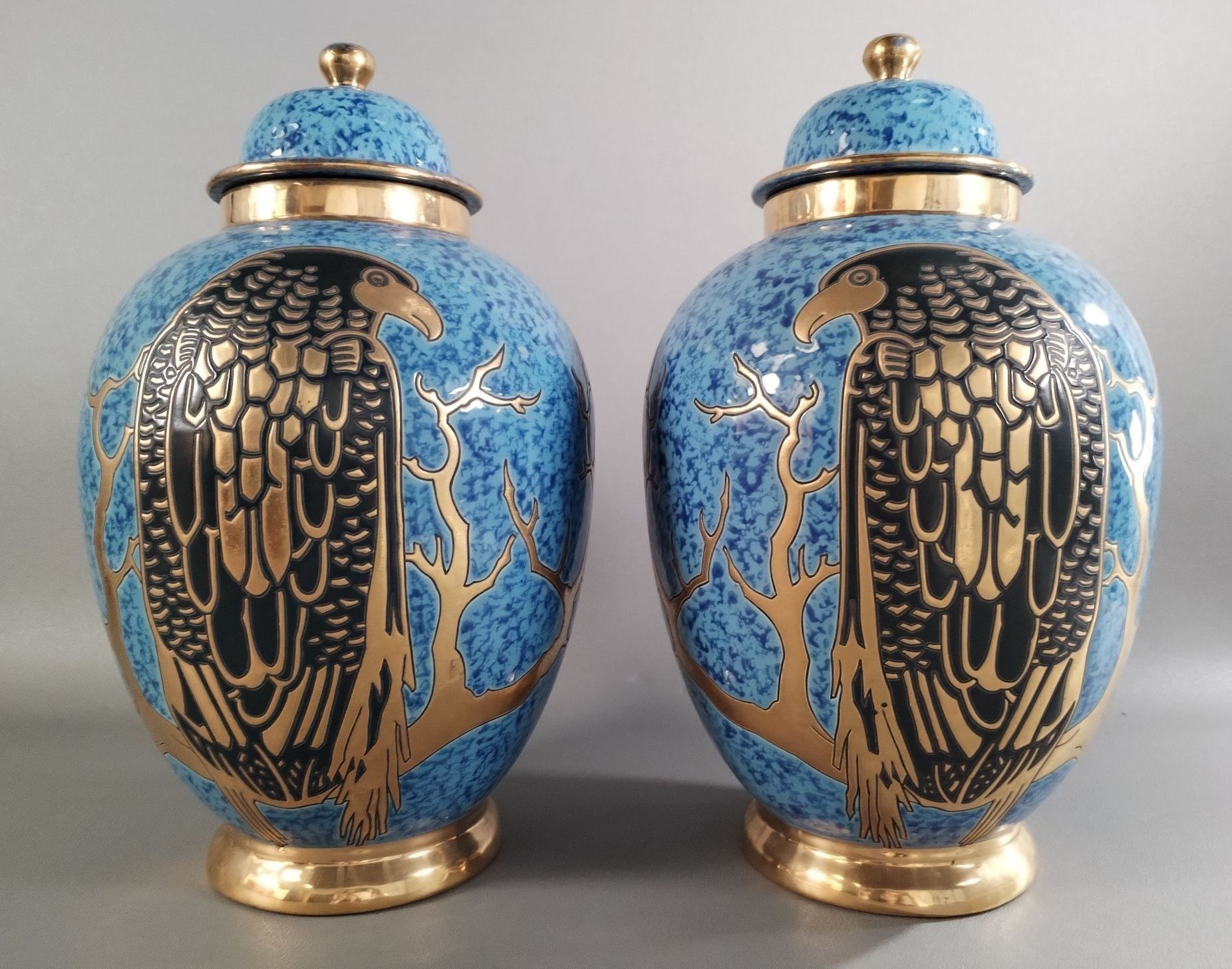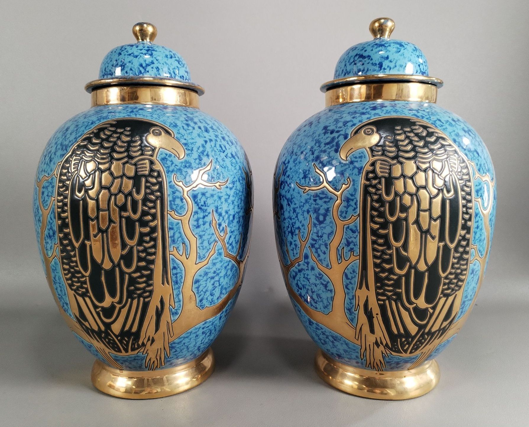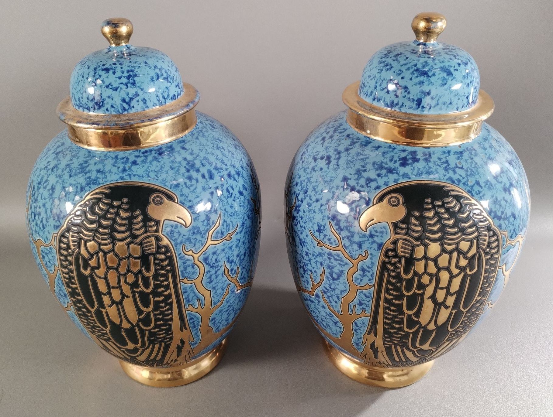 A pair of covered earthenware vases decorated with parrots in black and gold enamel on a marbled blue background. Model by ARNOUX, MONTIERES factory - Art Deco period.
