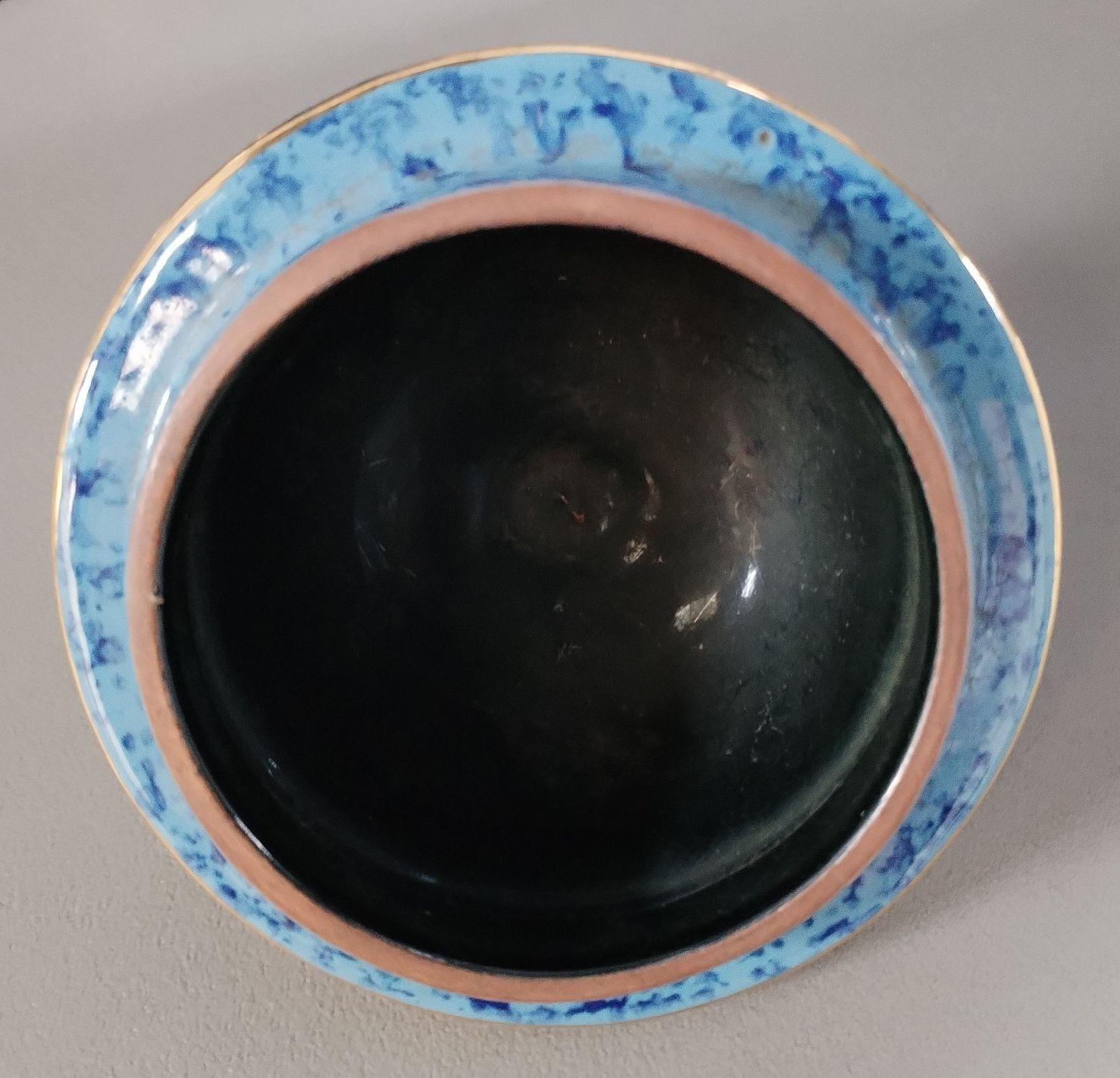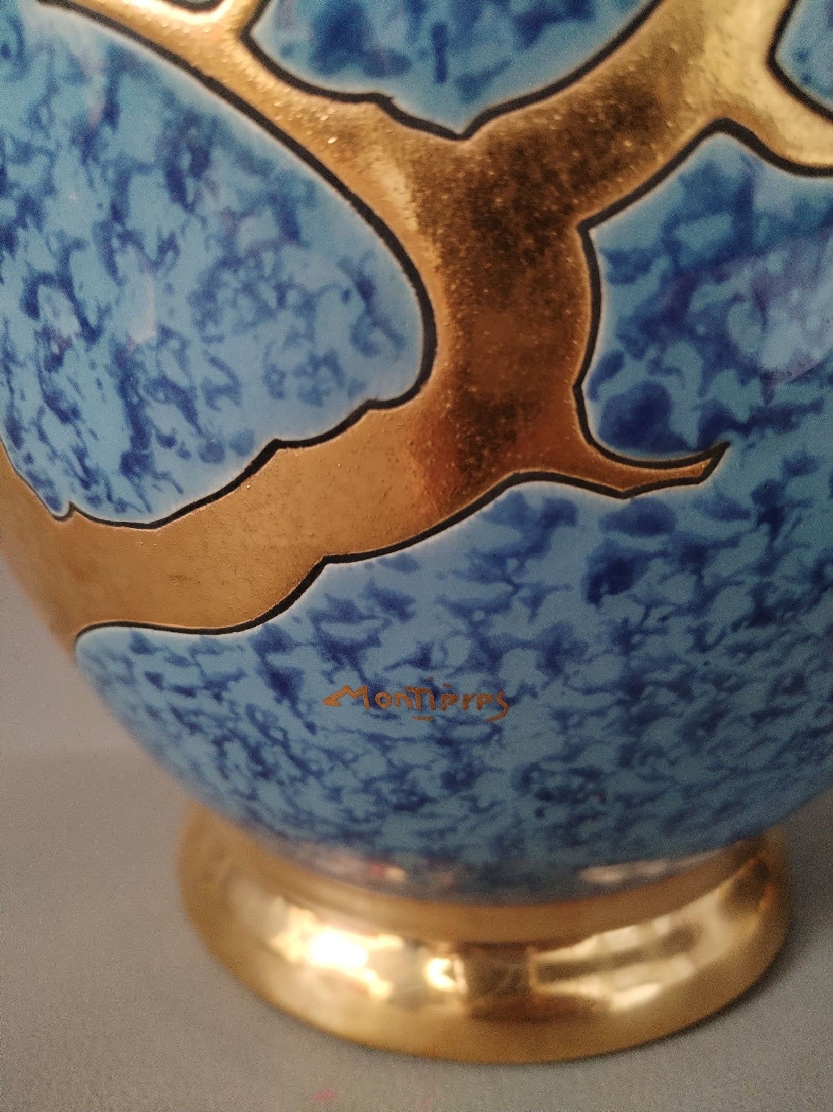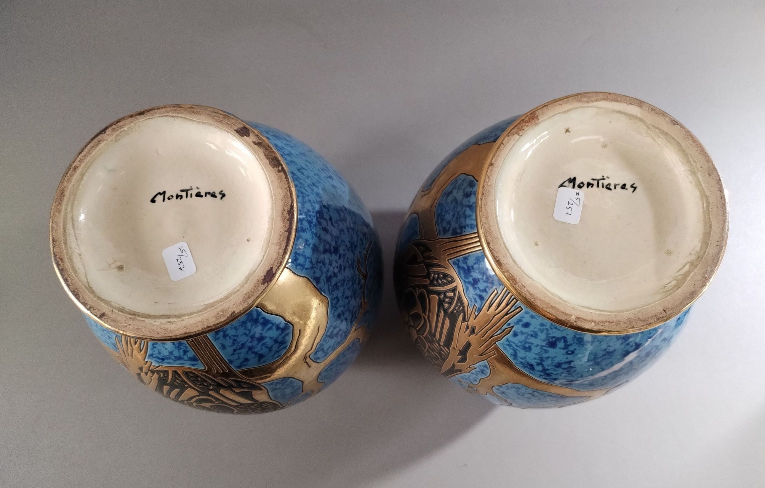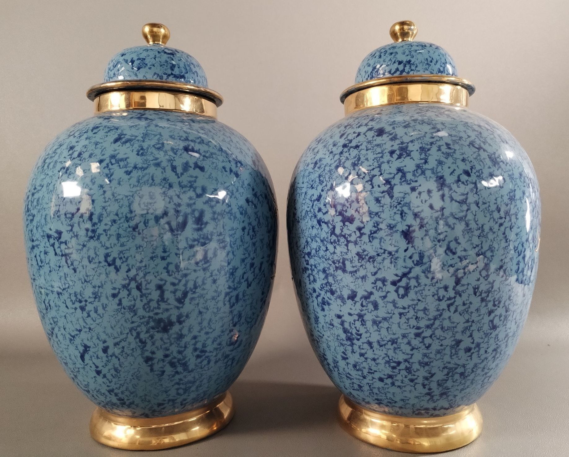 A pair of covered earthenware vases decorated with parrots in black and gold enamel on a marbled blue background. Model by ARNOUX, MONTIERES factory - Art Deco period.