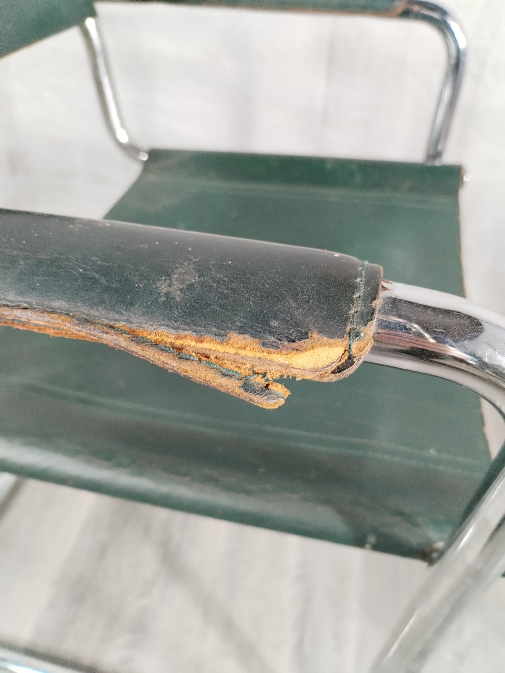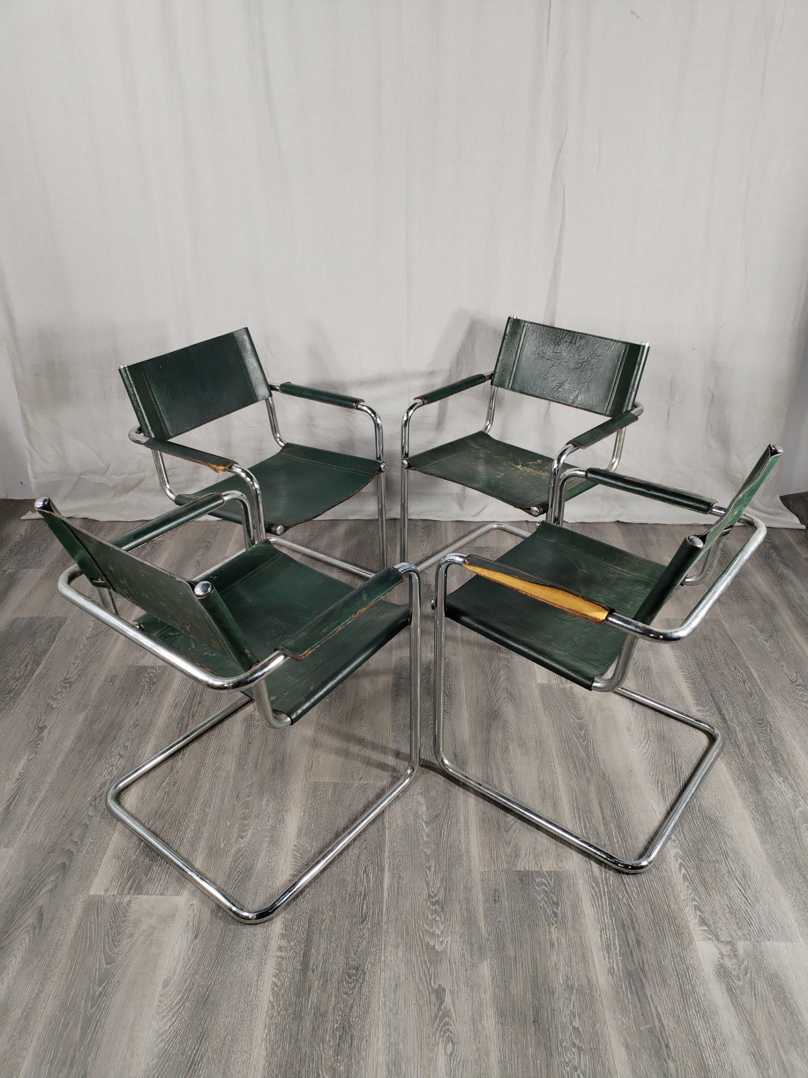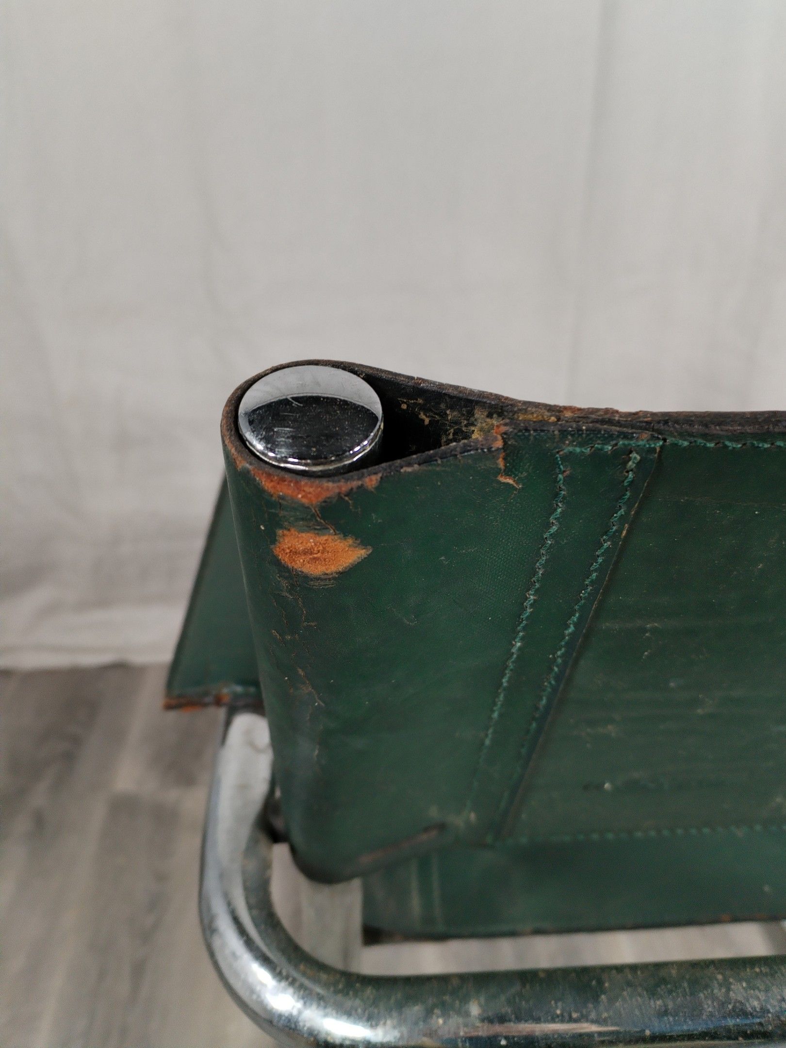 Suite of 4 chromed iron armchairs with saddle-stitched green leather upholstery.