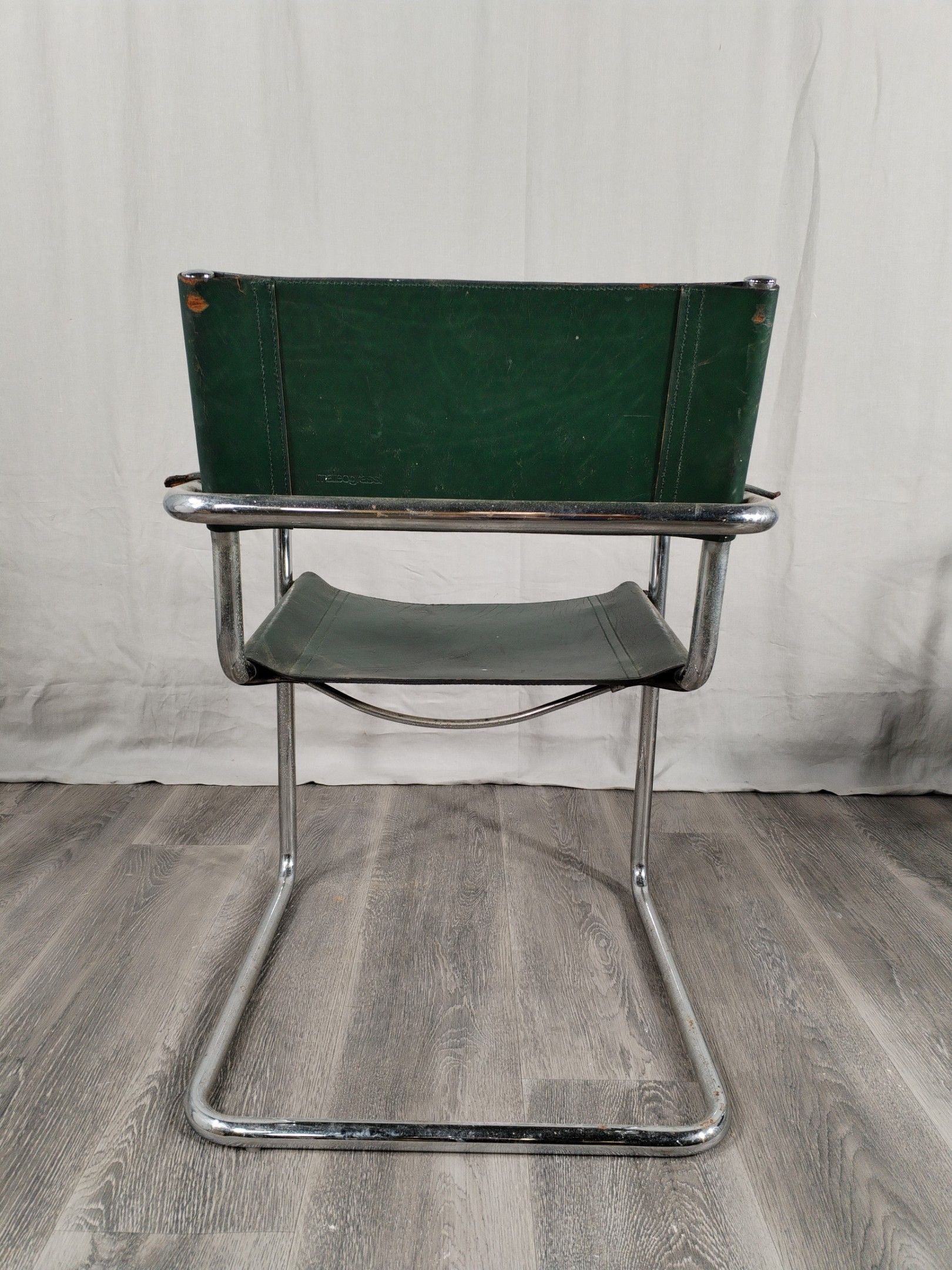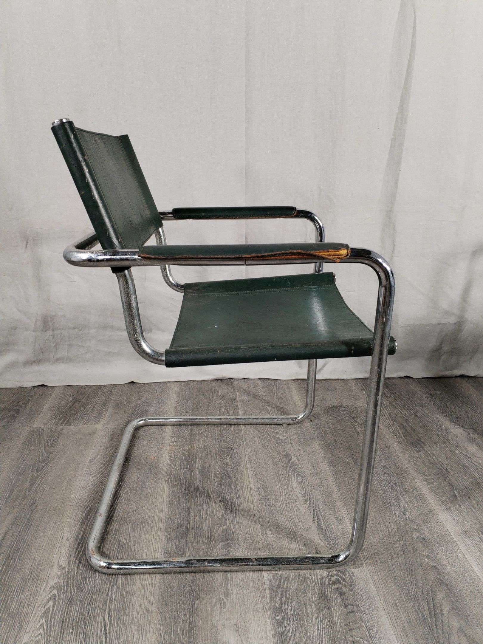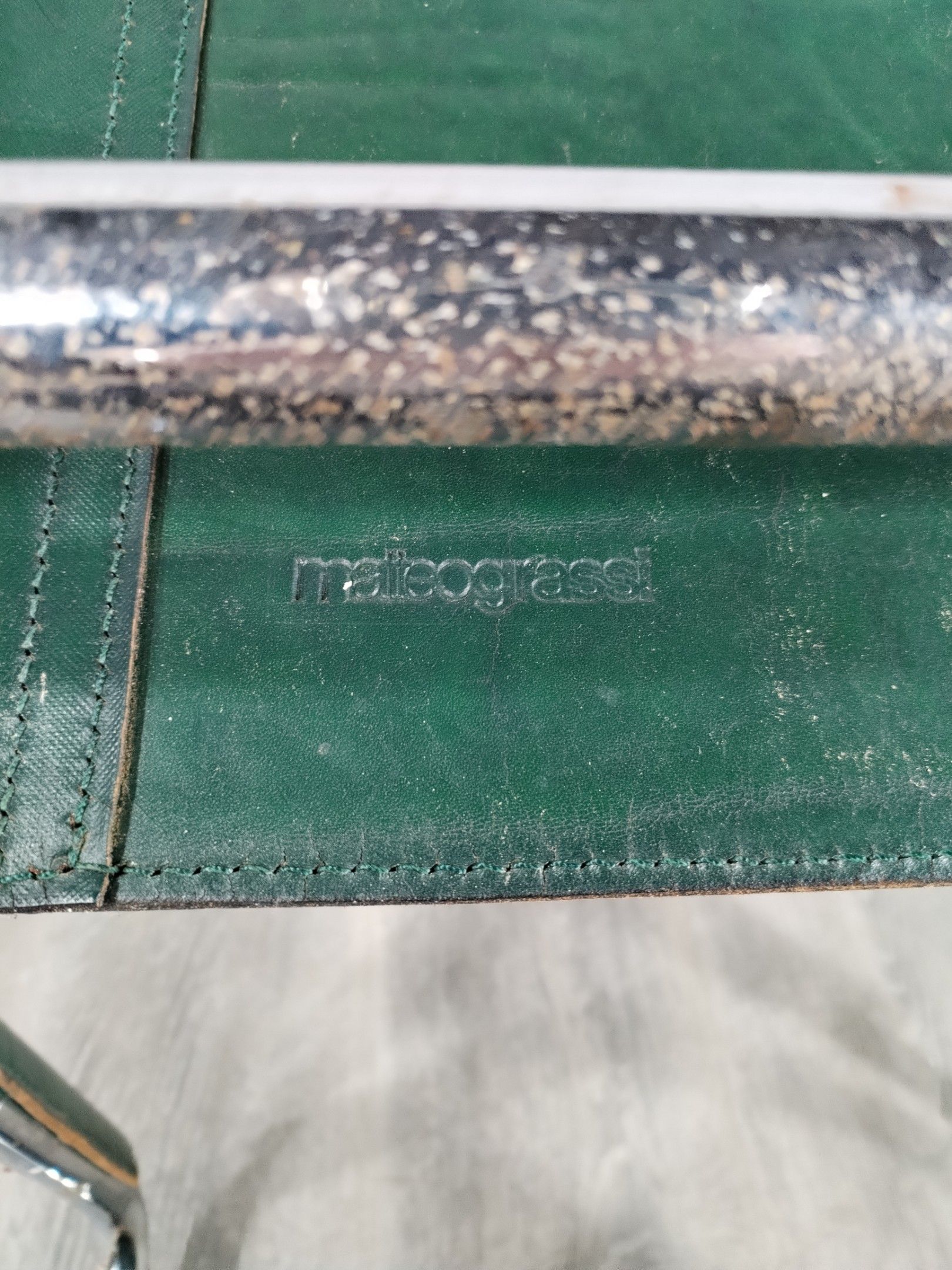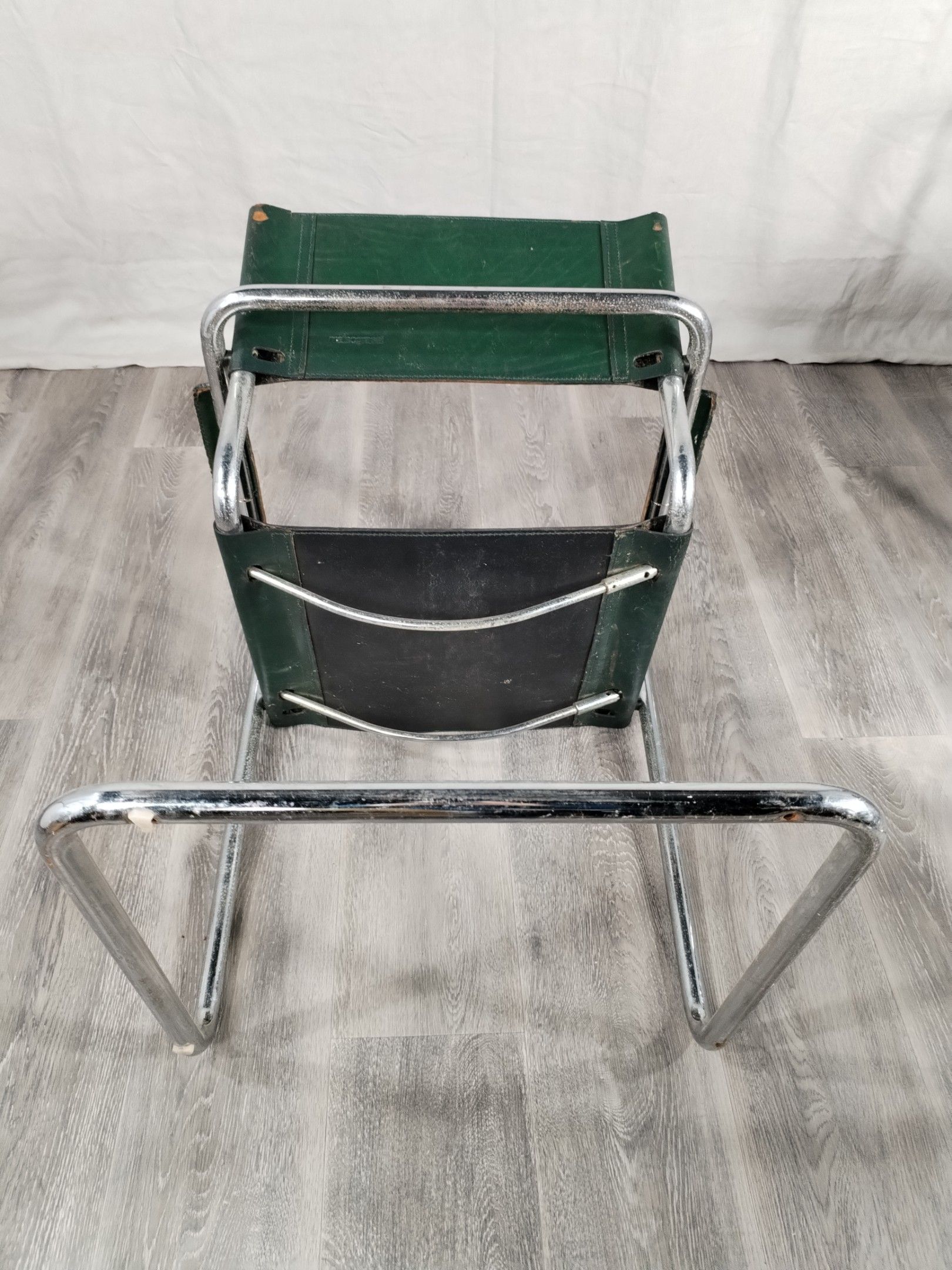 Suite of 4 chromed iron armchairs with saddle-stitched green leather upholstery.